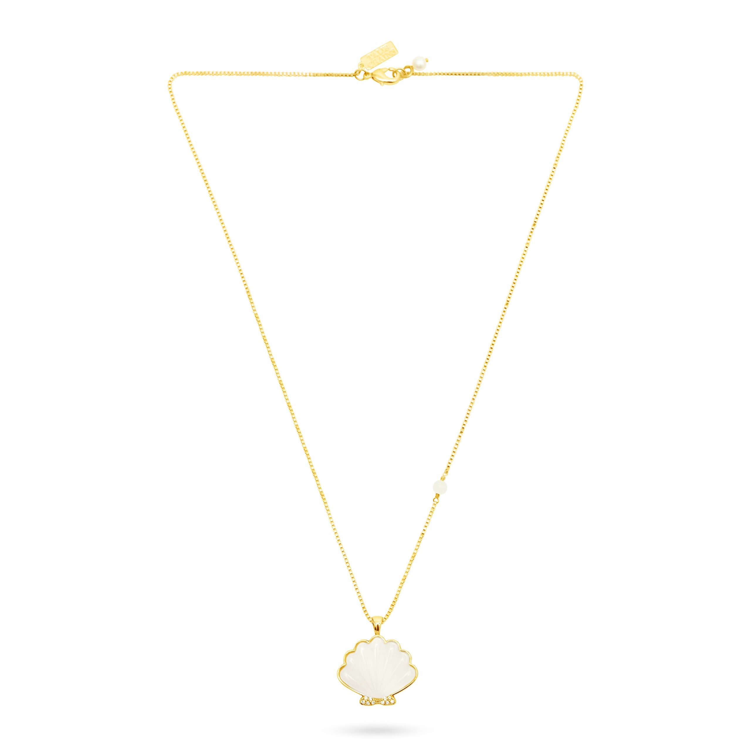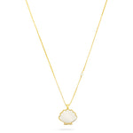 The Shell Pendant Necklace is designed for effortless styling. Featuring a semi-precious stone shell set in a gold vessel with cubic zirconia accents, it can be worn alone or layered for added dimension. Style with open necklines or fluid fabrics to highlight its organic form; an easy, elevated piece for spring and beyond.