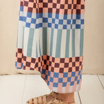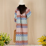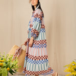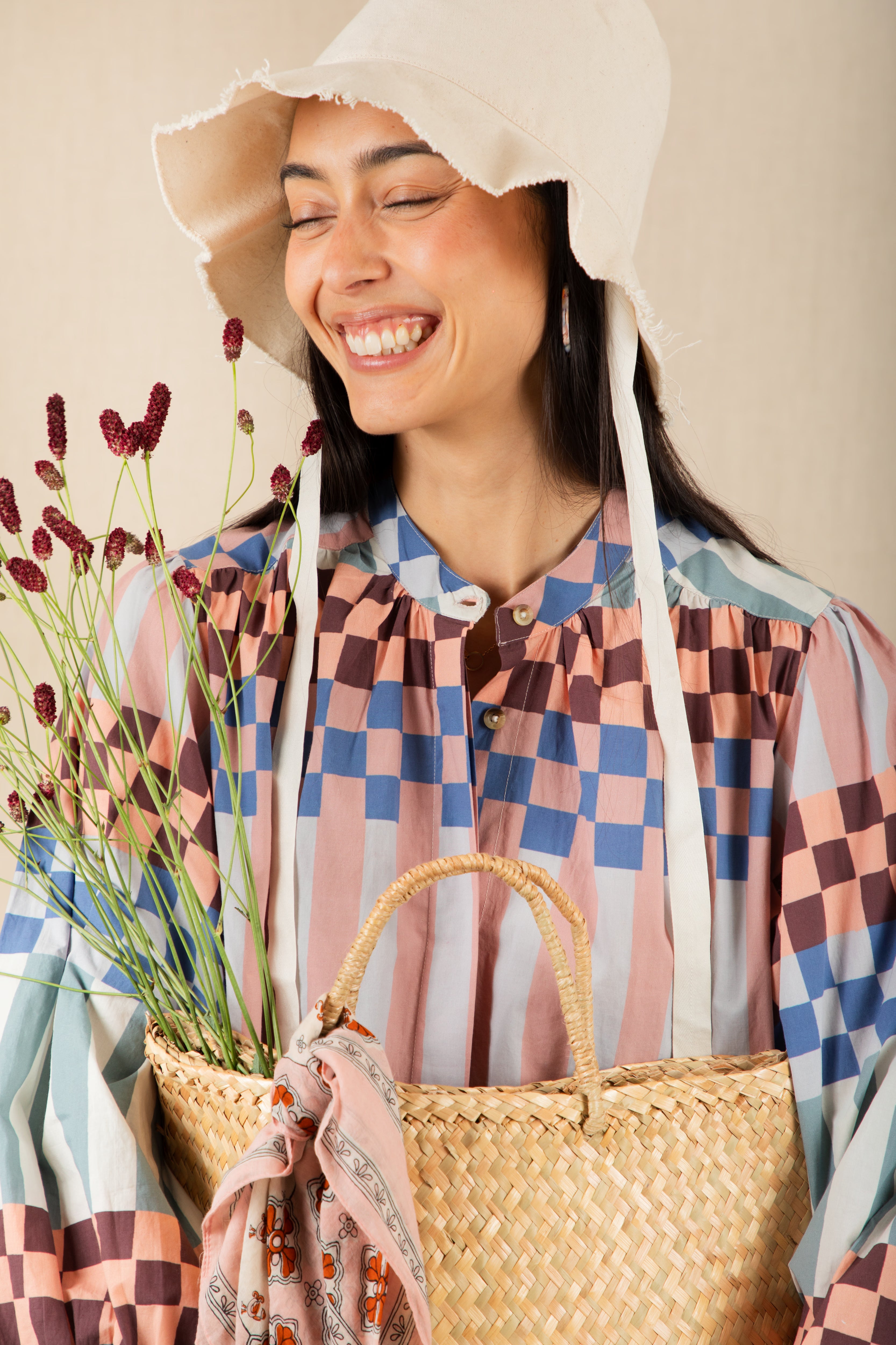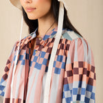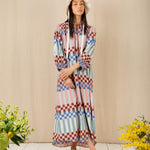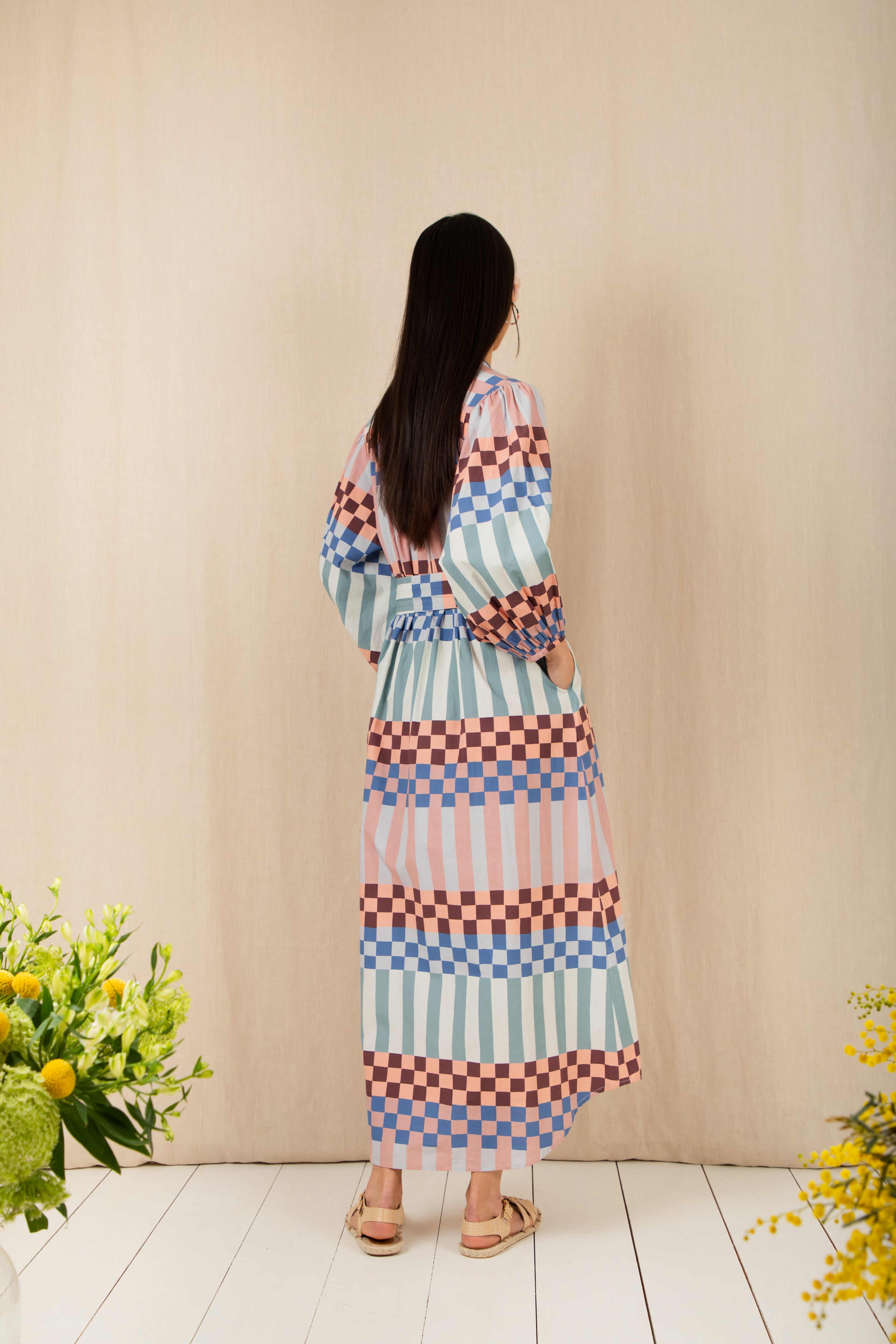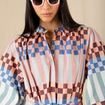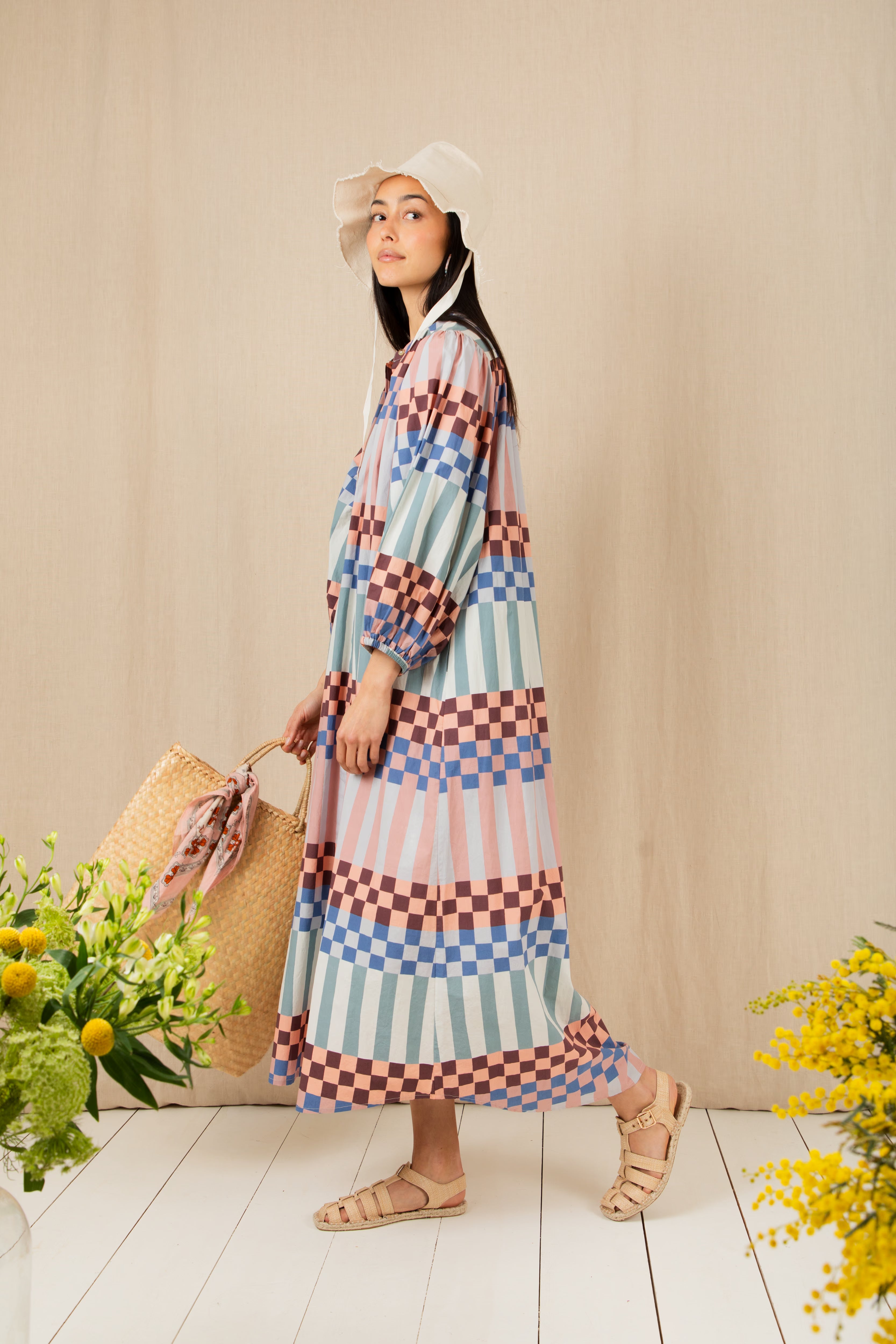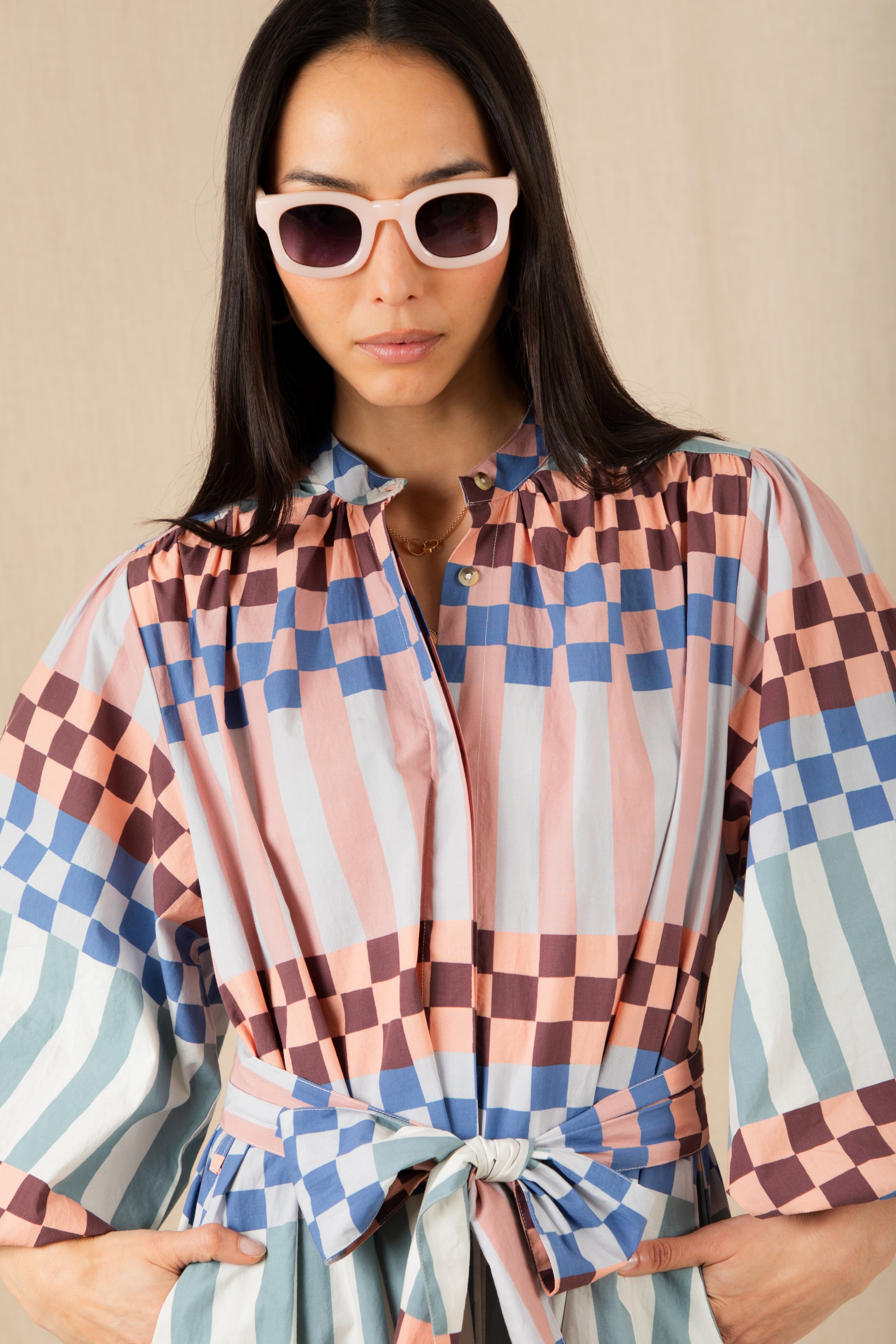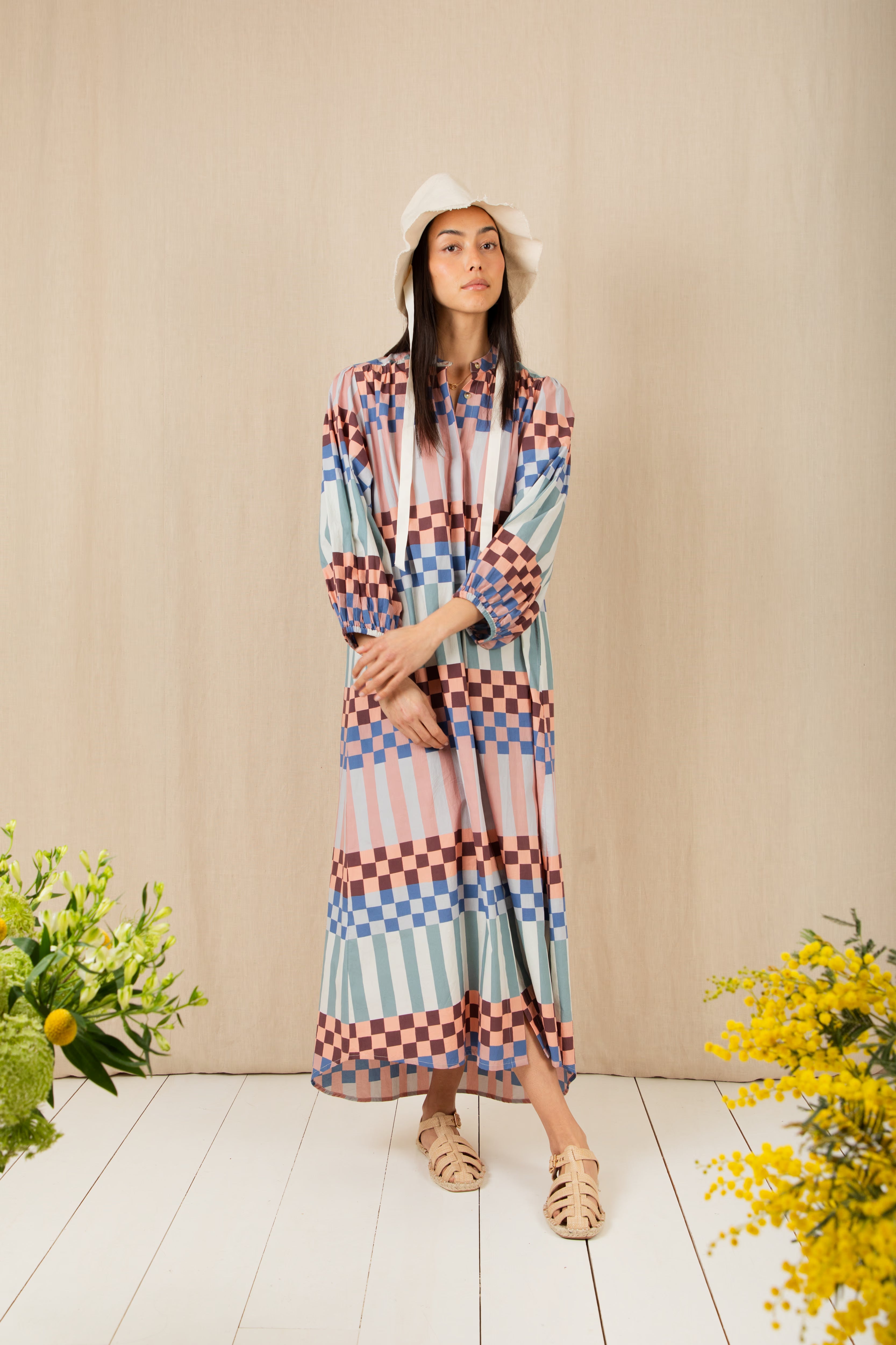An oversized, modern maxi shirt-style dress with a lot of volume. The neckline has a small stand with delicate gathers around the neck. The style is button through with a curved high-low hem detail and side seam pockets and the 3/4 sleeves are voluminous with an elasticated cuff.  Comes in a wow statement print on cotton poplin.