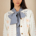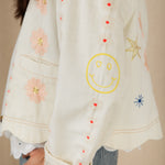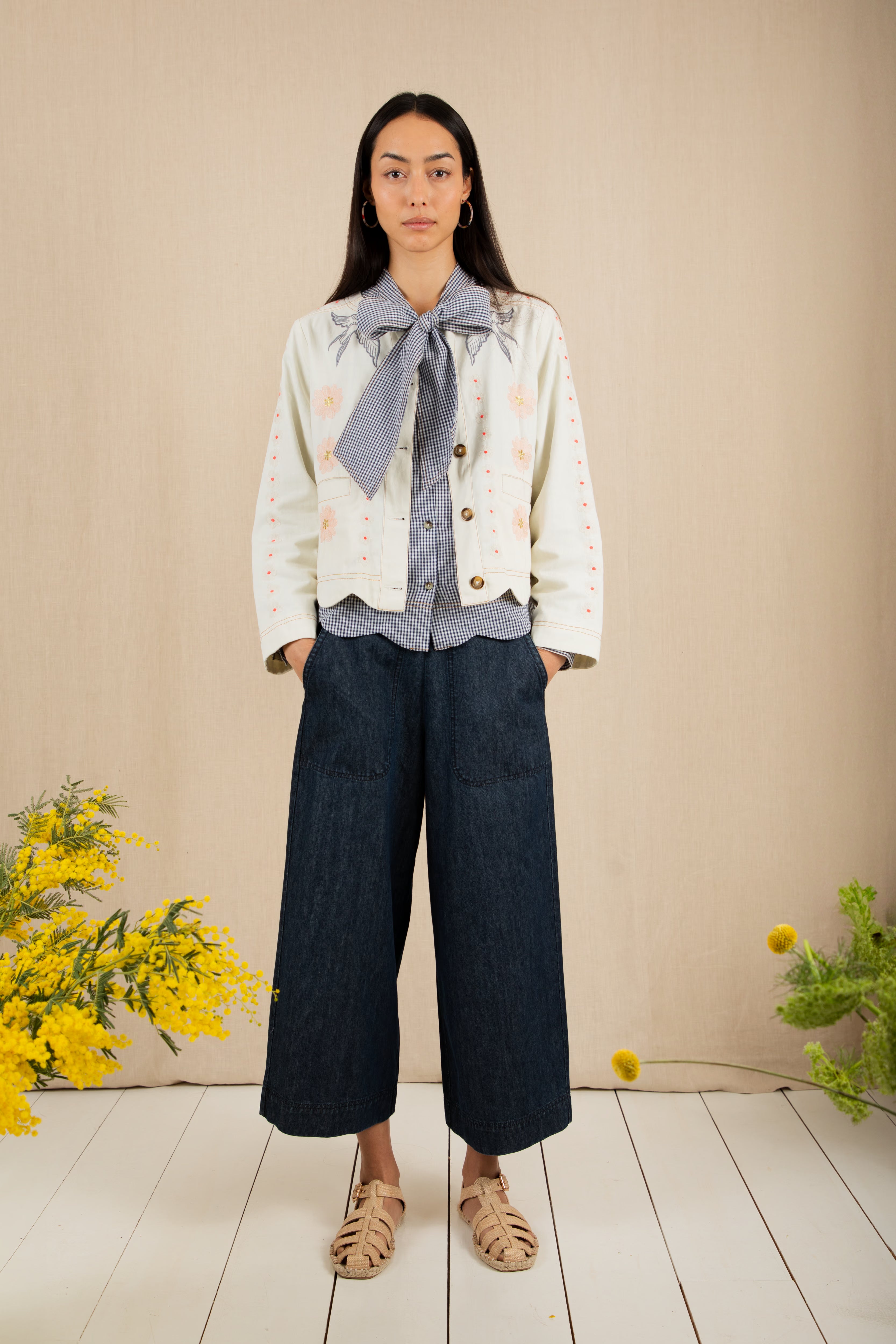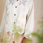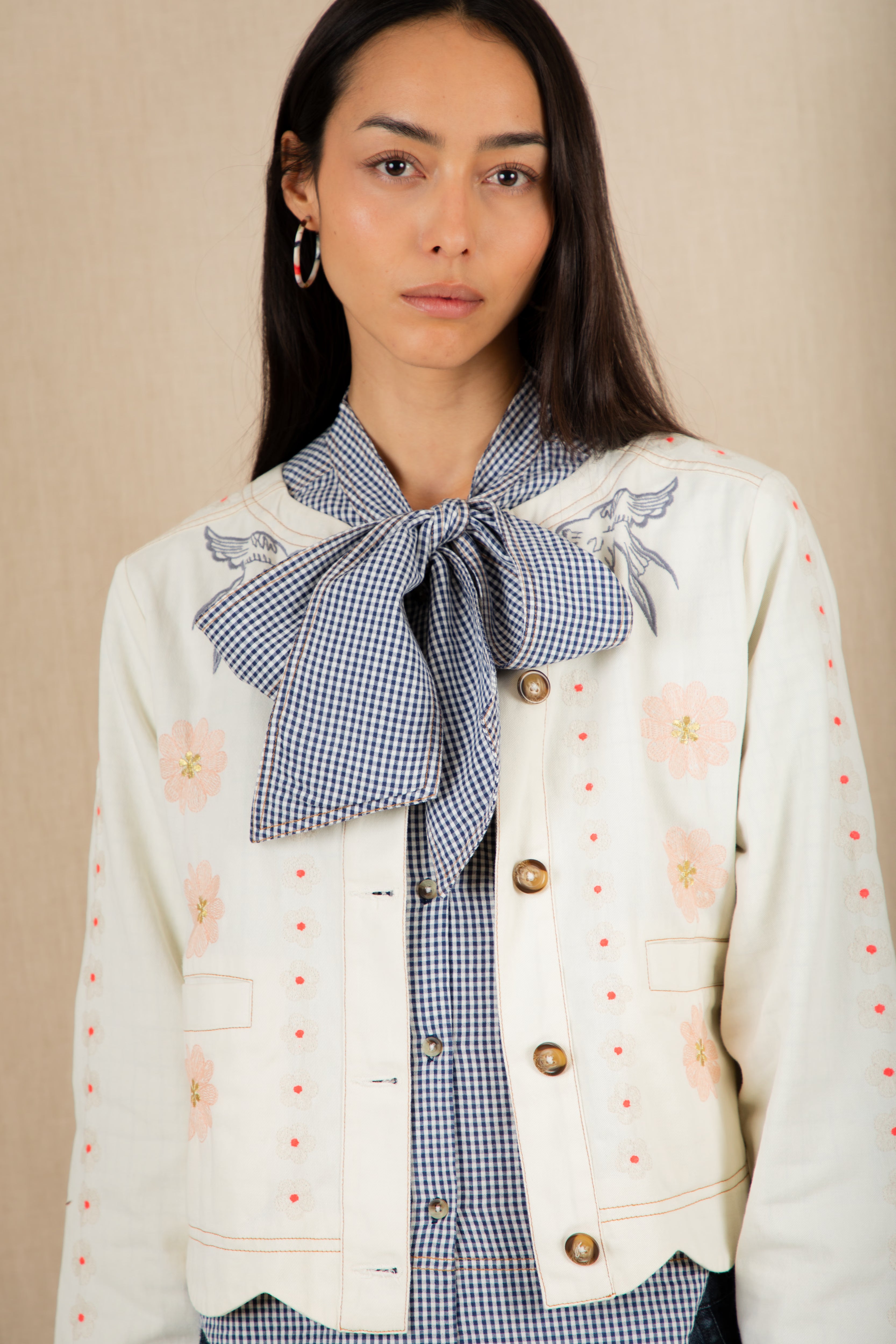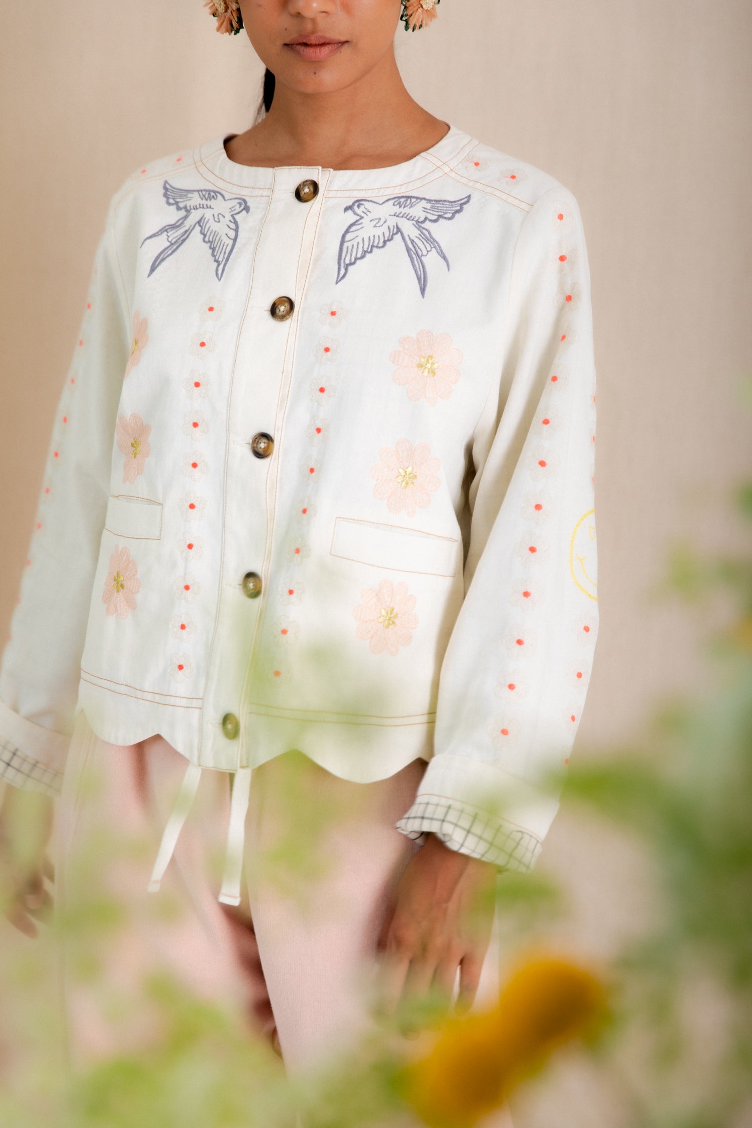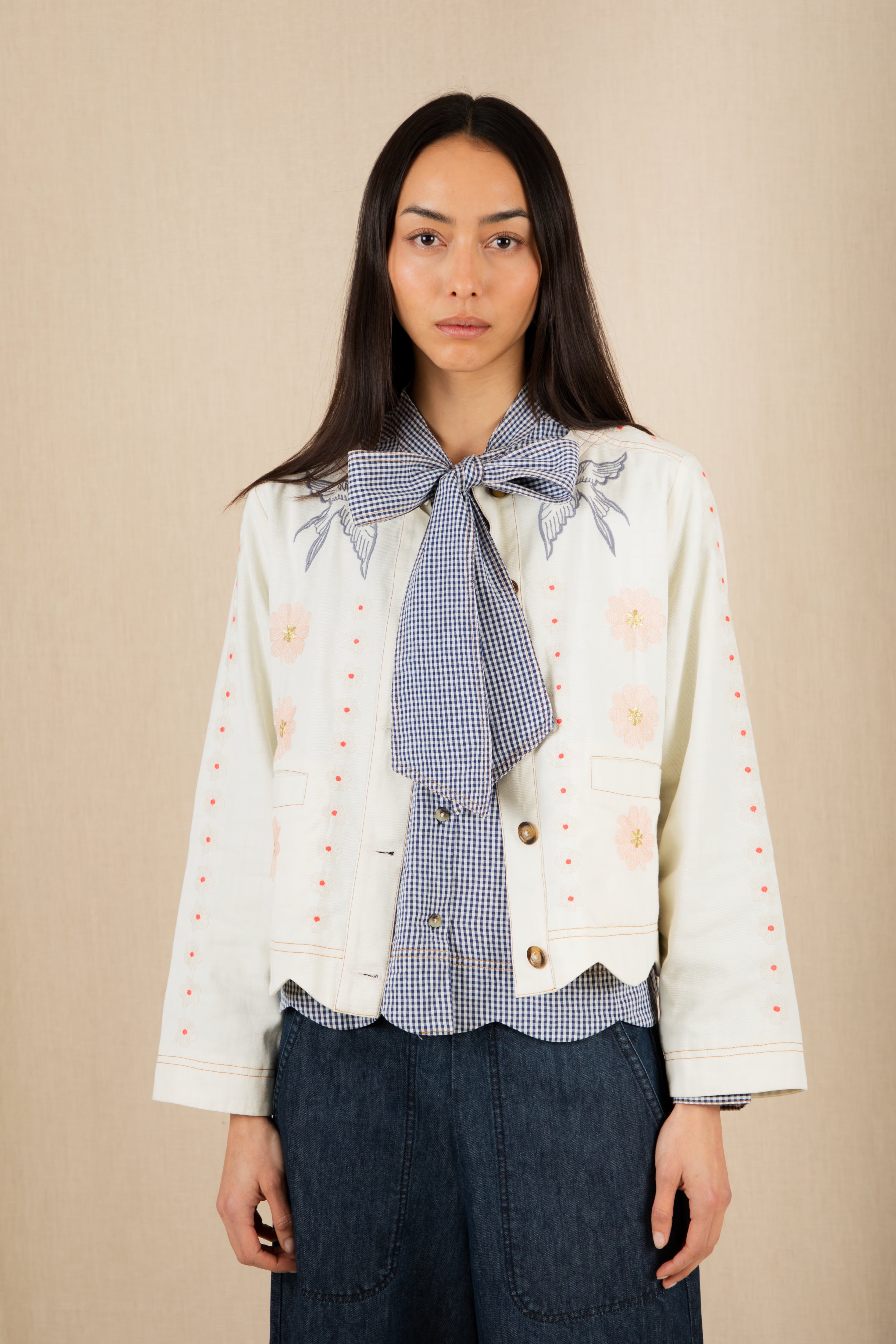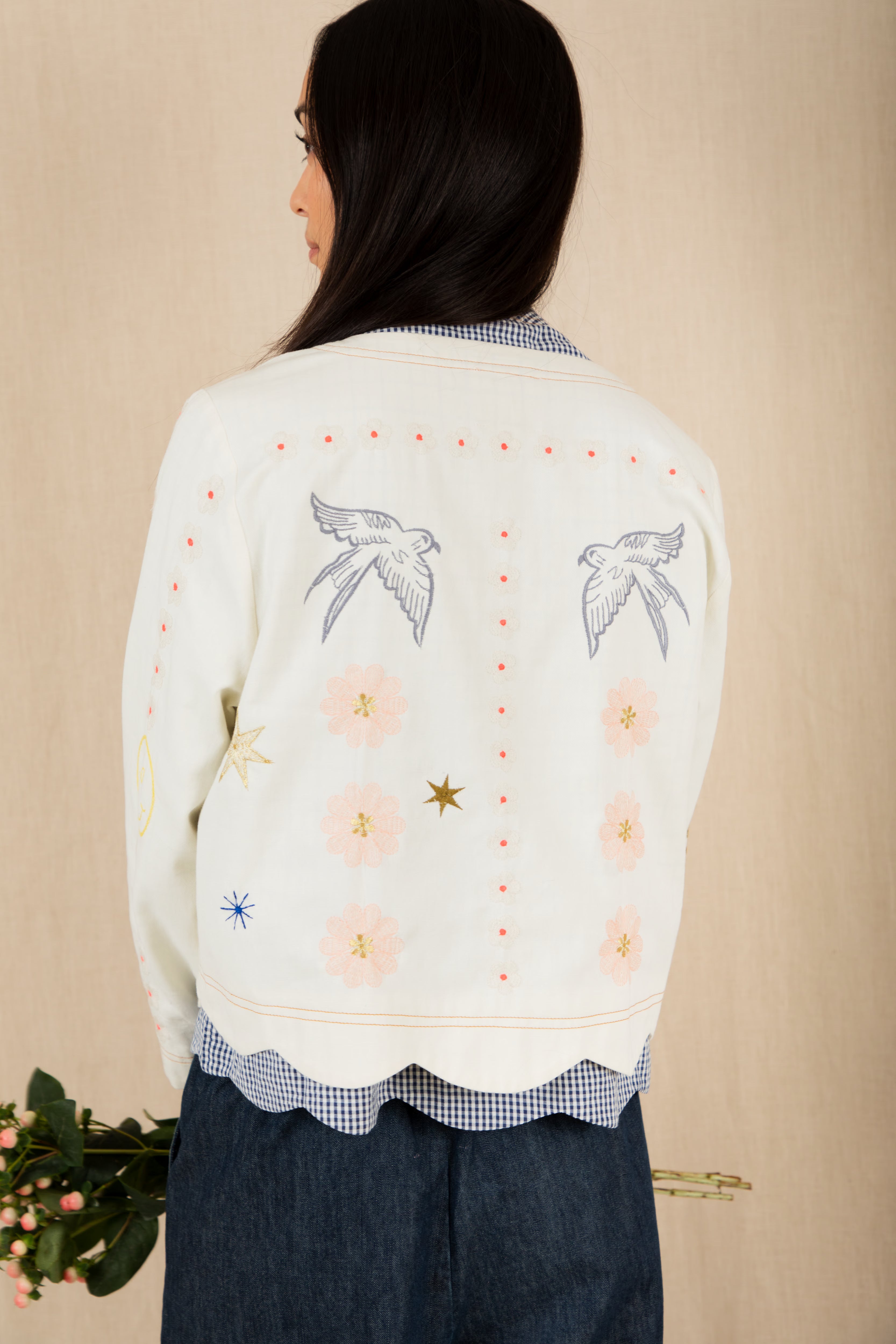 A beautiful, unique jacket with a detailed placement embroidery, cut in a modern, boxy and relaxed shape. It is made in soft cotton twill, with contrast tan twin-needle detail and features a unique faced scallop hemline. The sleeve is full-length, with a wide low armhole + open round neck.