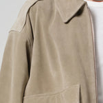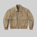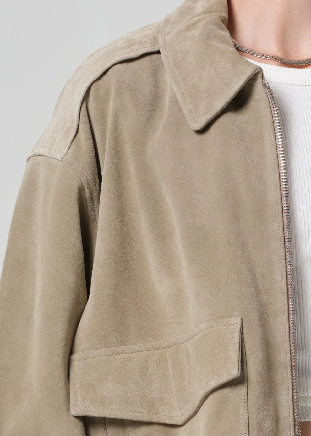 Looks Like: Medium to light suede bomber jacket with double front pockets