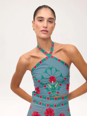 ULISES is a Top and Skirt set in blue with embroidered flower pattern in red. The top is cropped and halter neck design and the skirt is midi length with A-line cut.