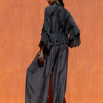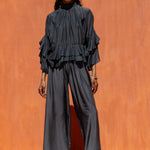 Voluminous top with high neck and long sleeves. It moves beautifully with double flounces making up the hem and arms. Ties at back neck.