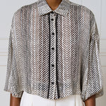 Cropped printed shirt with lurex details and a collar. It features long sleeves and fastens with buttons at the front and cuffs.