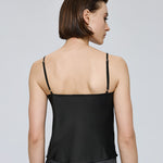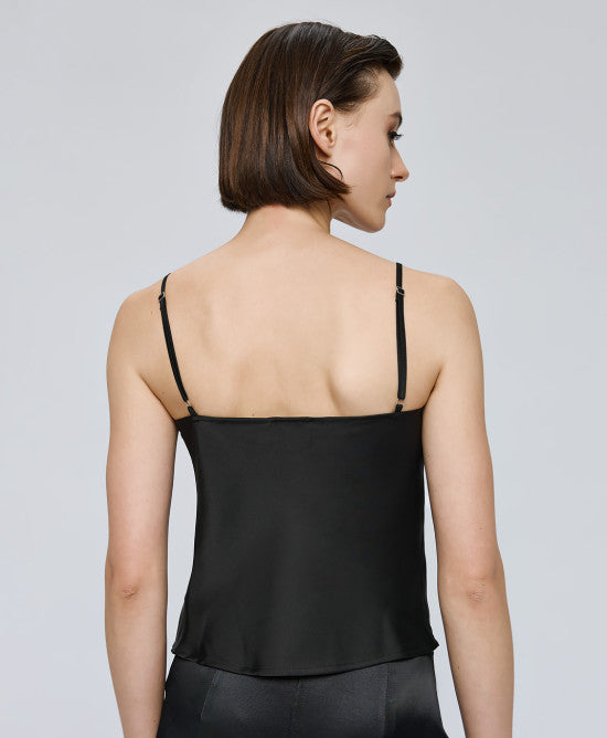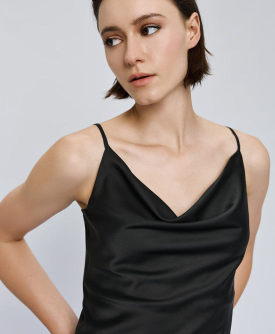 Satin top with a draped neckline and thin adjustable straps. It is a perfect go-to that pairs effortlessly with both trousers and skirts.