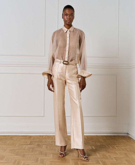 Organza shirt with ruffled cuffs. It features a collar and front button closure. Choose it to elevate any look.