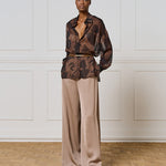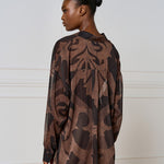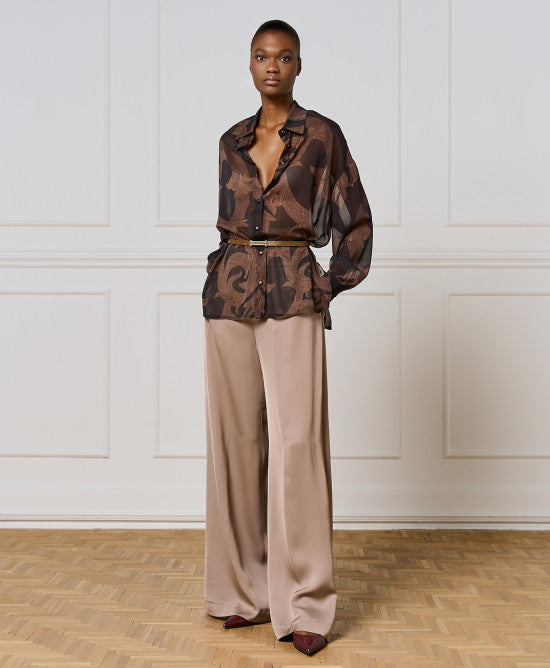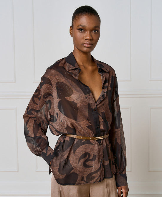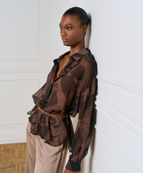 Printed semi-transparent shirt with lurex details. It features a collar and button closure at the front and cuffs.