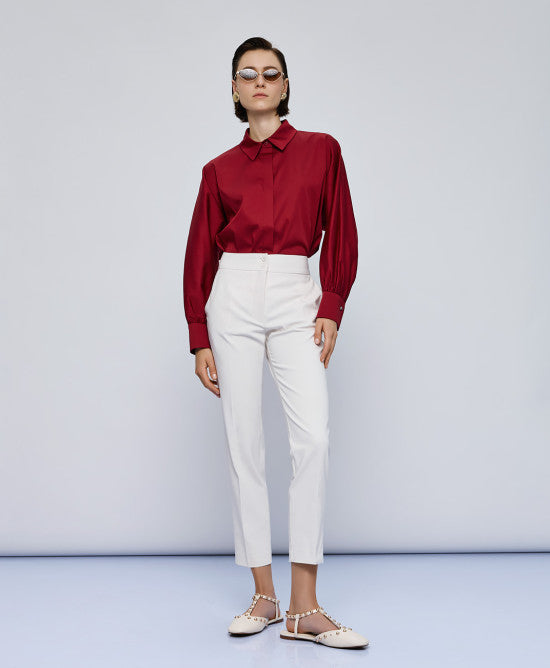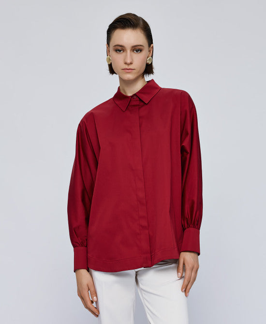 Shirt with long puff sleeves and a collar. It features gathered details on the cuffs and fastens with hidden buttons at the front.