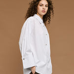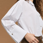 Long striped shirt with long sleeves and wide cuffs. It features a collar and front metal button closure. It is a must-have addition to your wardrobe.