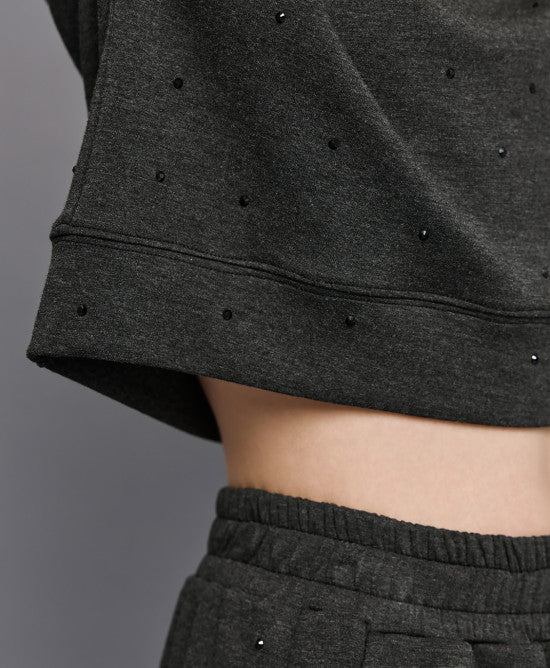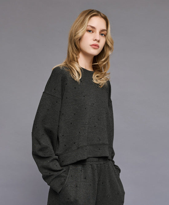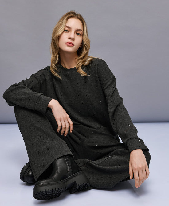 Long-sleeve sweatshirt with a round neckline and rhinestone details. Pair it with the matching Sweatpants with Rhinestones from Access for a comfortable and stylish look.