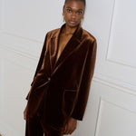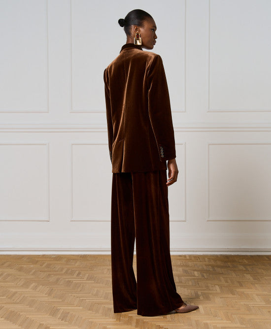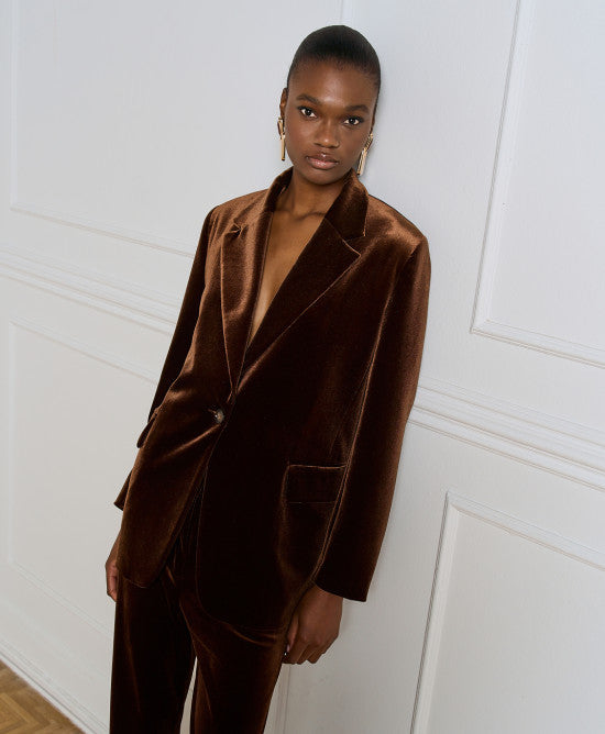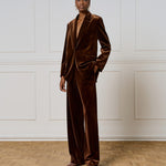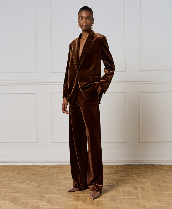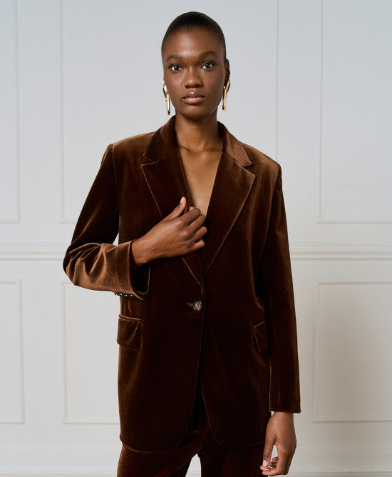 Velvet blazer featuring a notched lapel collar, padded shoulders and front flap pockets. Designed with front and cuff button fastening and inner lining. Pair it with the matching Velvet Trousers from the brand Access for stylish formal looks.