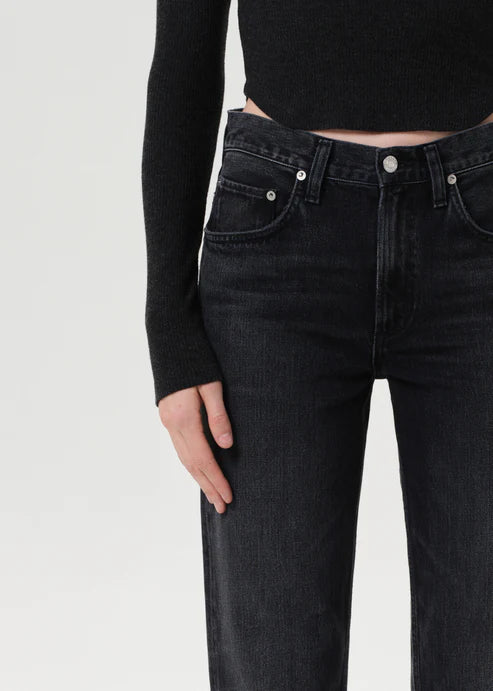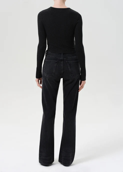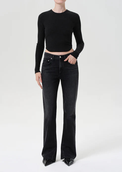 This mid-rise bootcut hugs through the hips before opening into a subtle kick at the hem. Cut in our weightless, non-stretch regenerative cotton denim and washed down for an ultra-soft feel, it features a worn-in black finish with fading and whiskering for a vintage-inspired look. Style with a tonal knit or oversized button-down for an easy, off-duty uniform.