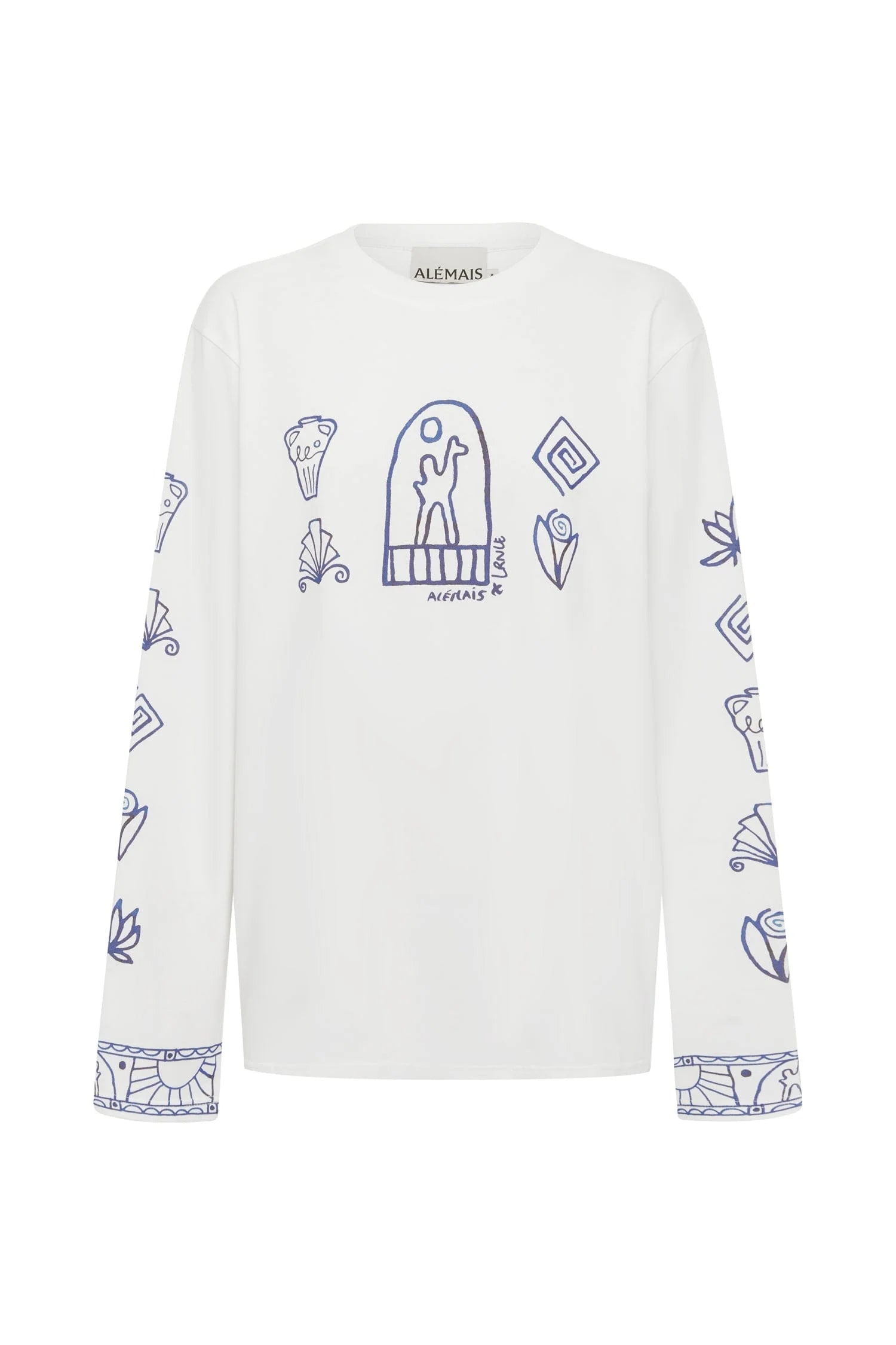 Long sleeved tee in 100% organic cotton. Blue print designed in collaboration with artist Laurence Leenaert.