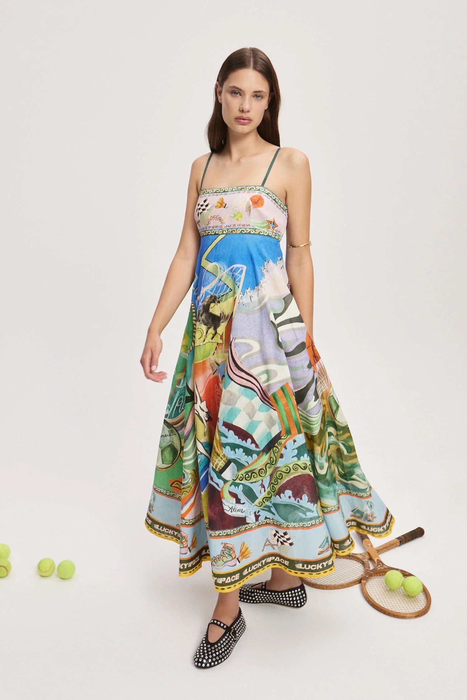 Long midi sundress with adjustable spaghetti straps, empire waistline and fun multi-coloured pattern.
