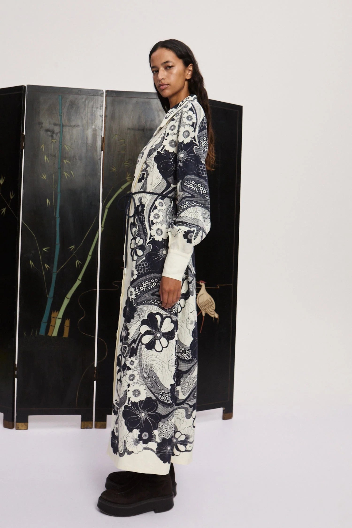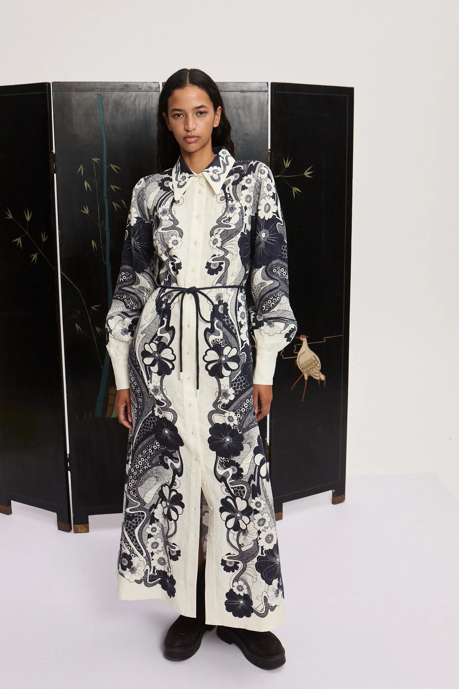 Maxi-length shirt dress with pointed collar, full button closure and long sleeves with wide cuff. Navy pattern on cream base.