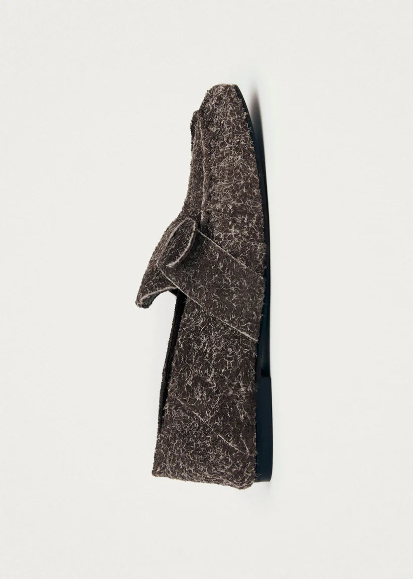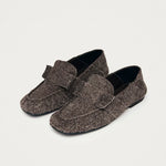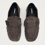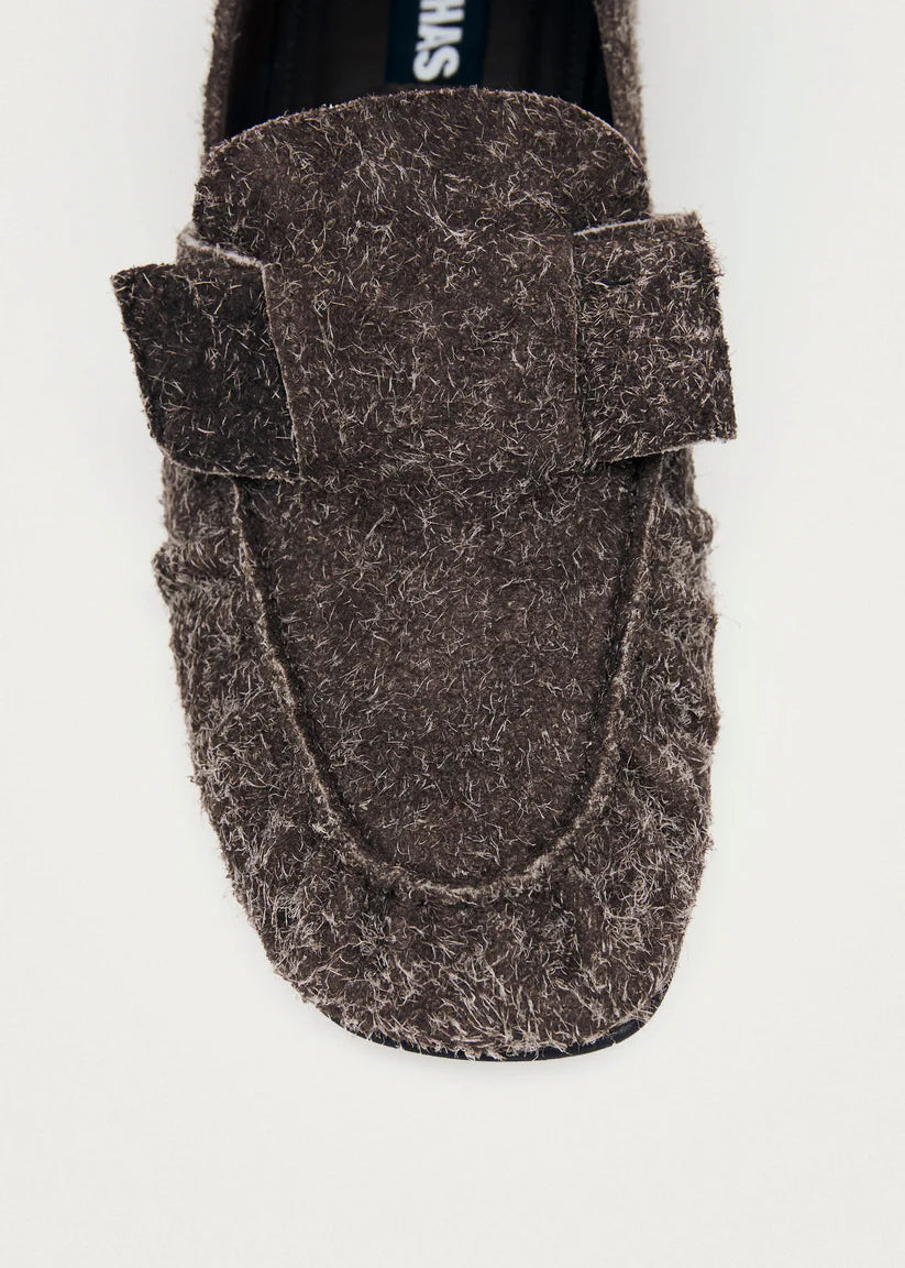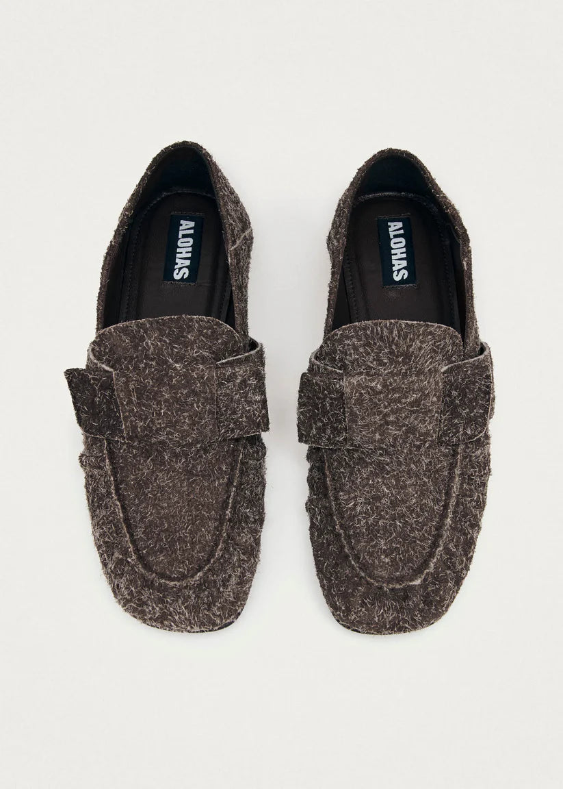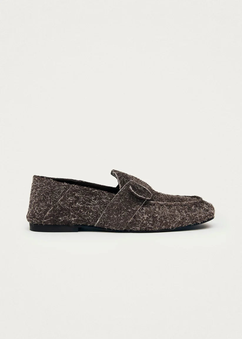 The Aeryn loafers, presented in a brown hue, are crafted from fuzzy suede material that offers a unique texture. These loafers feature a classic silhouette with a slightly rounded toe, providing both ease and distinction. Their suede finish makes them a standout choice for those seeking understated elegance with a tactile twist.