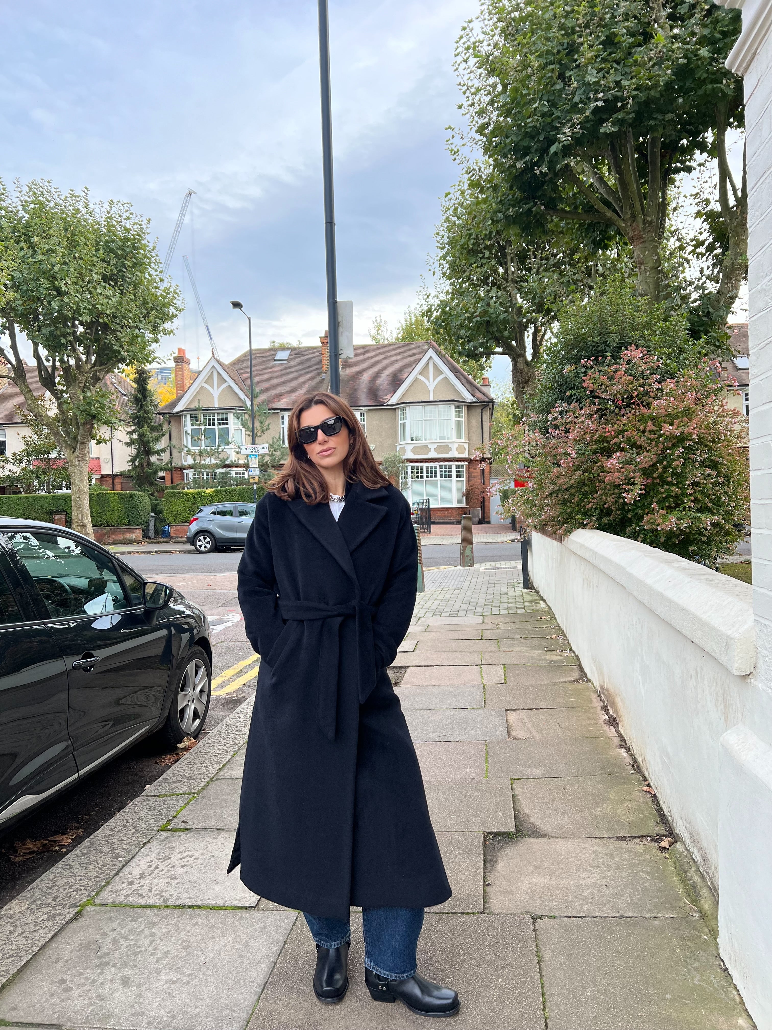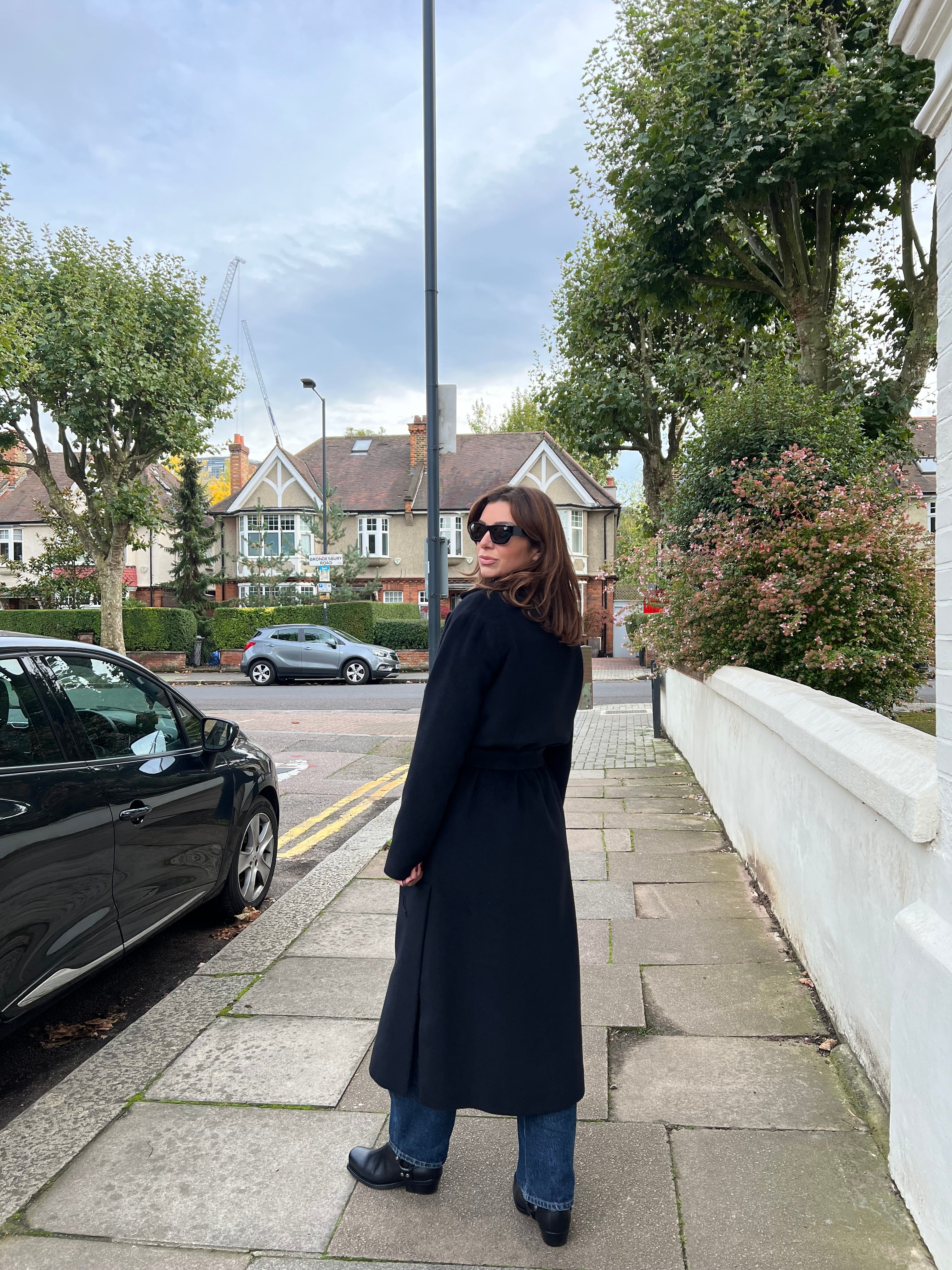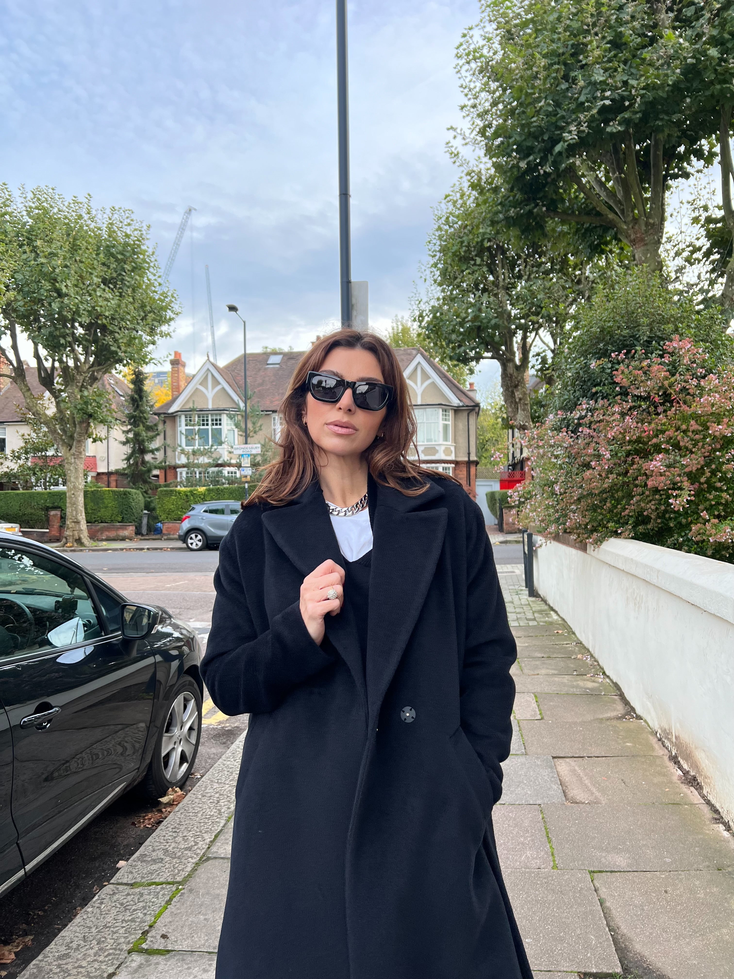 Classic black coat in soft touch Virgin Wool. It comes with a big collar, dropped shoulders and single hidden double breasted closure. Side pockets.