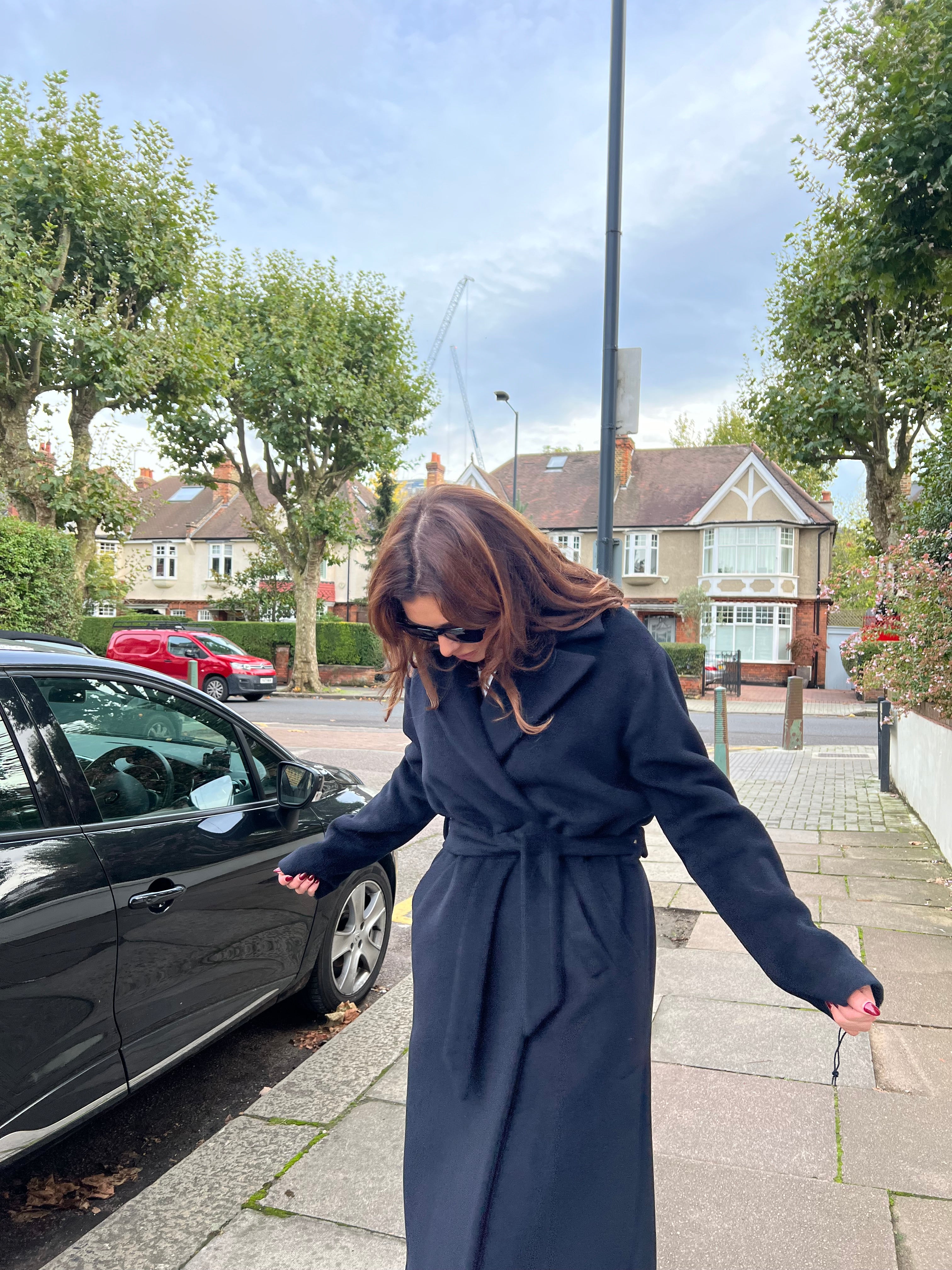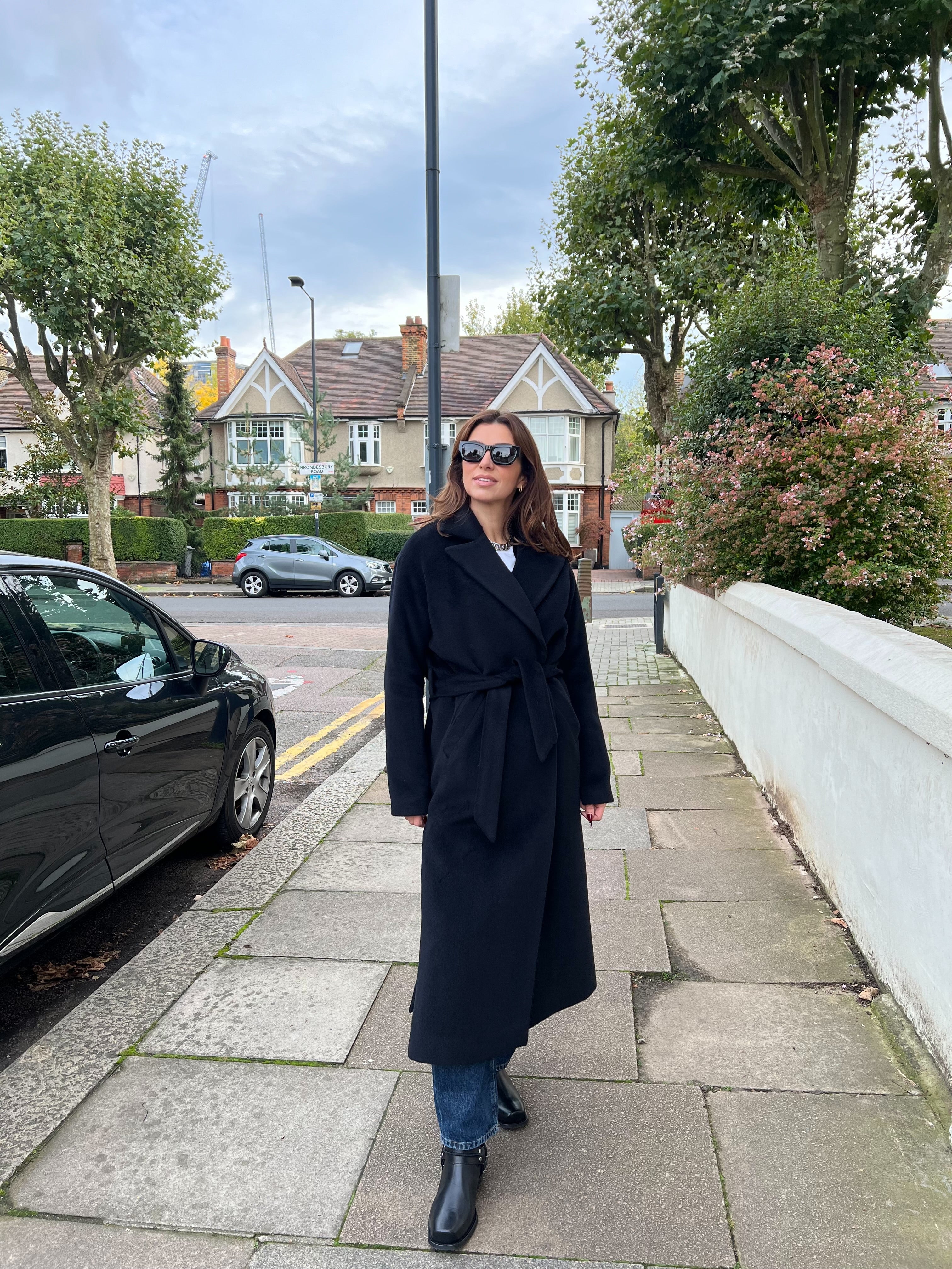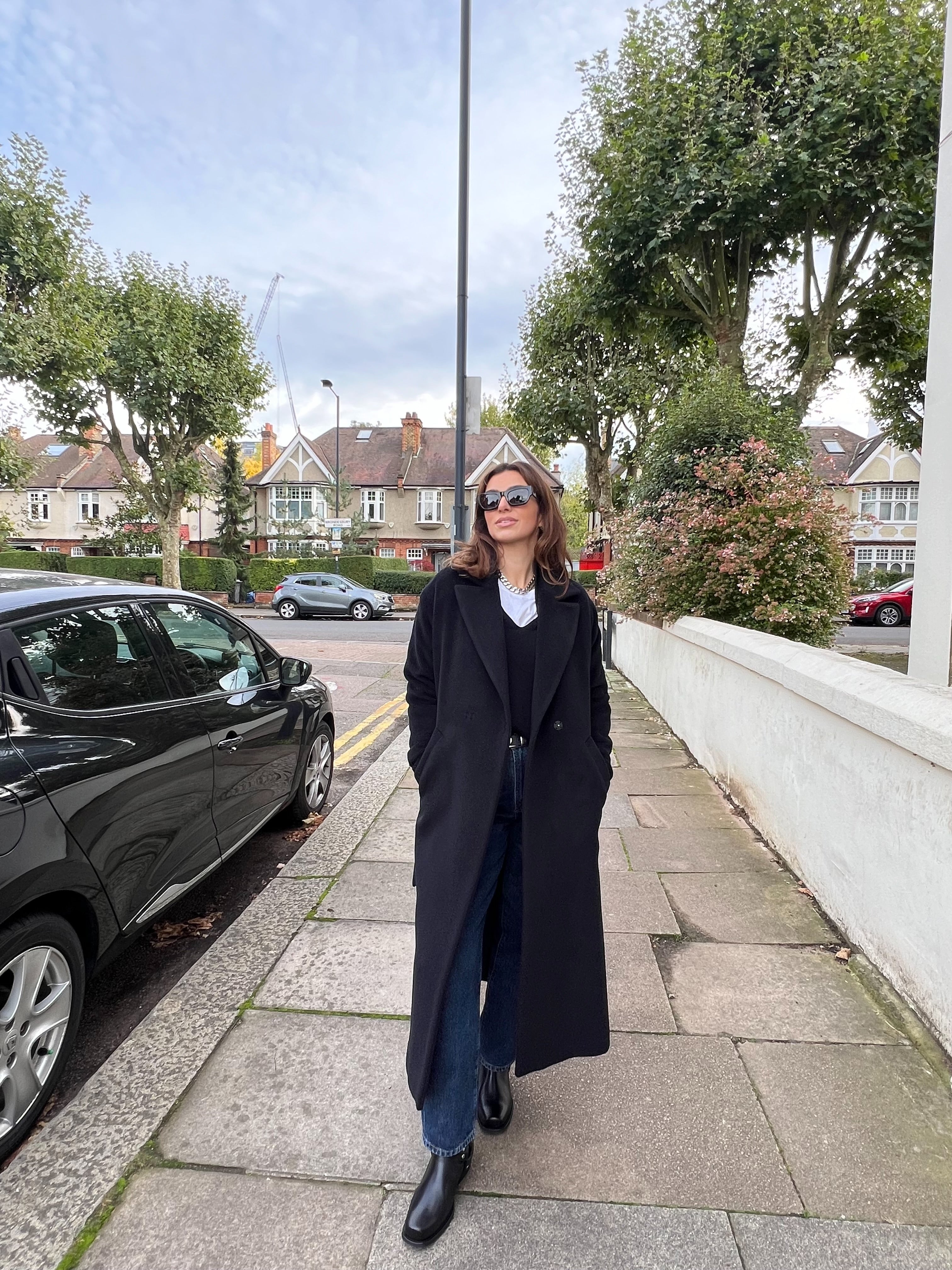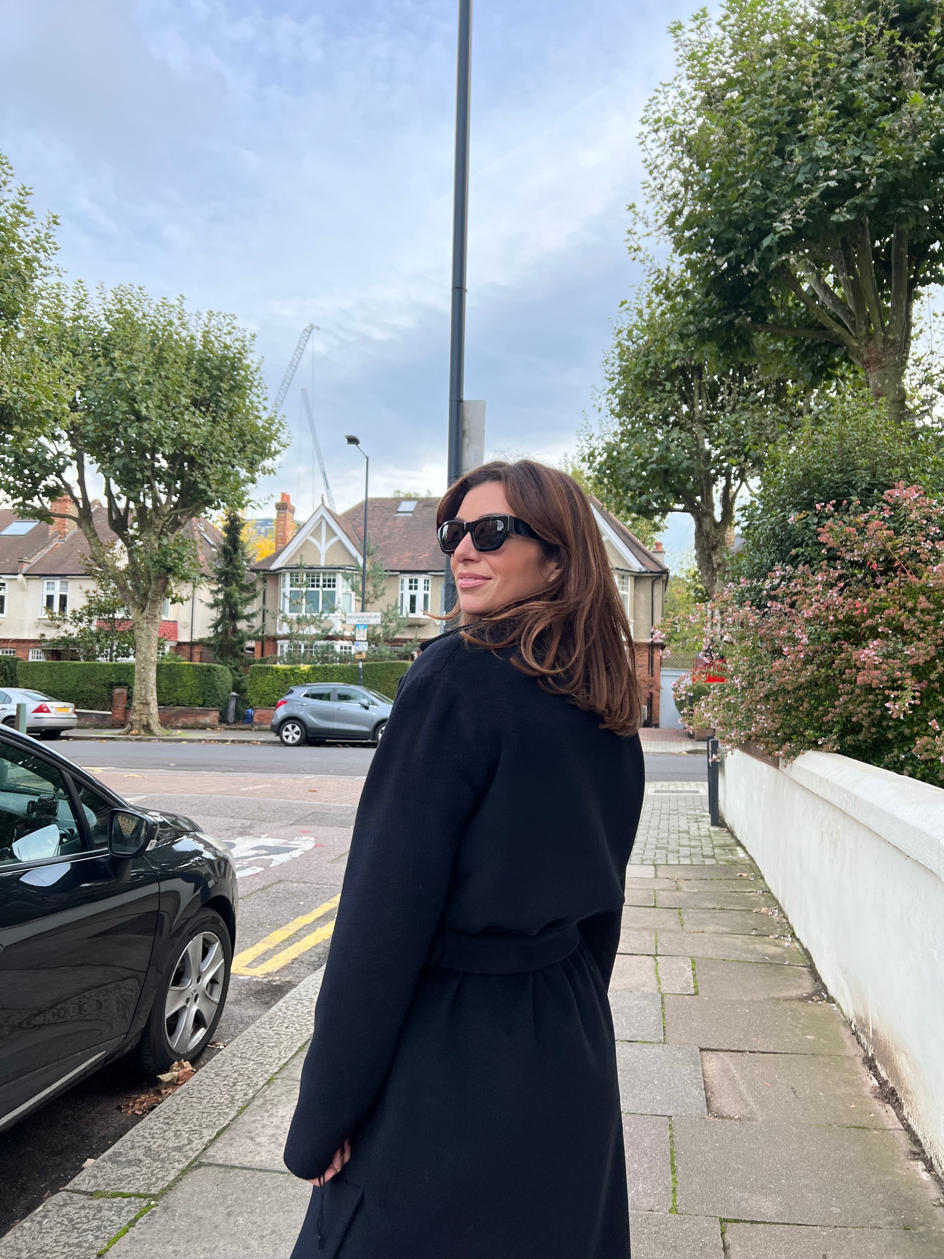 Classic black coat in soft touch Virgin Wool. It comes with a big collar, dropped shoulders and single hidden double breasted closure. Side pockets.