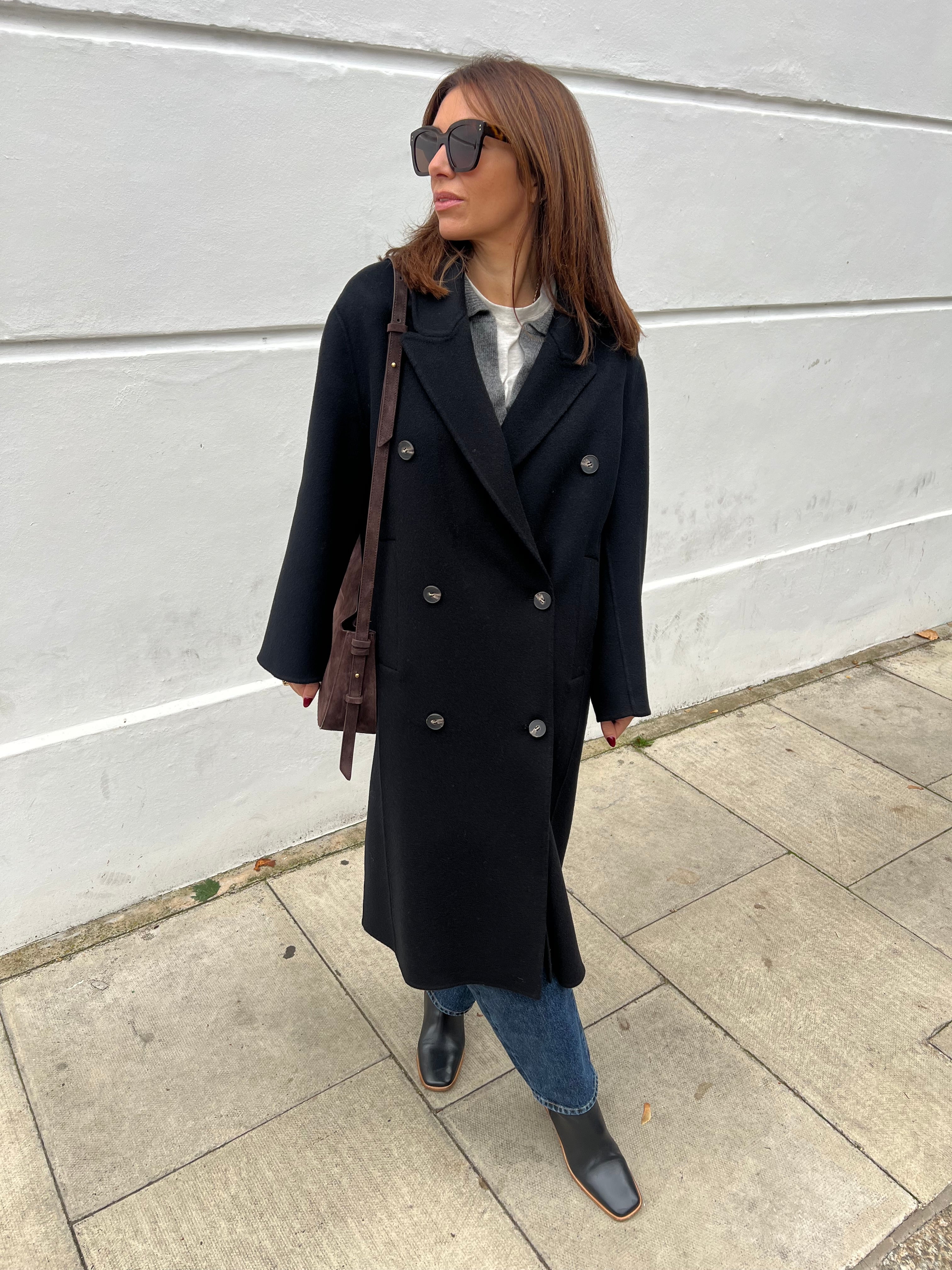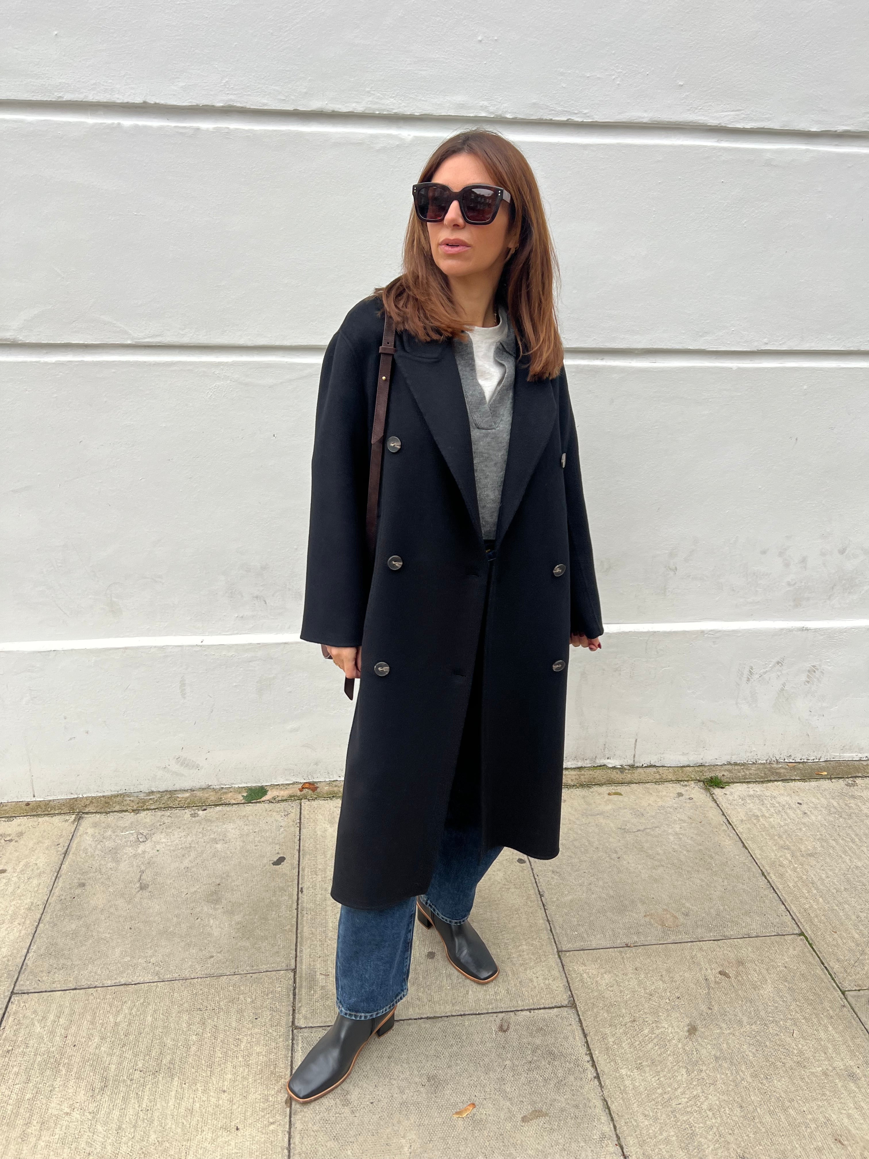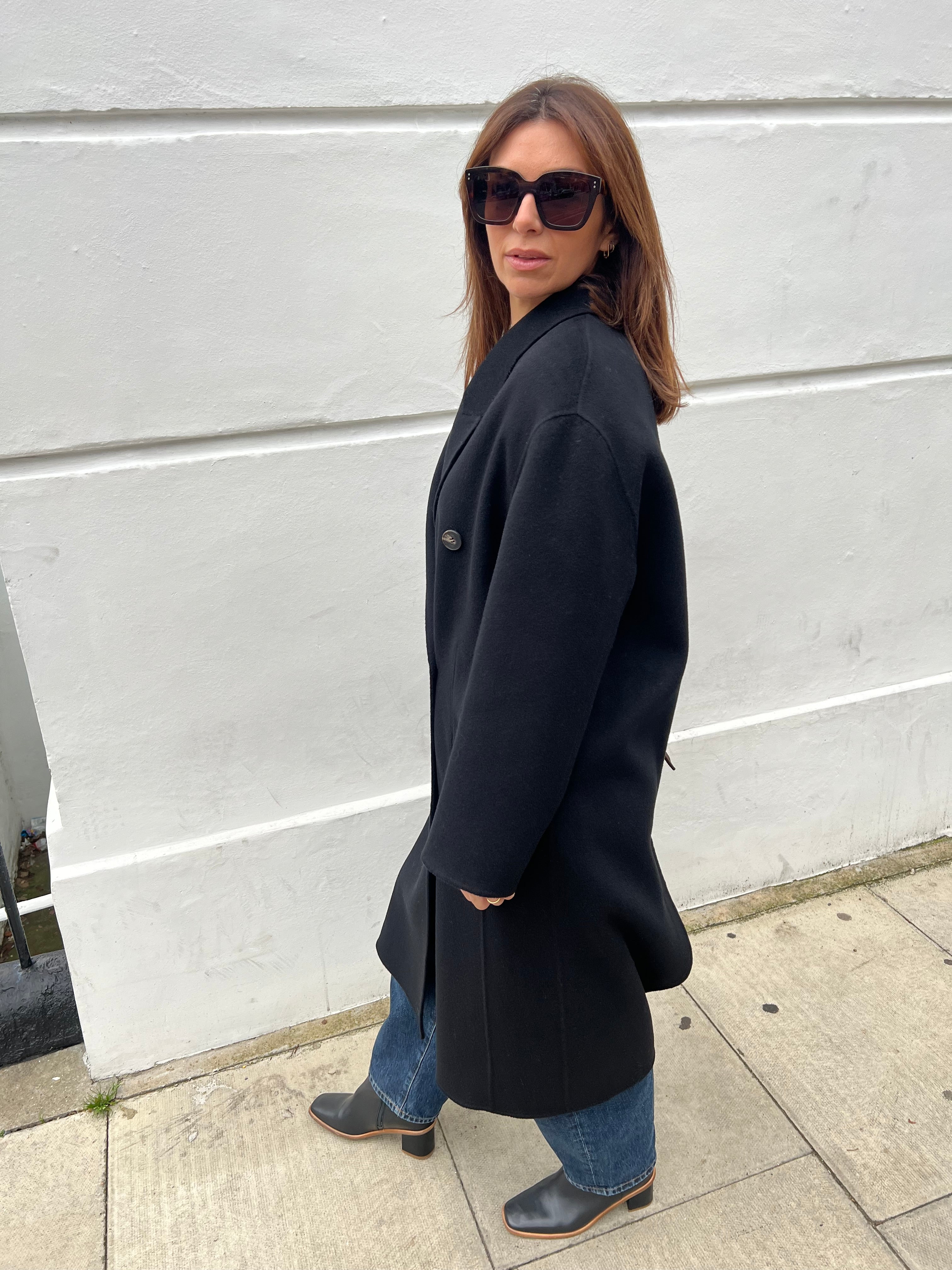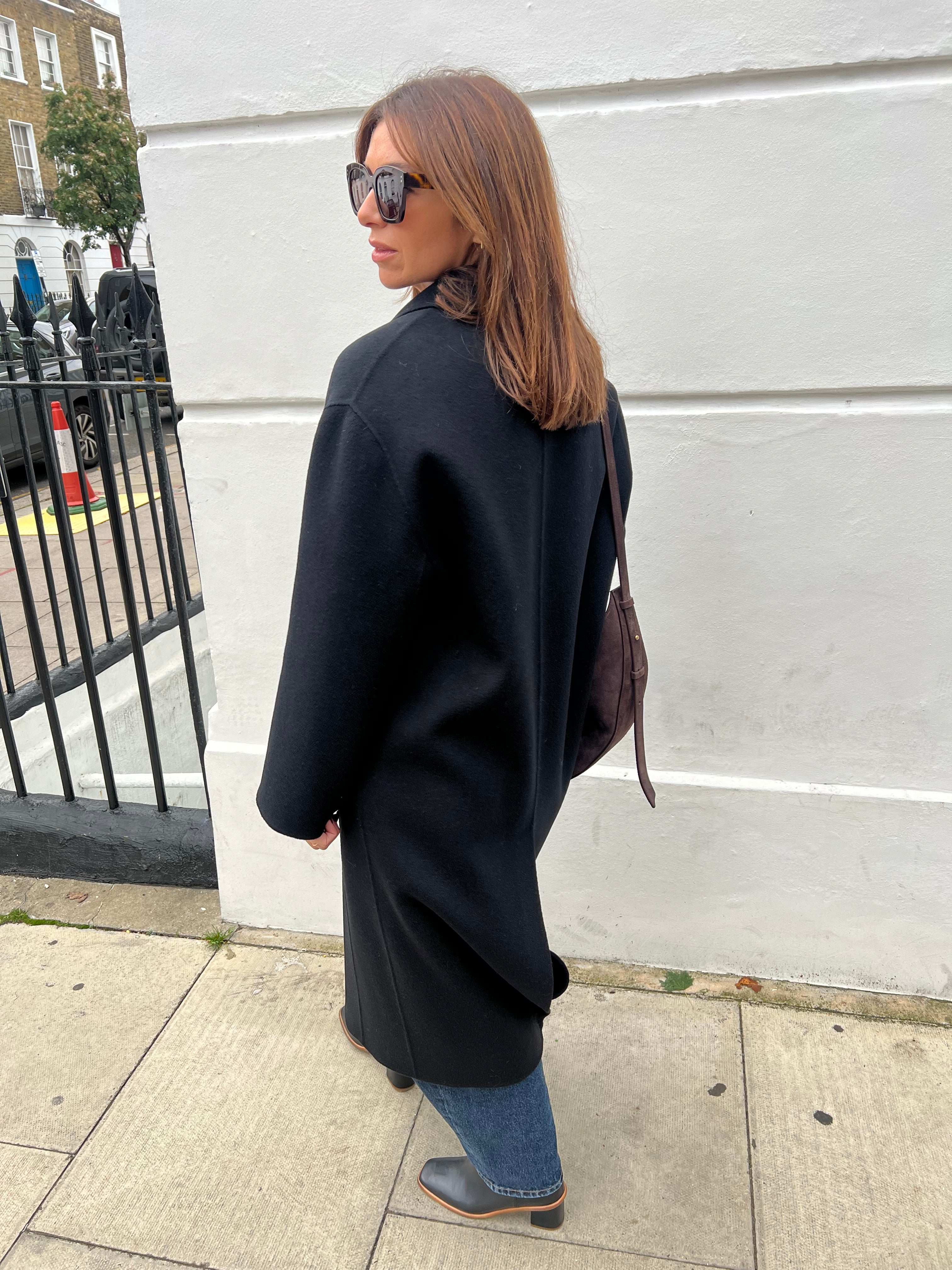 Classic oversized coat in black Virgin Wool. It comes with a big collar, dropped shoulders and classic double breasted closure. Side pockets. Despite it being unlined you are sure to keep warm with the brushed double-faced wool.