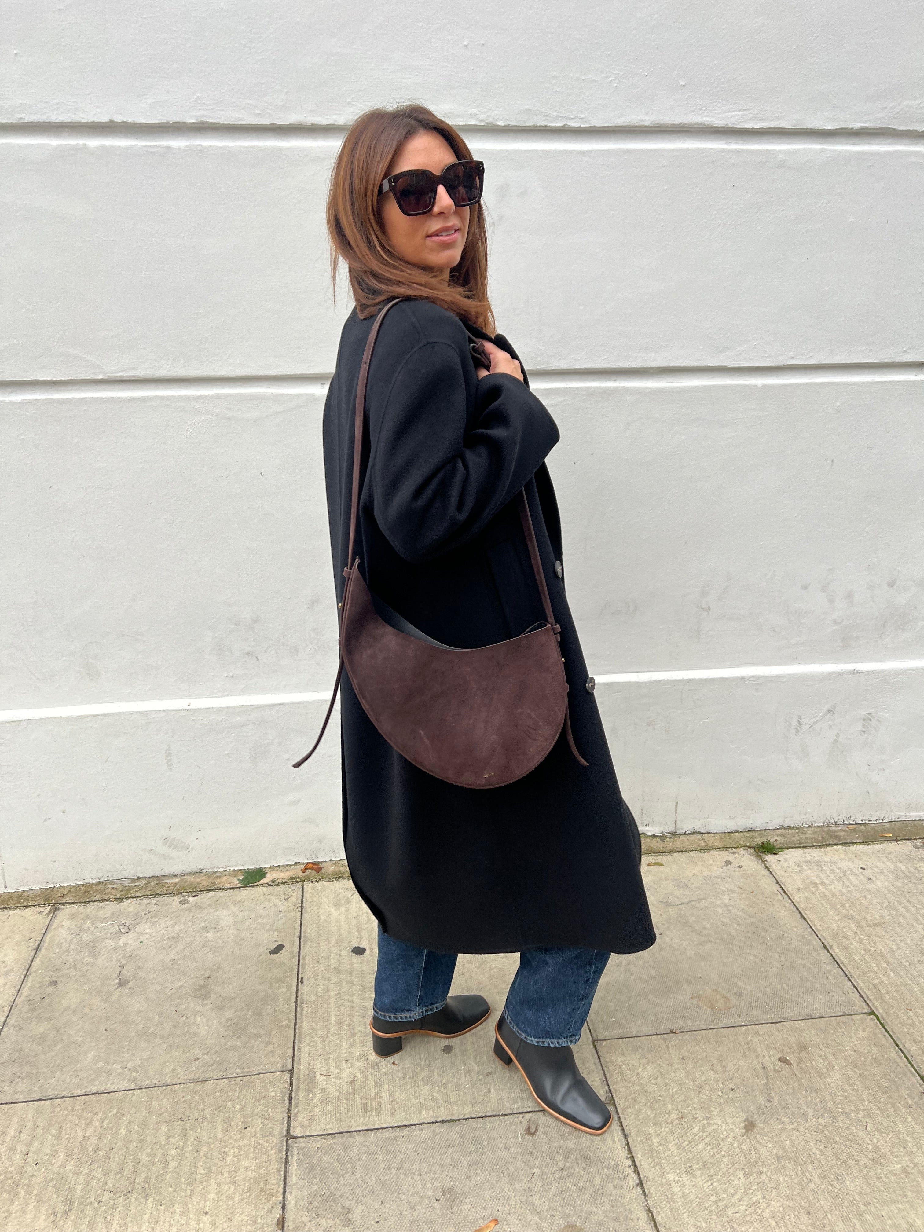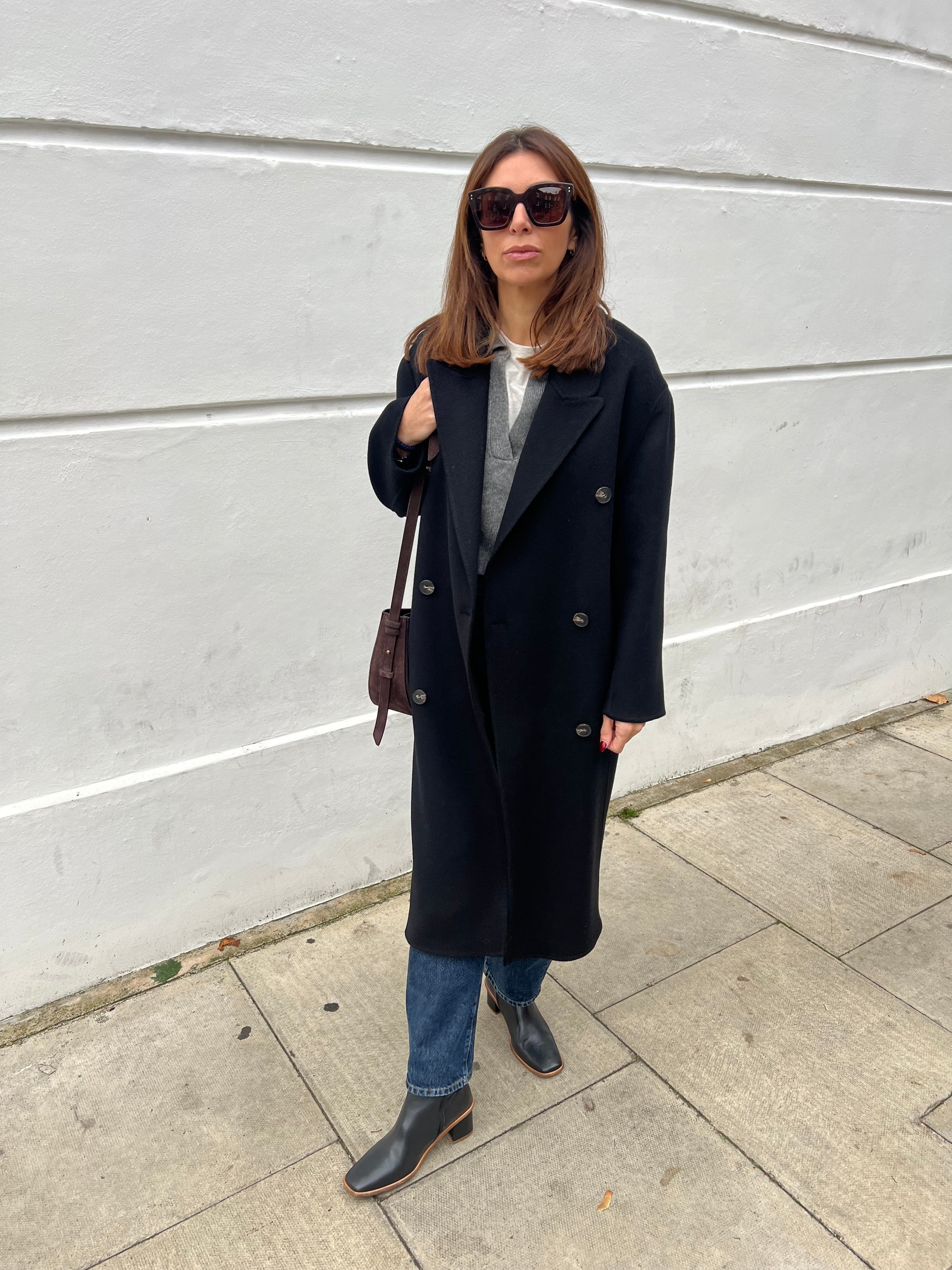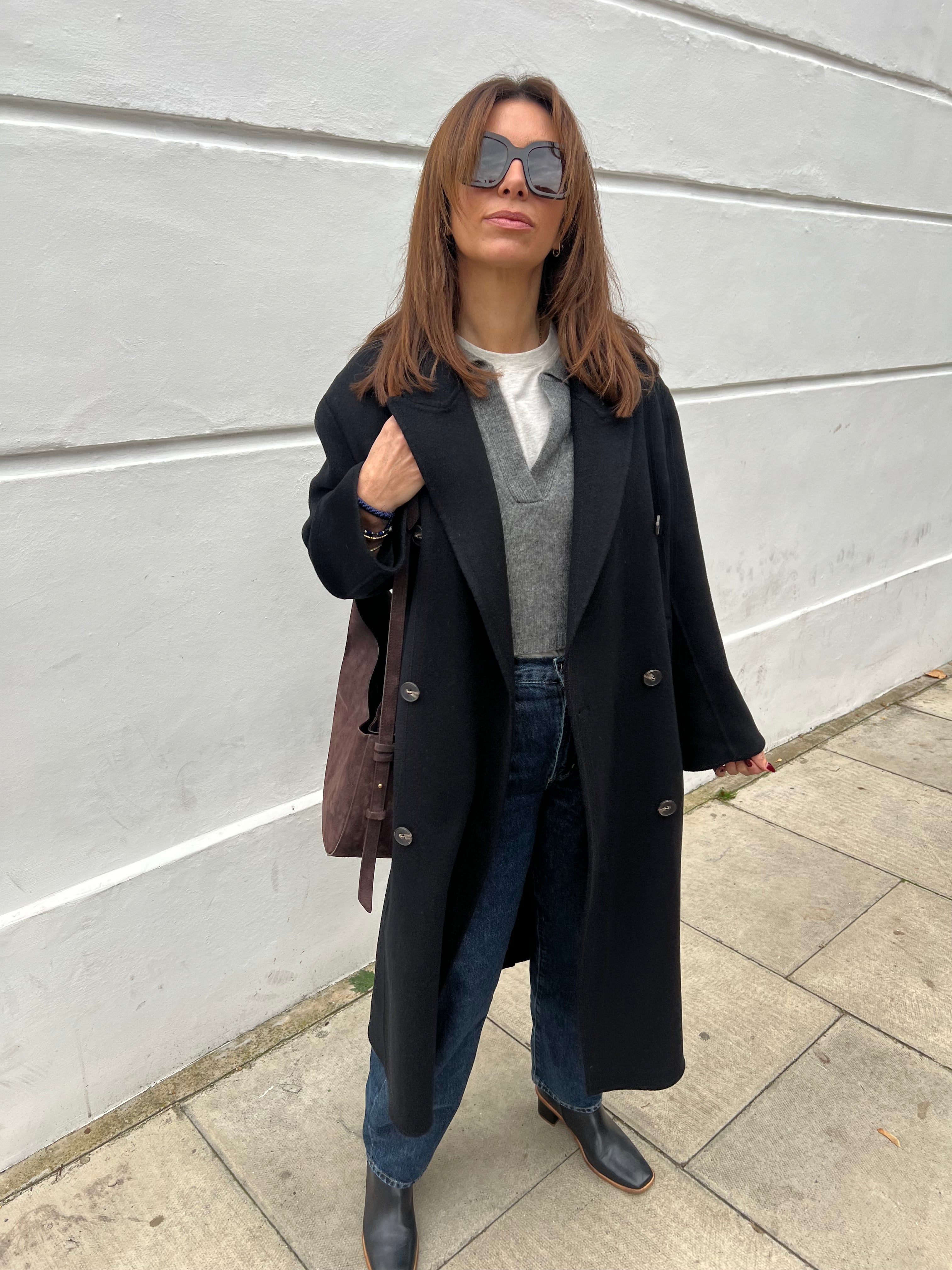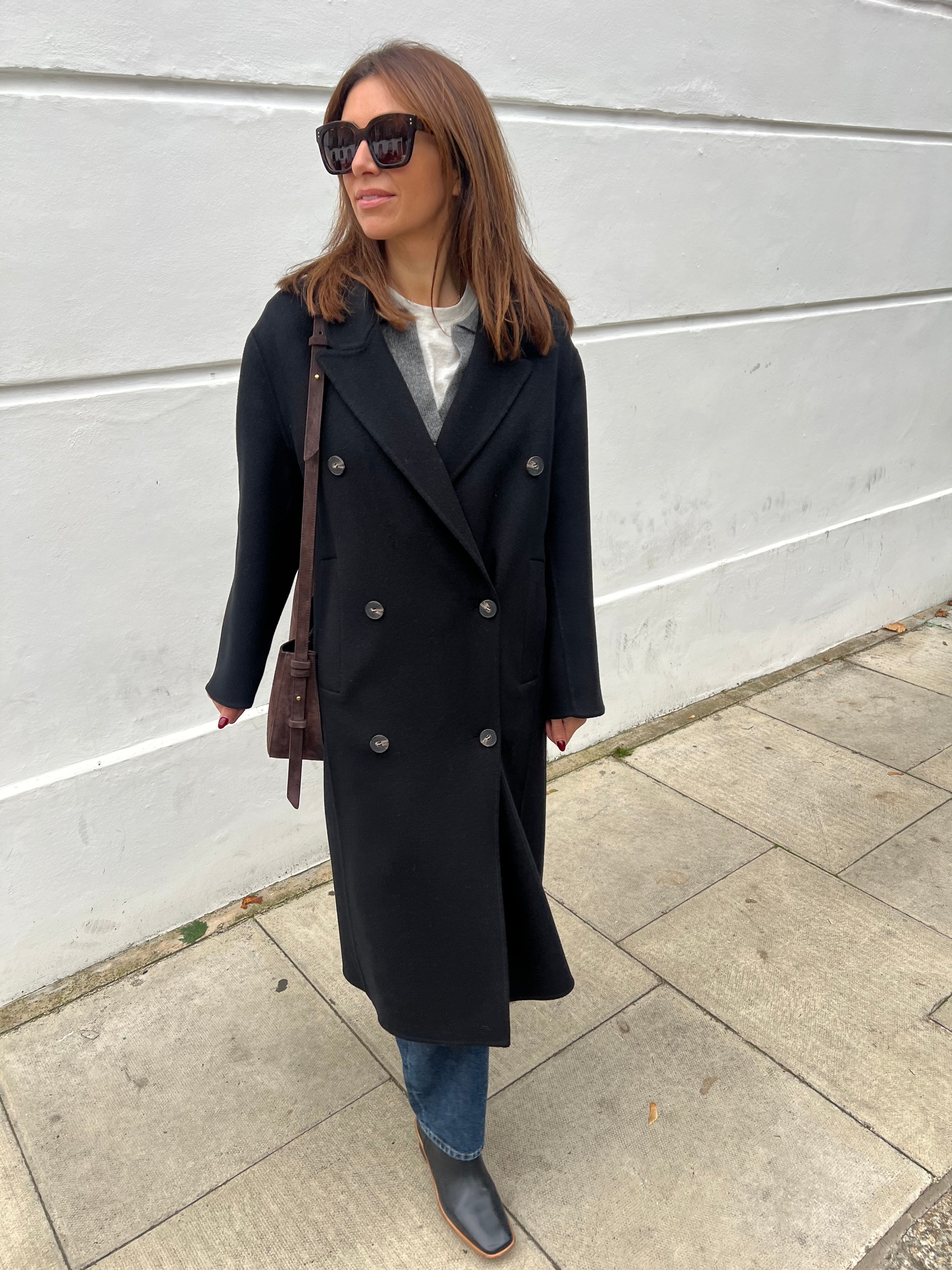 Classic oversized coat in black Virgin Wool. It comes with a big collar, dropped shoulders and classic double breasted closure. Side pockets. Despite it being unlined you are sure to keep warm with the brushed double-faced wool.