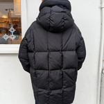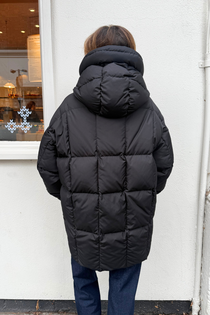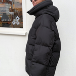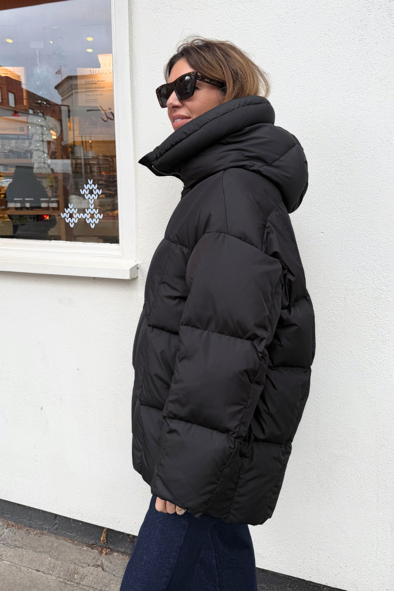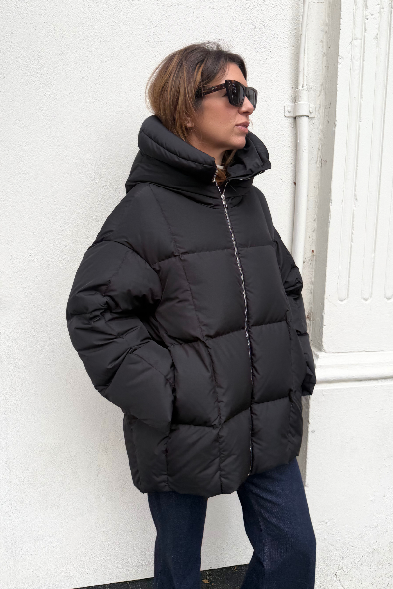 Oversized puffer coat from Annie Paris. Rounded cut with dropped shoulder and hood. Slightly longer to keep you warm and with zipped side pockets.