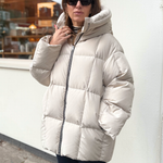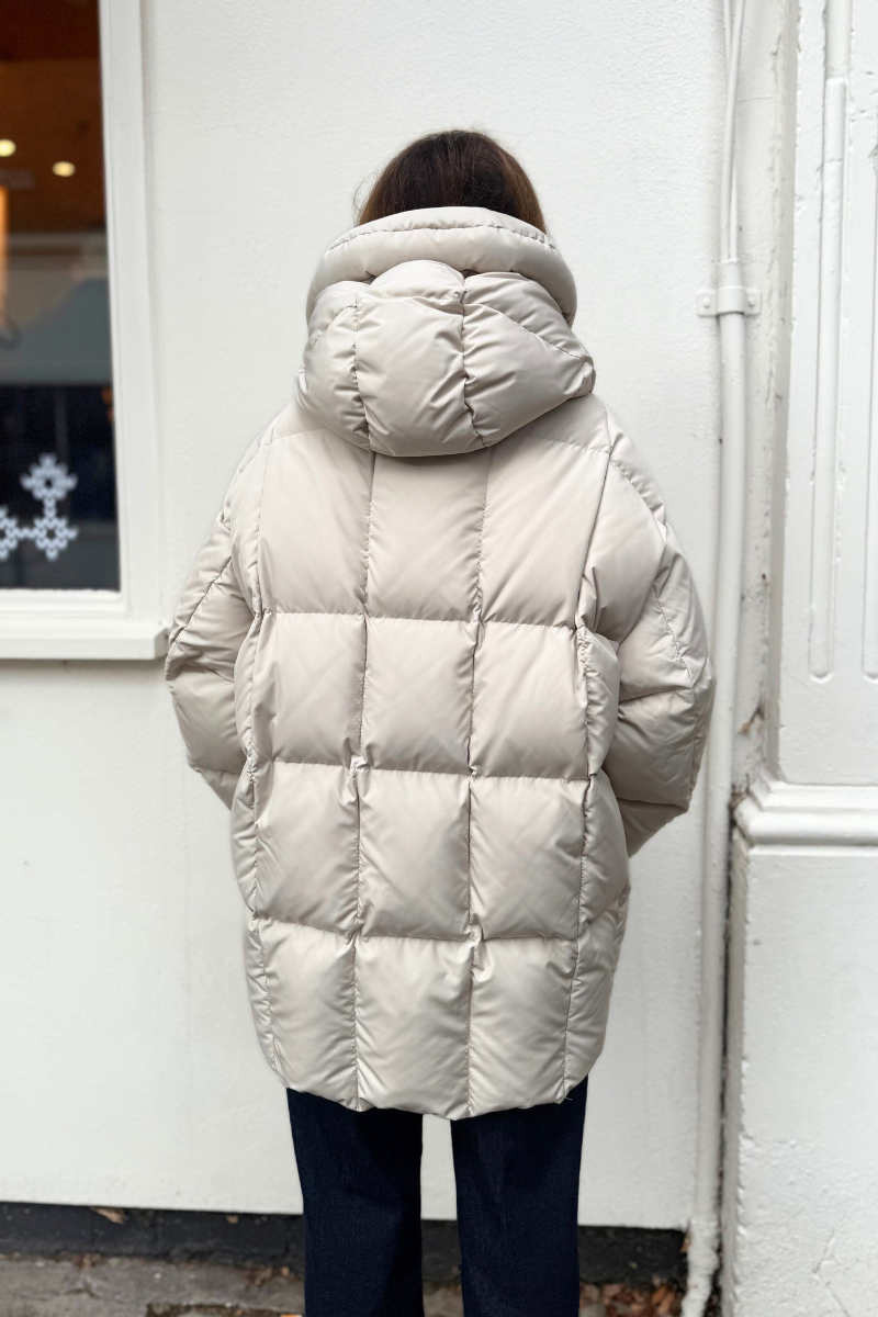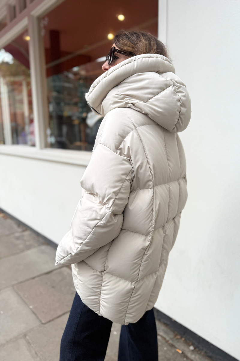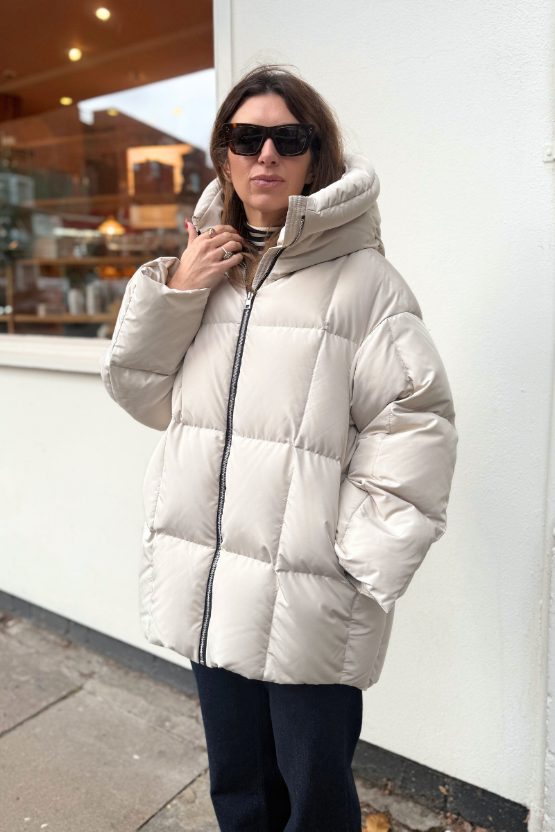 Oversized puffer coat from Annie Paris. Rounded cut with dropped shoulder and hood. Slightly longer to keep you warm and with zipped side pockets.