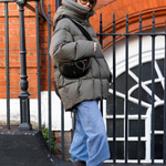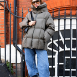 Oversized puffer coat from Annie Paris. Rounded cut with dropped shoulder and hood. Slightly longer to keep you warm and with zipped side pockets.