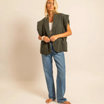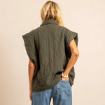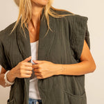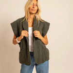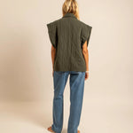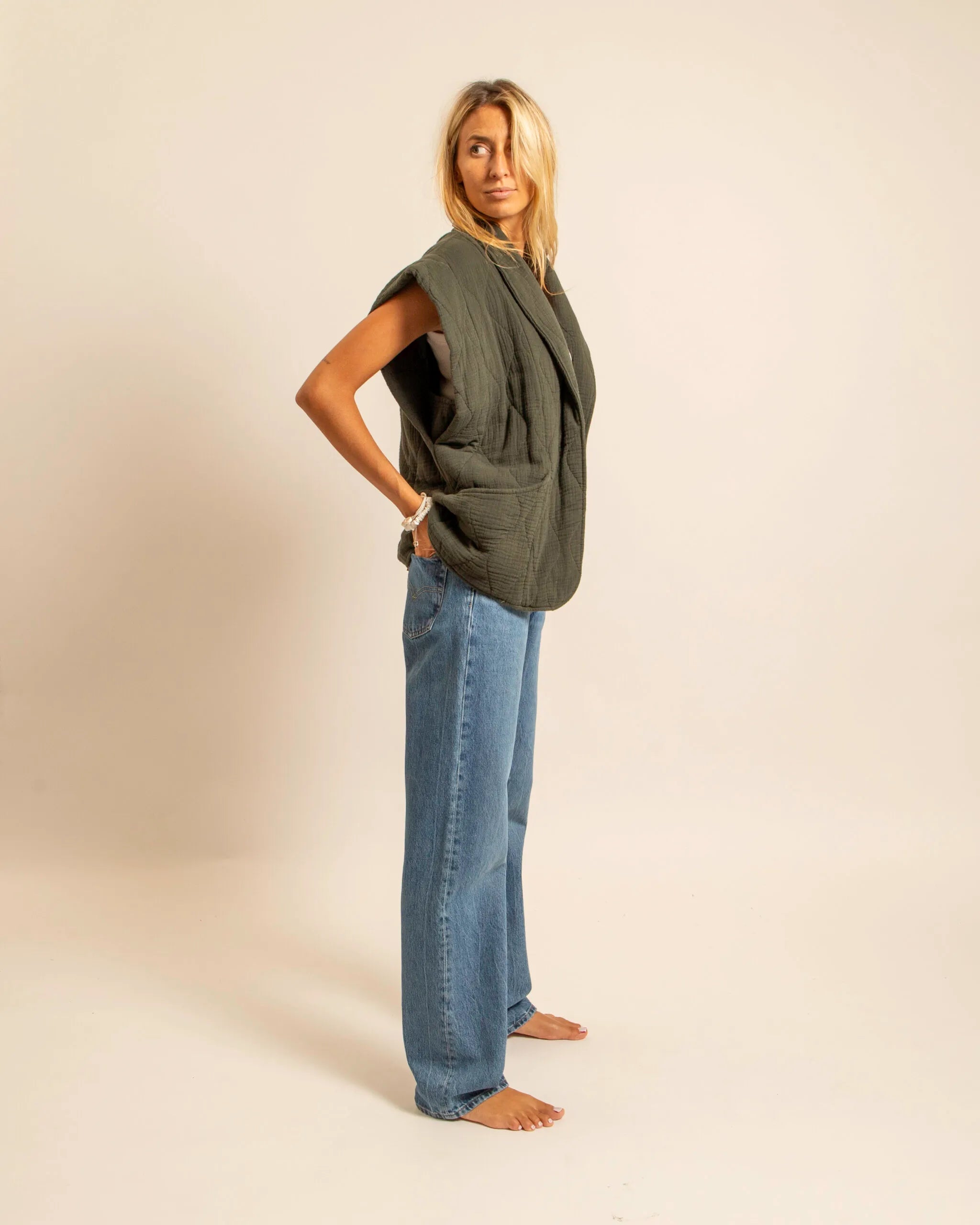 Khaki cotton double gas gilet with open design and oversized shoulders.