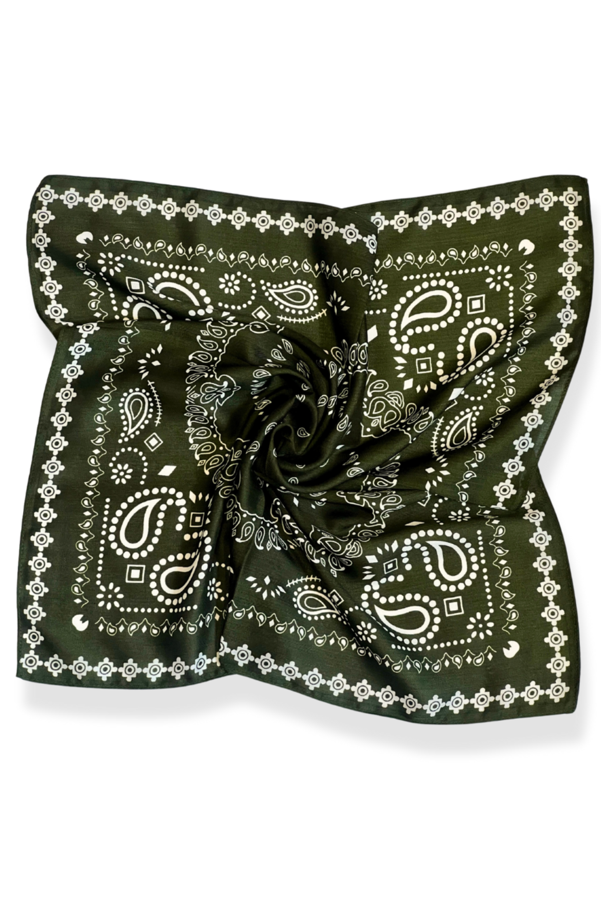 New four stylish square bandana scarves from Libby Loves, each featuring a classic paisley design complemented by a bold border of geometric floral motifs. These scarves are ideal for both fashion and function—perfect for accessorising, headwear, or even casual neckwear.