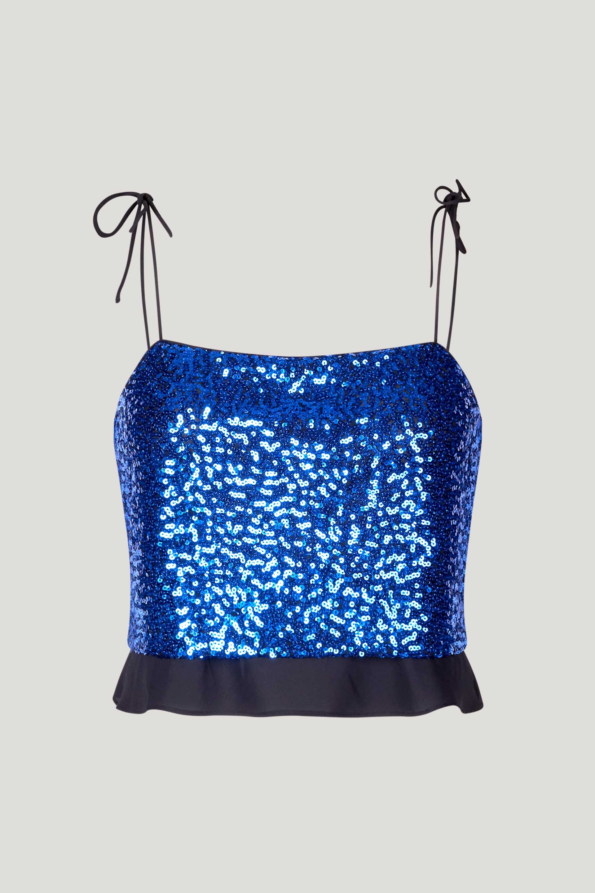 This stretchy, sequinned spaghetti-strap crop top features shoulder straps that tie. The top has a mesh lining that is slightly longer than the top layer.