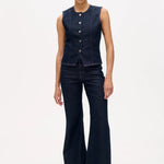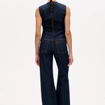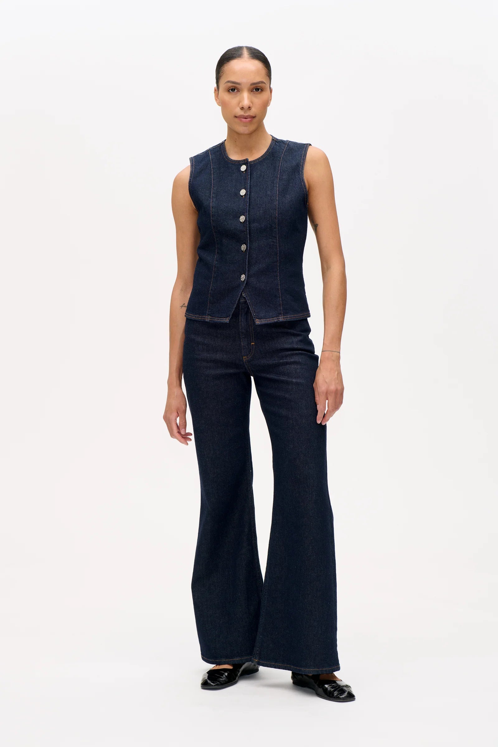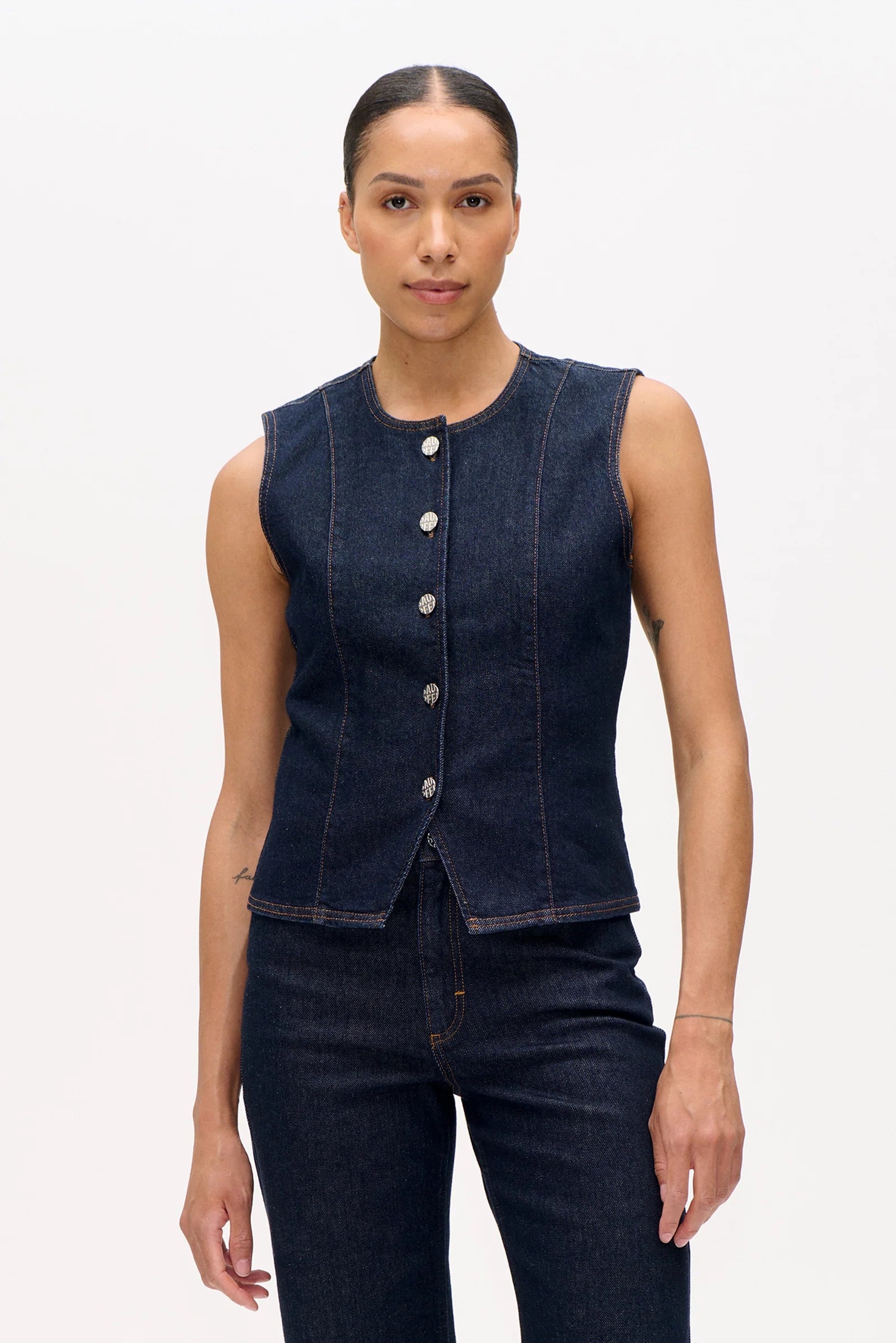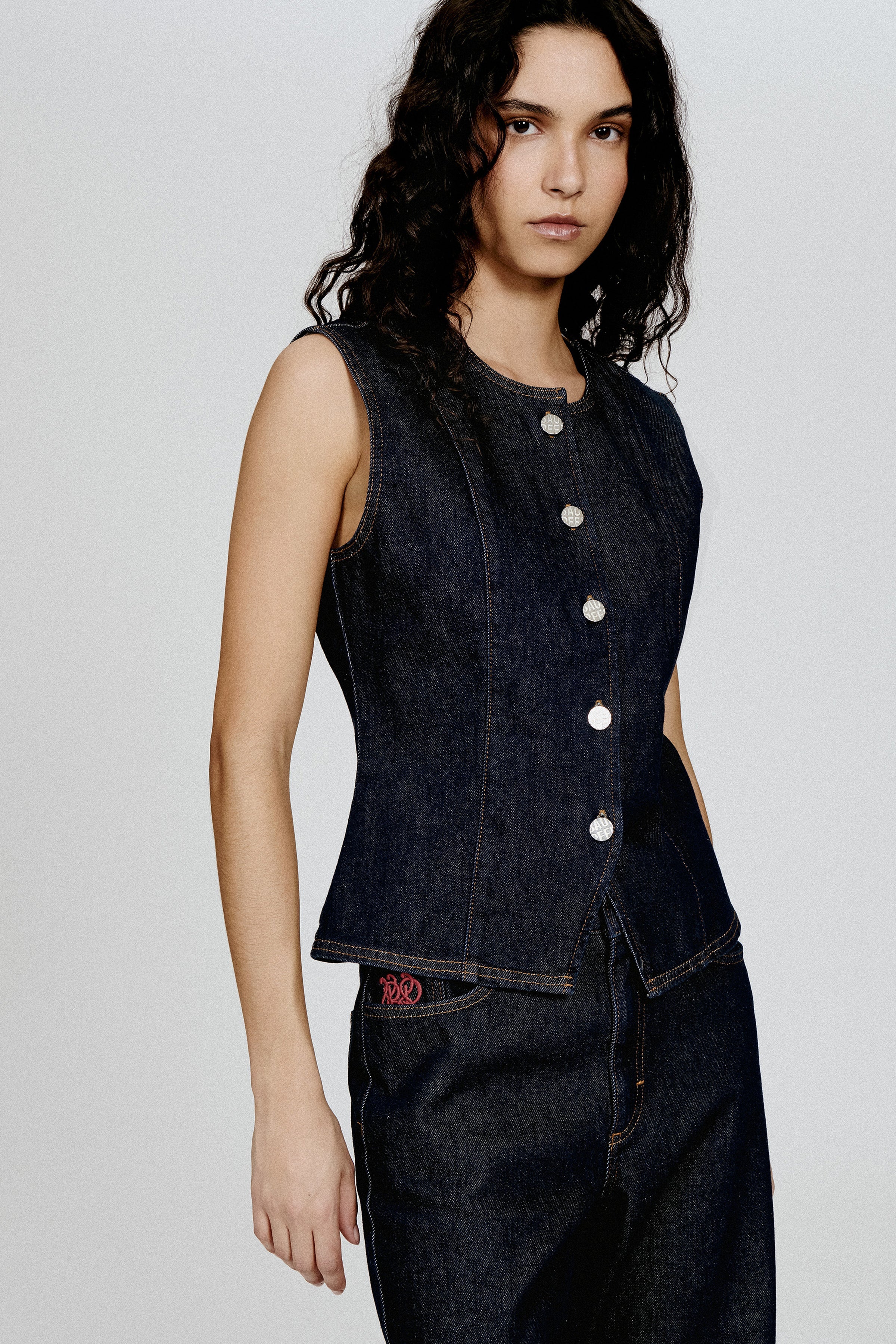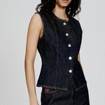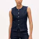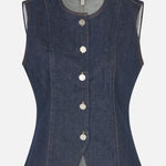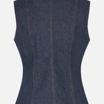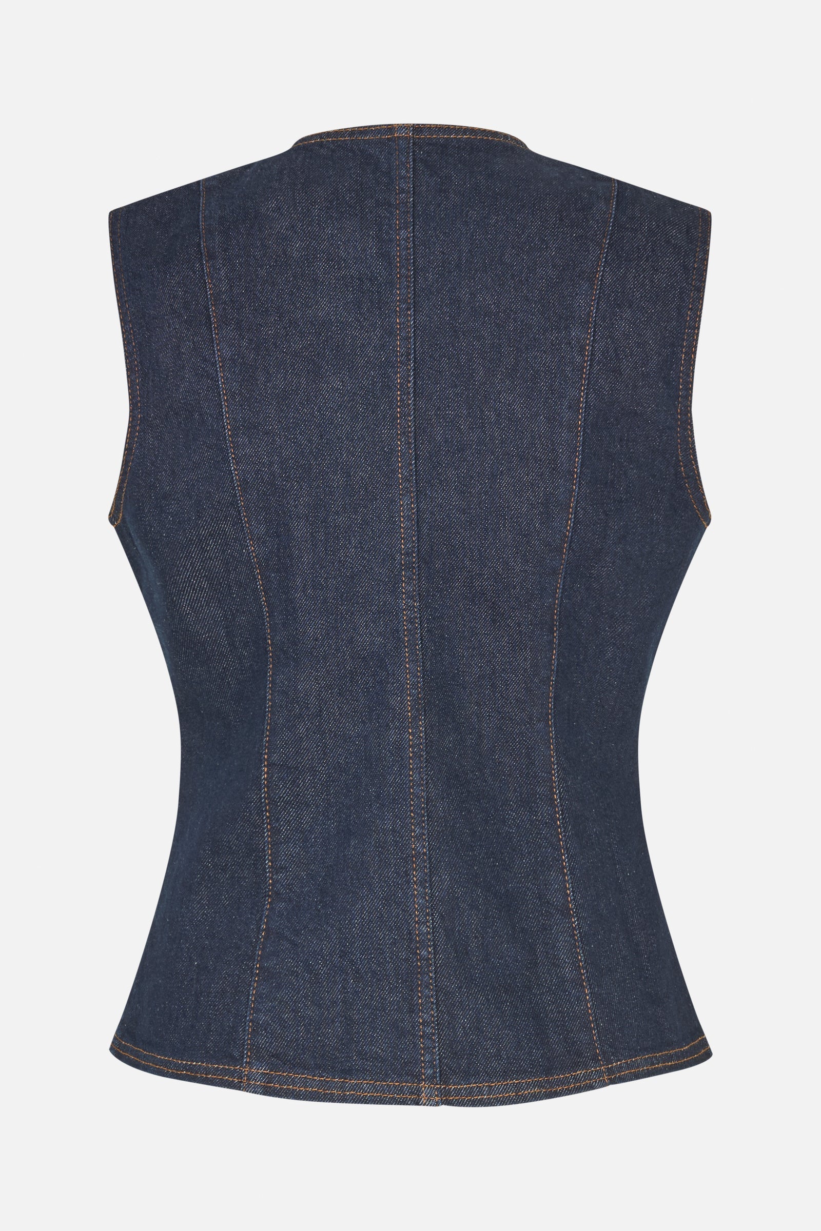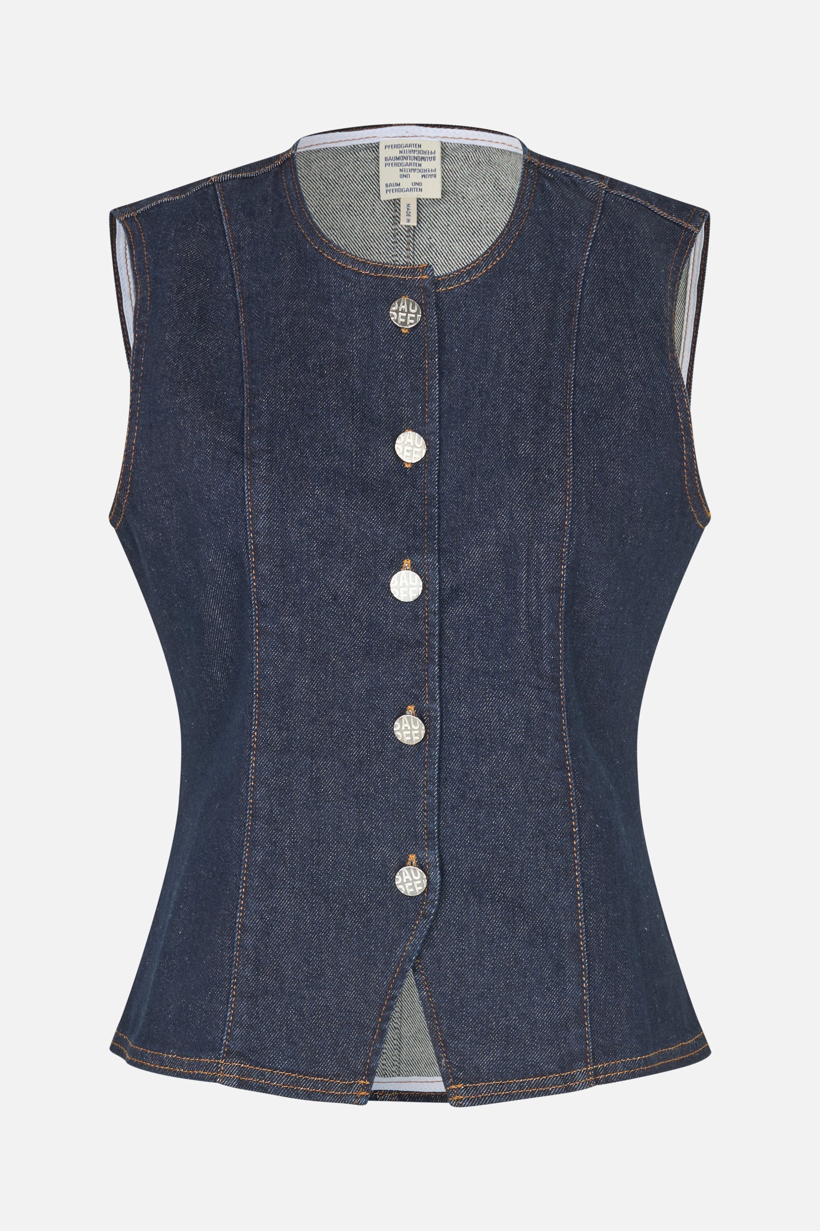 The Mene Top is a true denim classic made in organic cotton. The tailored denim waistcoat has a fitted silhouette with crew neck and classic button closure for a refined yet timeless design.