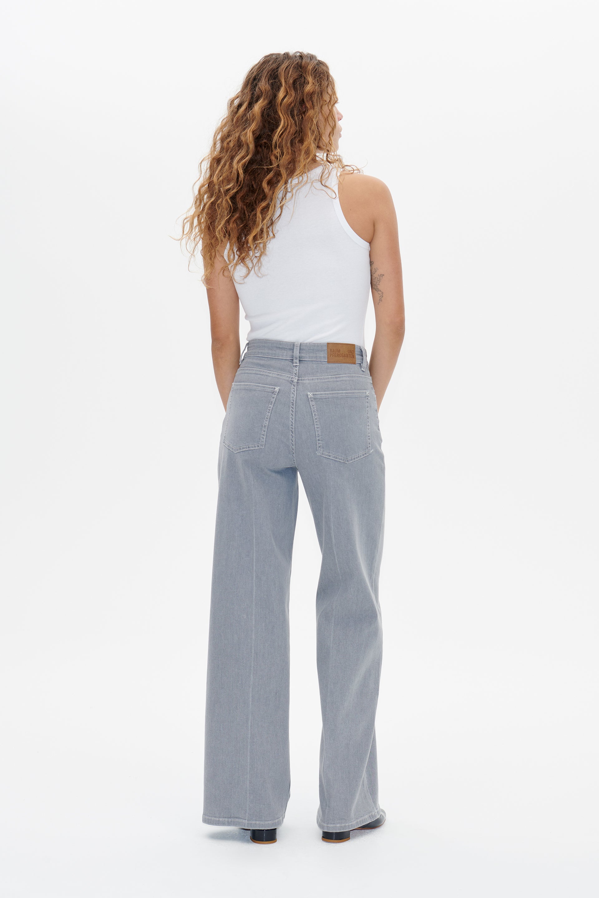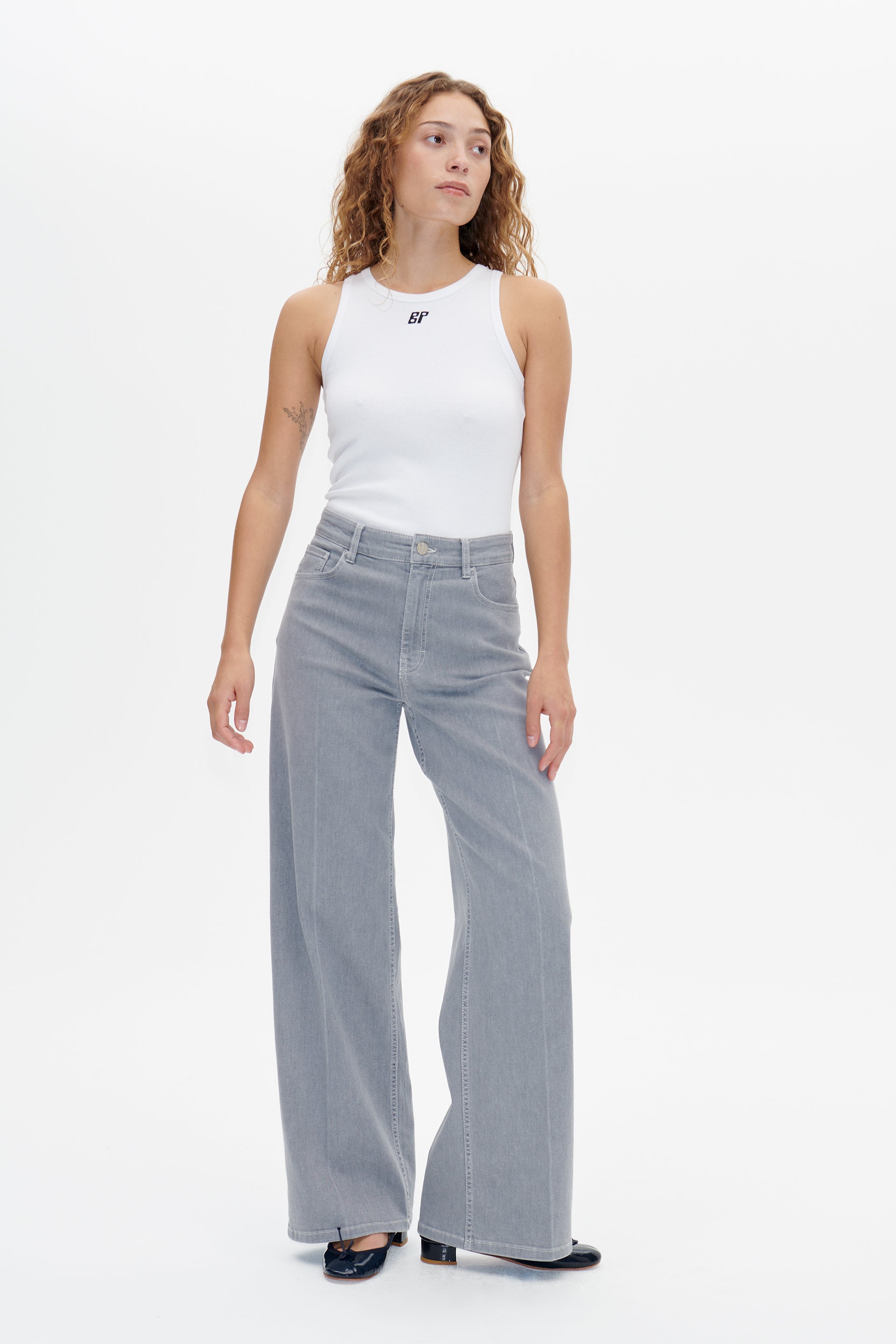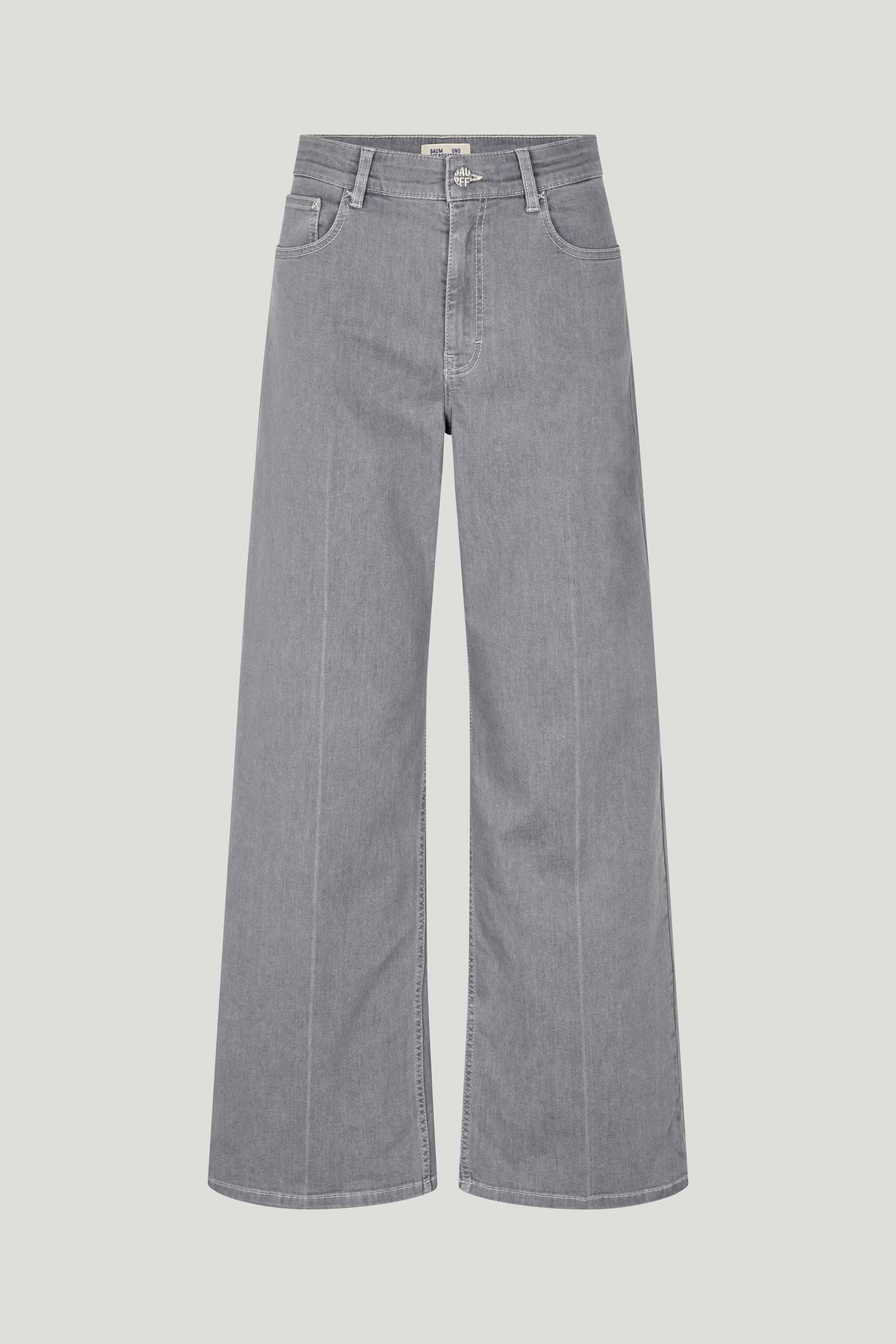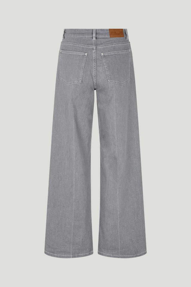 These high-rise, wide-leg jeans feature a zip fly with button closure and five pockets. Comes in a washed grey.