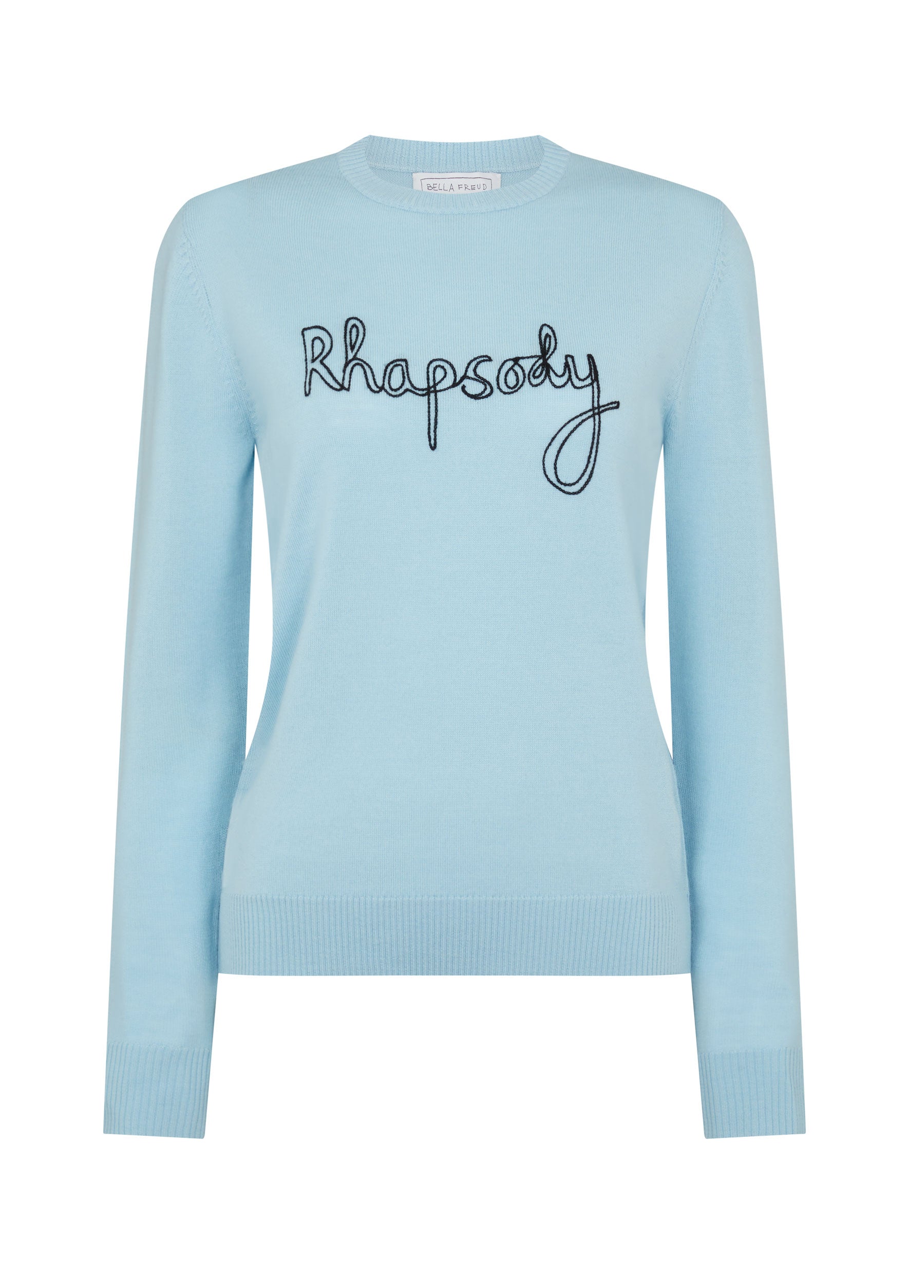 Thin knit in a light blue they call Fifth Elment Blue. It has a tight/regular fit with round crew neck, chainstitching and 'Rhapsody' written on the front.
