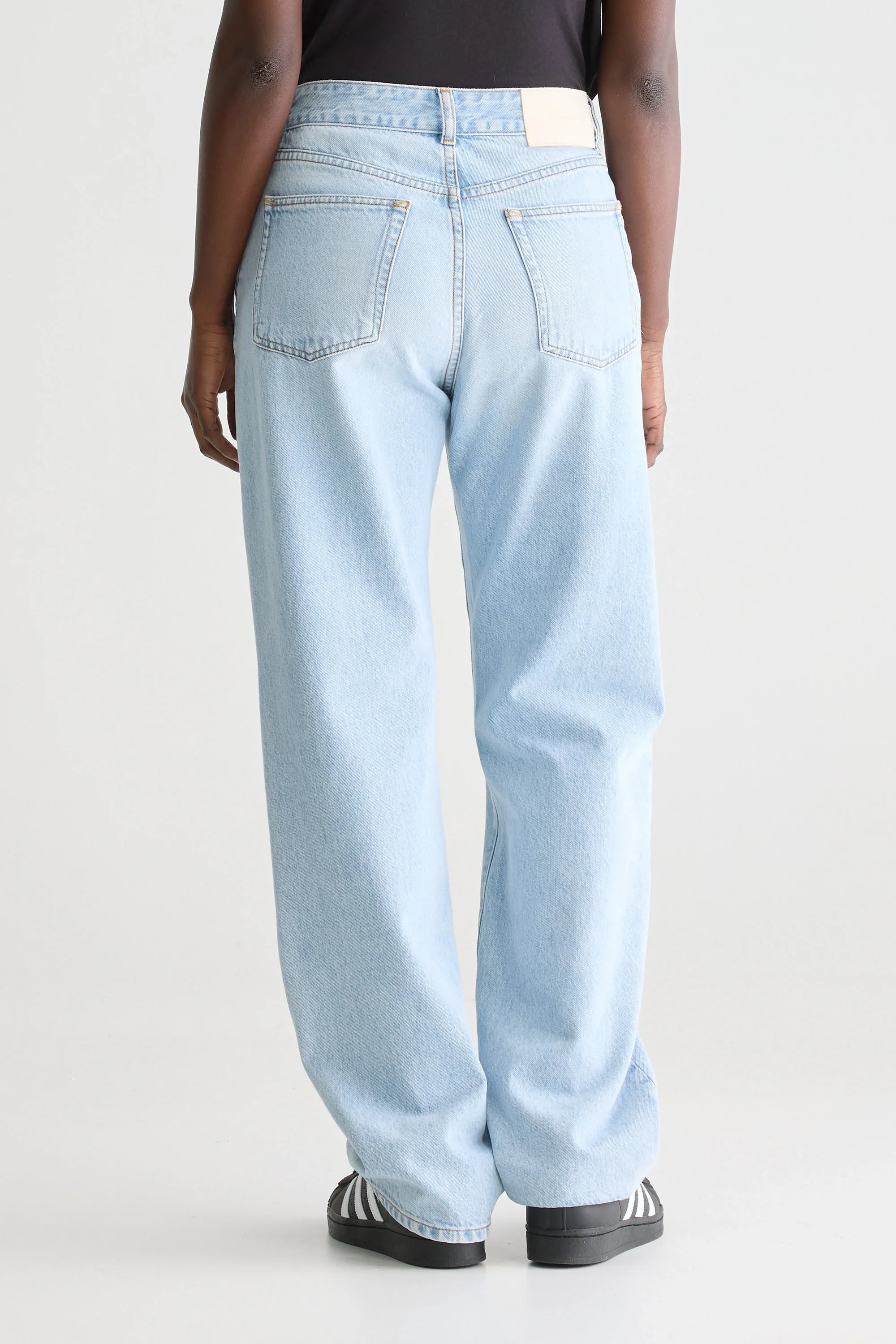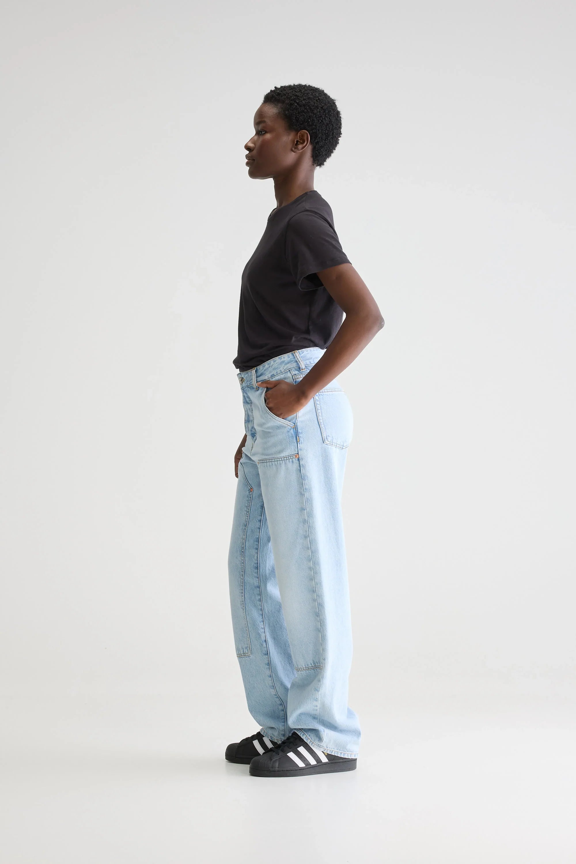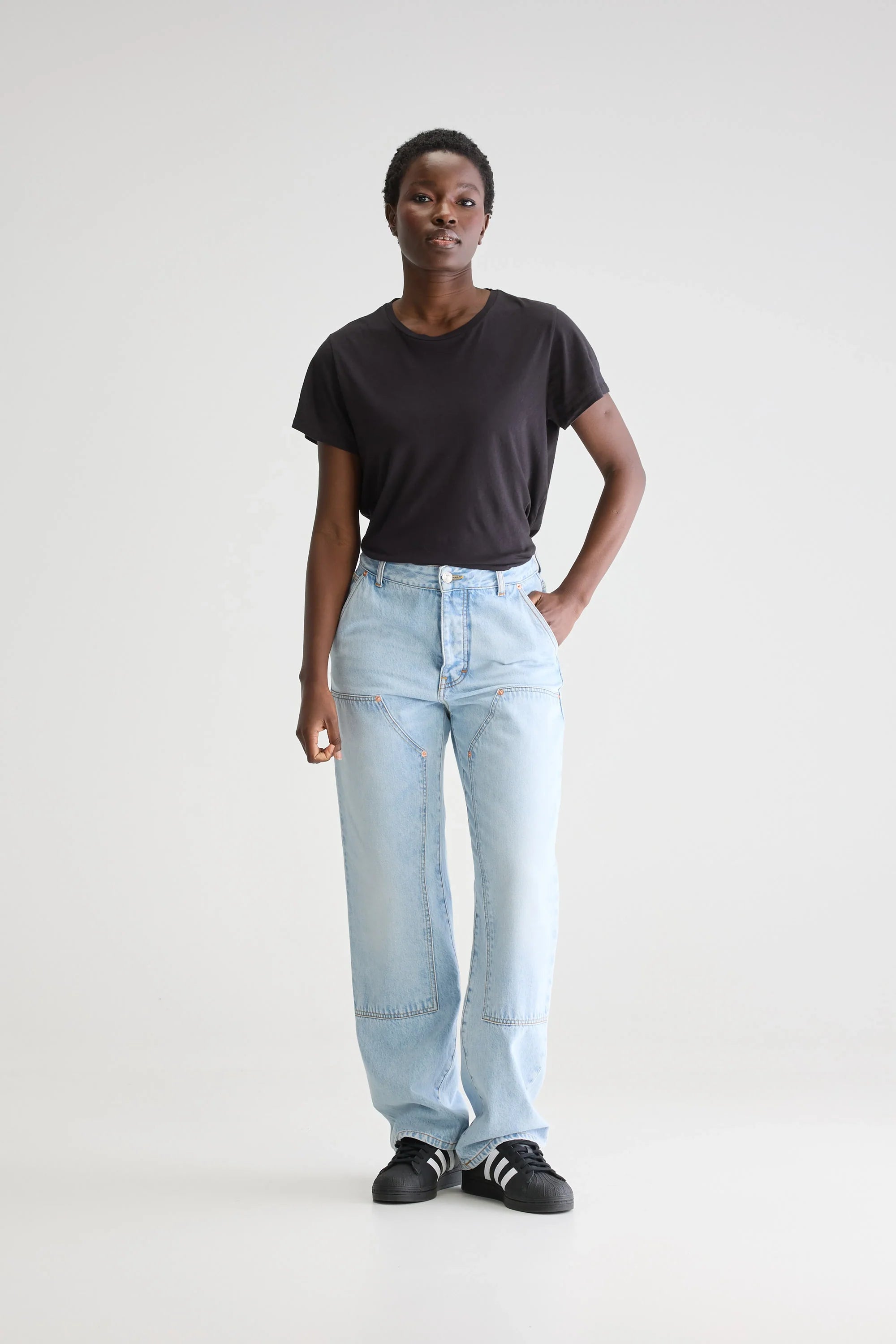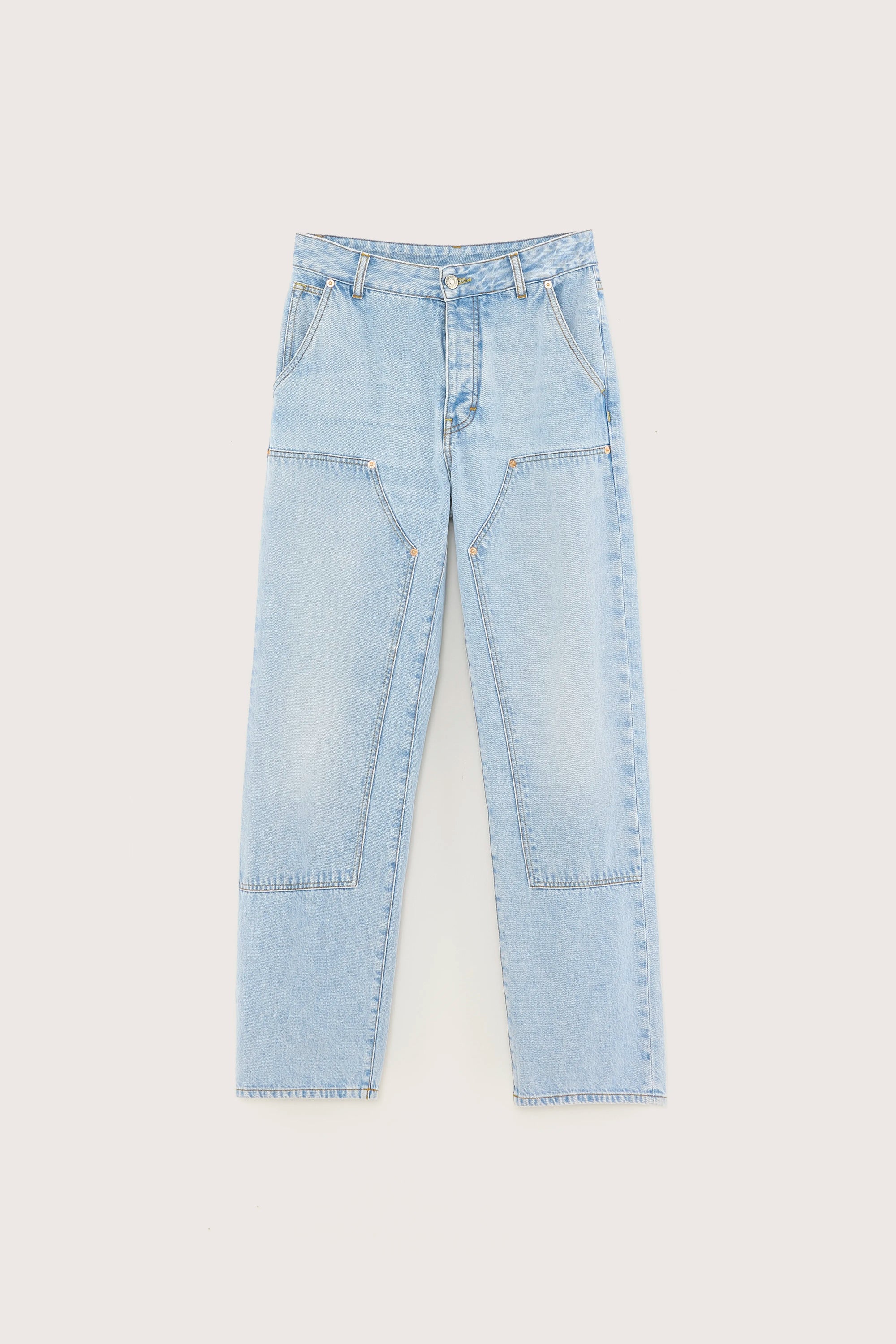 Relaxed carpenter-style mid-rise jeans with riveted patches on the front and slanted pockets made from used blue cotton denim.