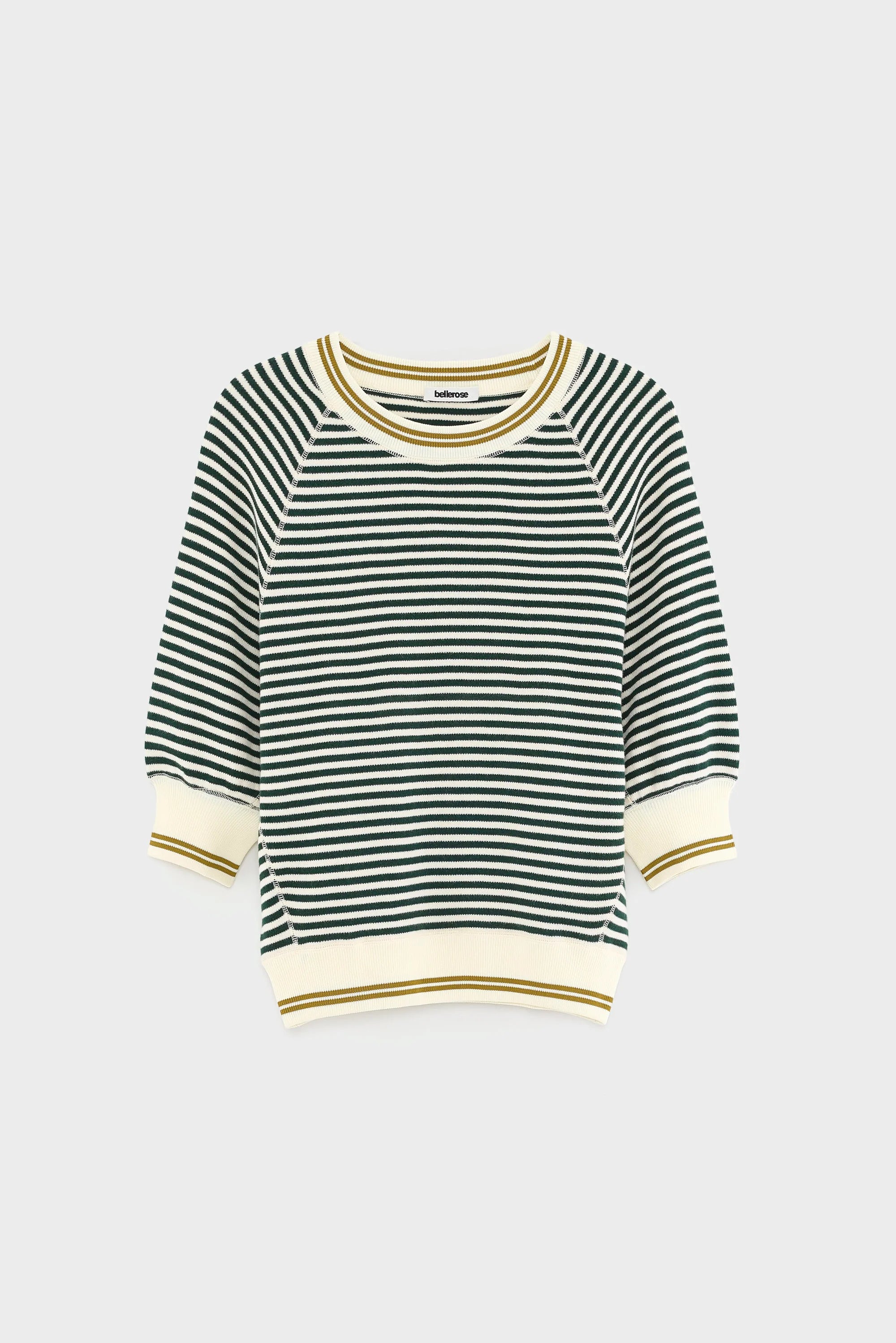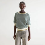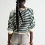 Oversized crewneck sweater in ecru cotton with fine bottle green stripes, featuring 3/4 sleeves, ribbed edges and contrast mustard detail at collar and hem.