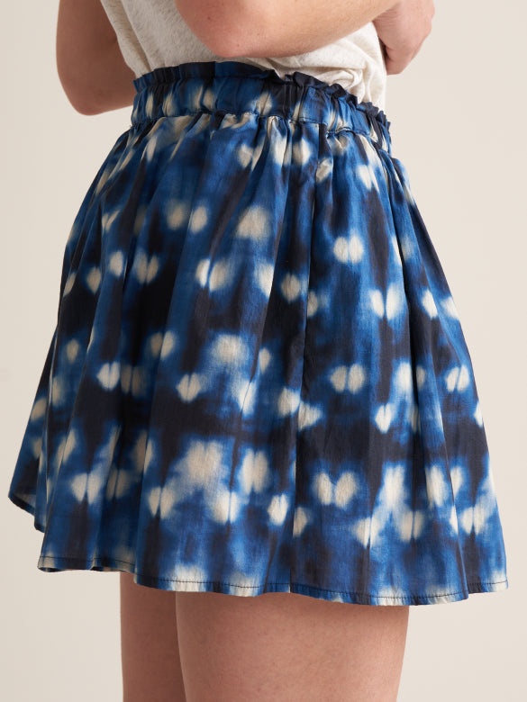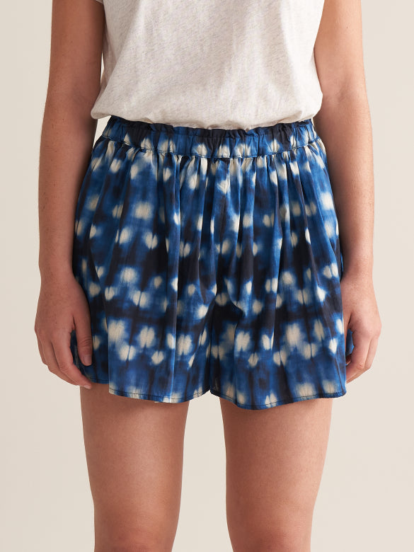 The Austral shorts are designed with a lot of volume and ease. They feature a wide elastic waistband and wide, short legs. The blue, navy and white print floats into each other reminding us of the ocean in summertime.