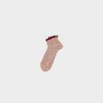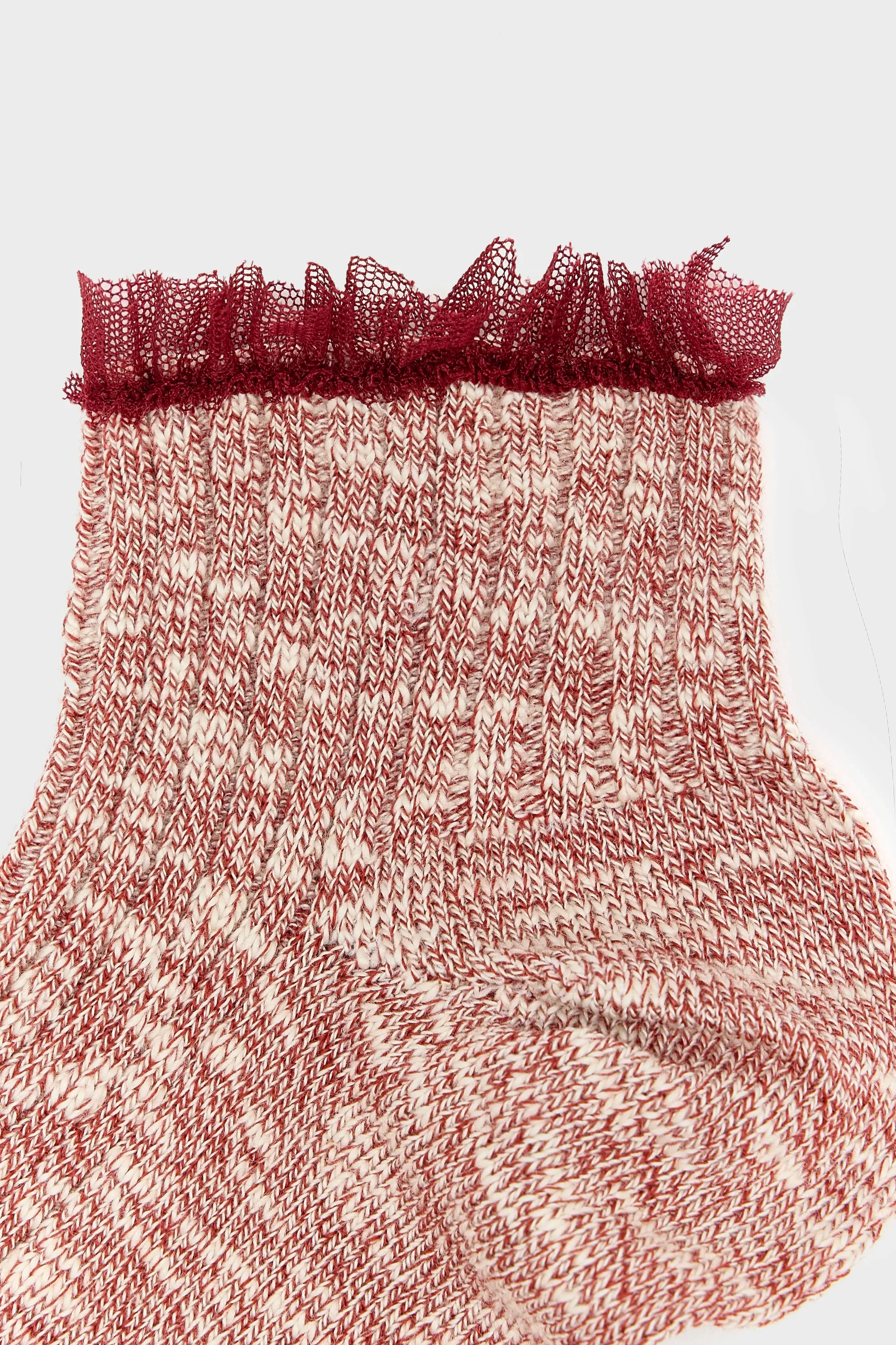 Ribbed ankle socks in red-and-white marl with delicate burgundy ruffle trim at the cuff.