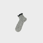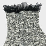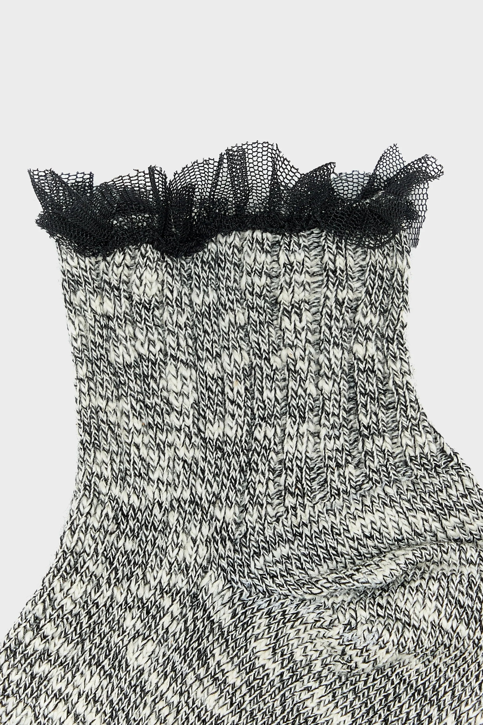 Ribbed ankle socks in black-and-white marl with delicate black ruffle trim at the cuff.