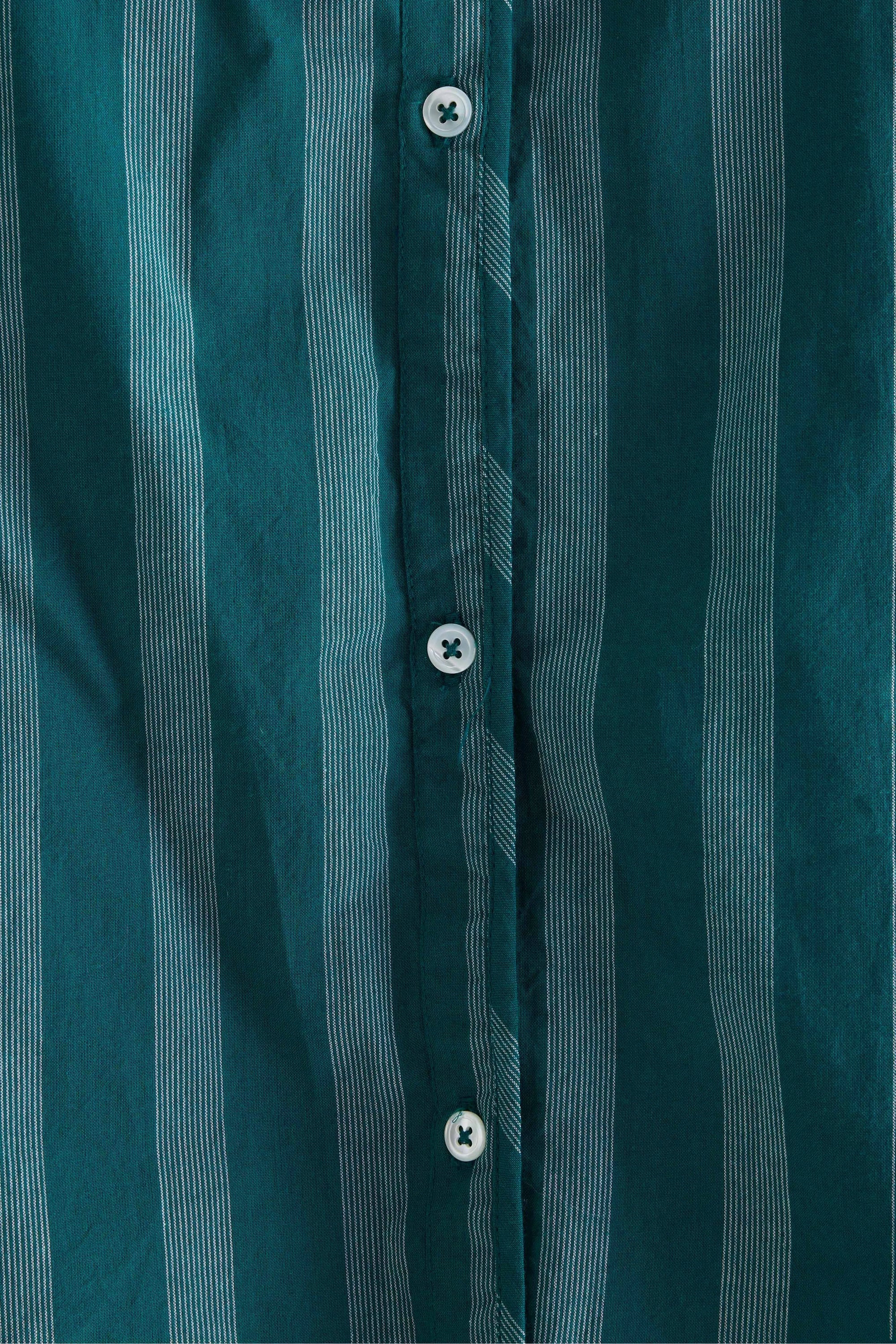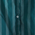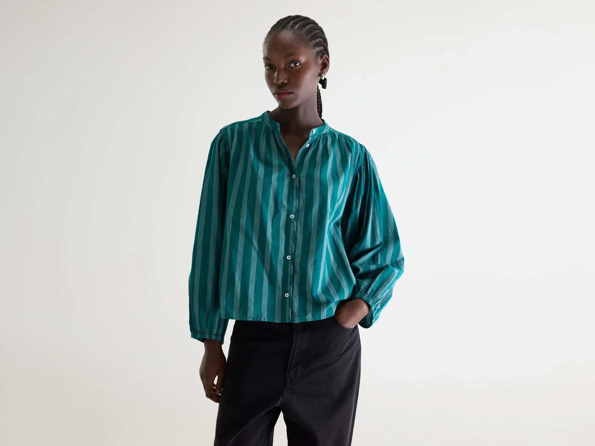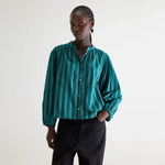 Relaxed striped blouse in emerald green with lighter green vertical stripes, featuring gathered shoulders and long puffed sleeves with elasticated cuffs.