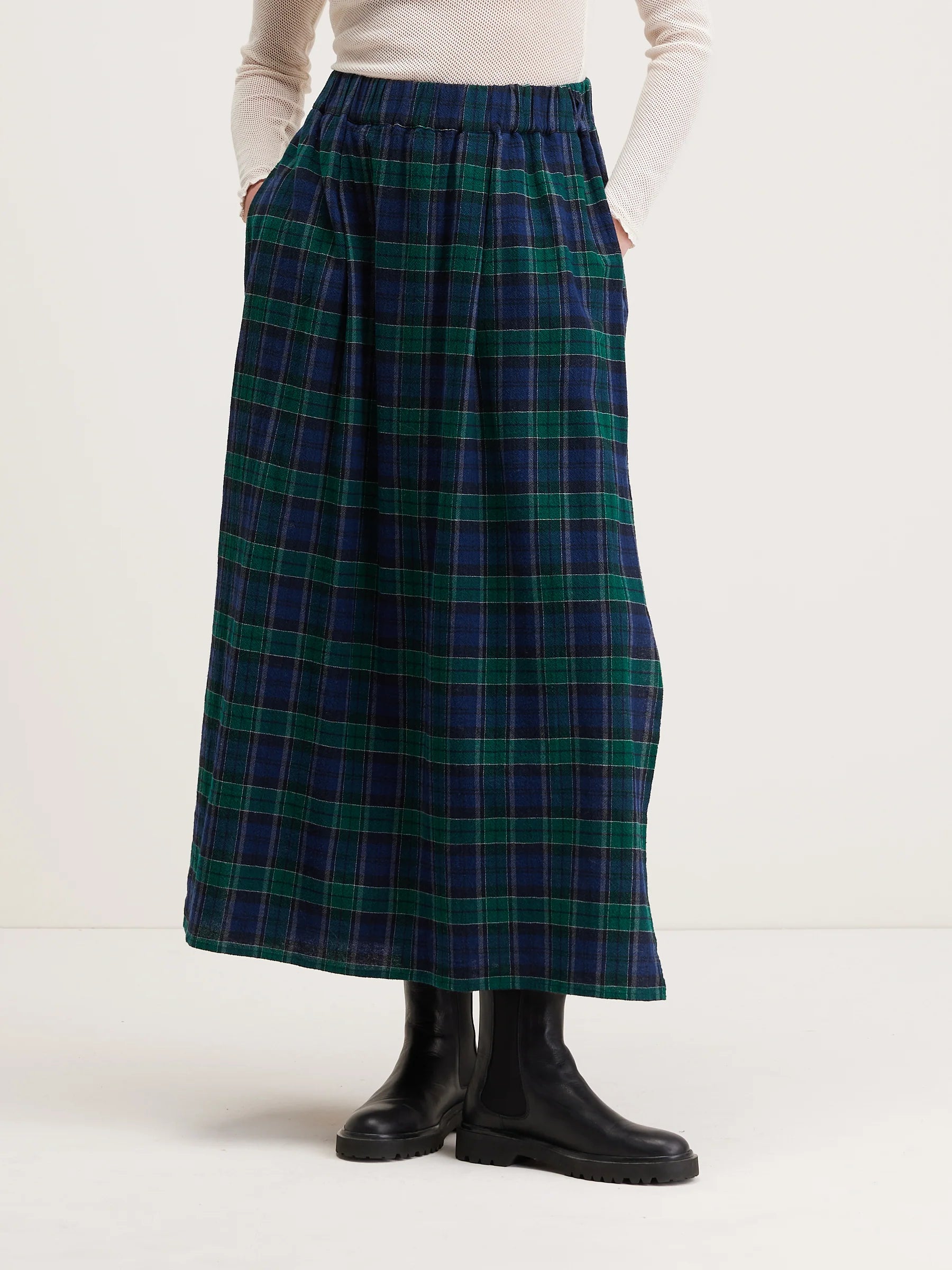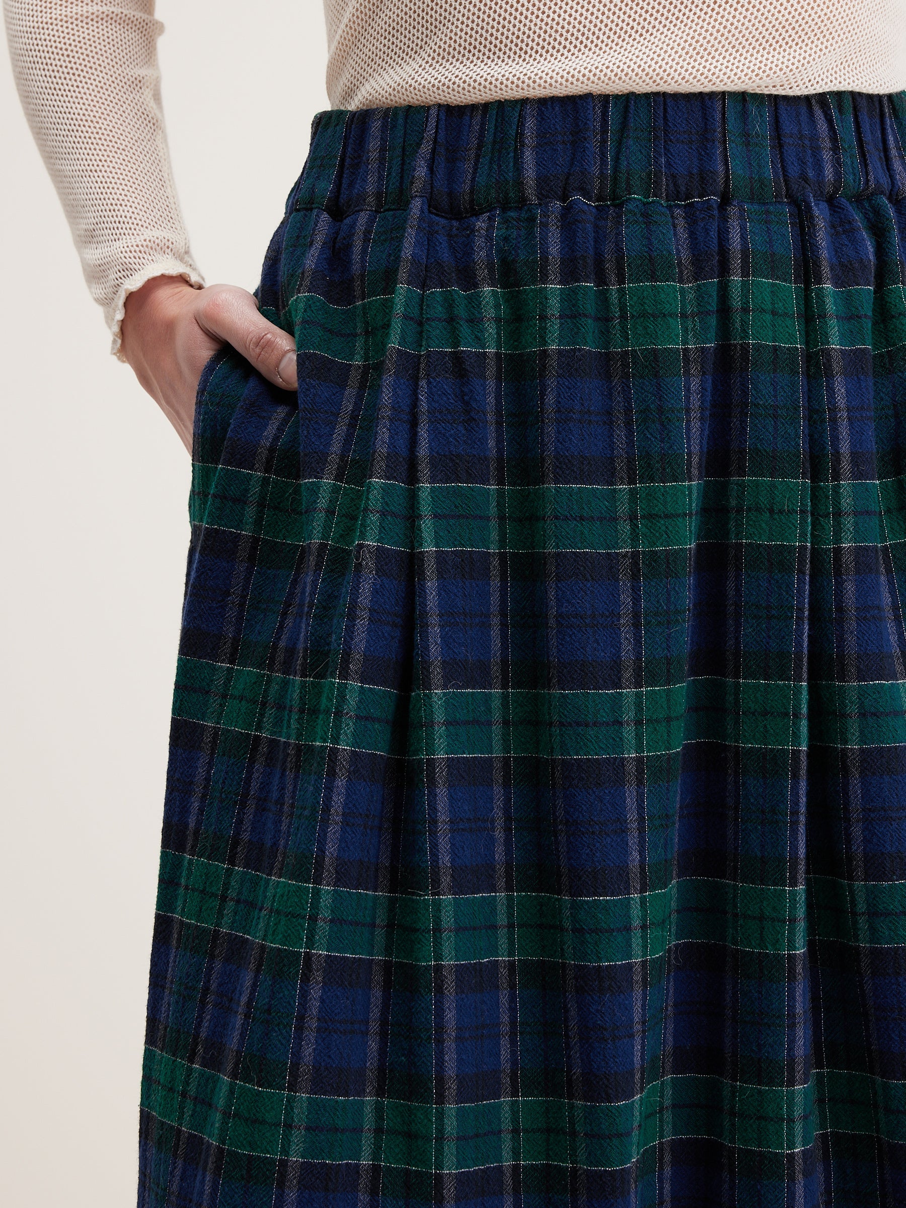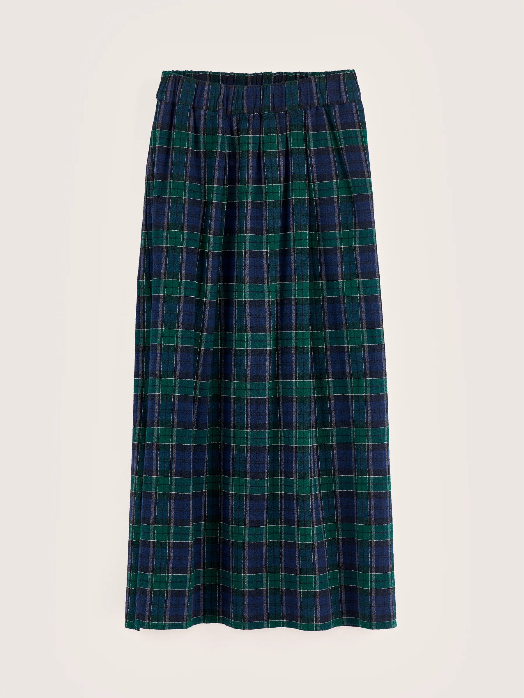 Long elastic waist skirt in black watch cotton veil with long side slits.