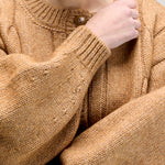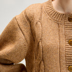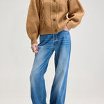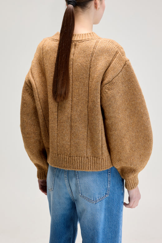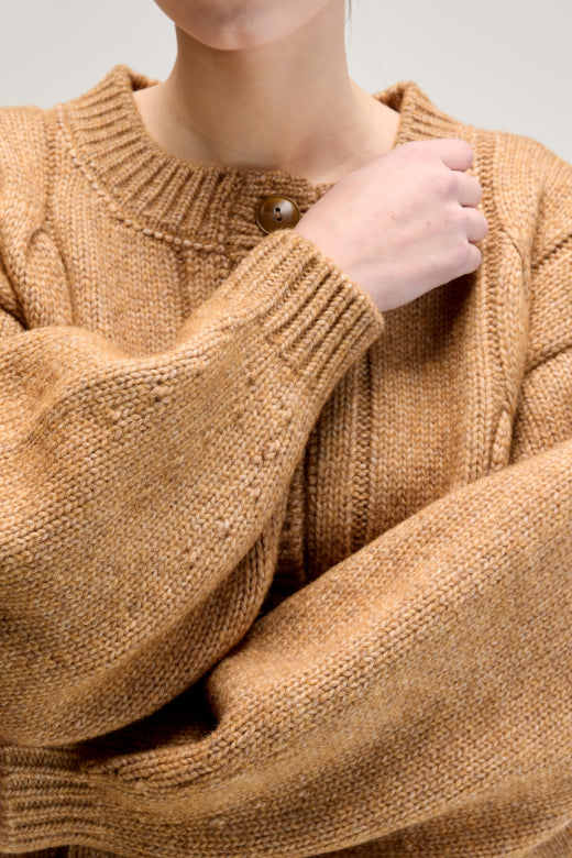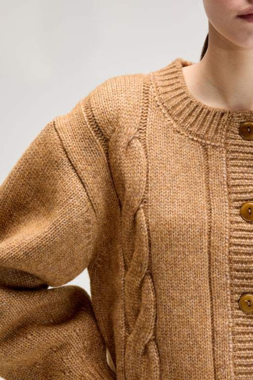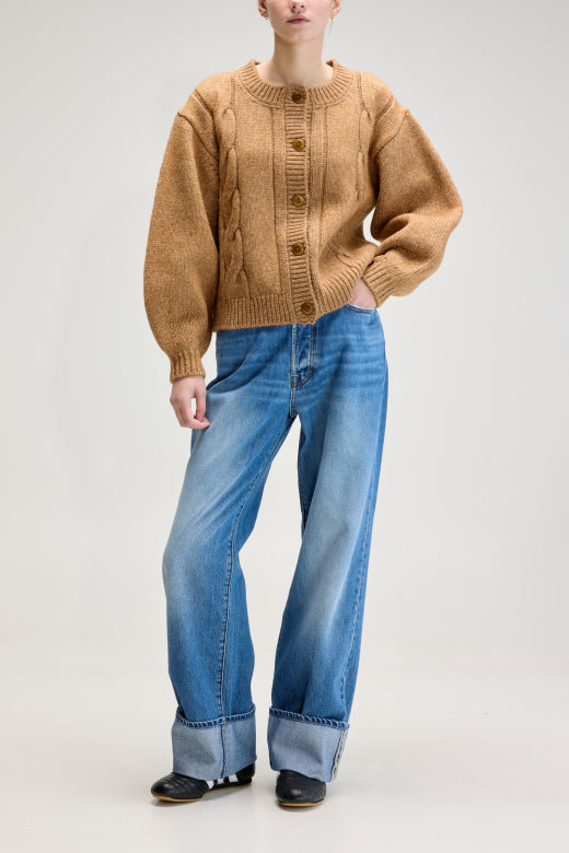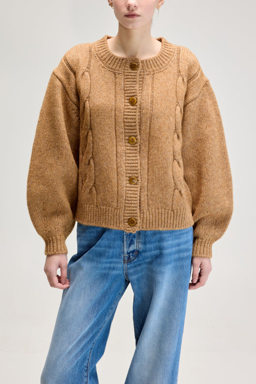 Crew neck cardigan with button closure and voluminous balloon sleeves.