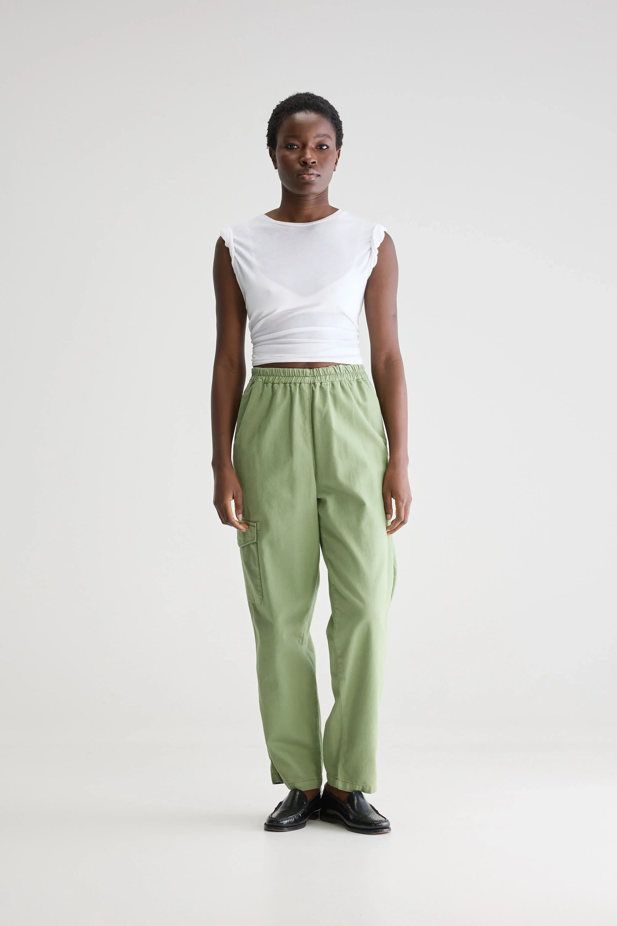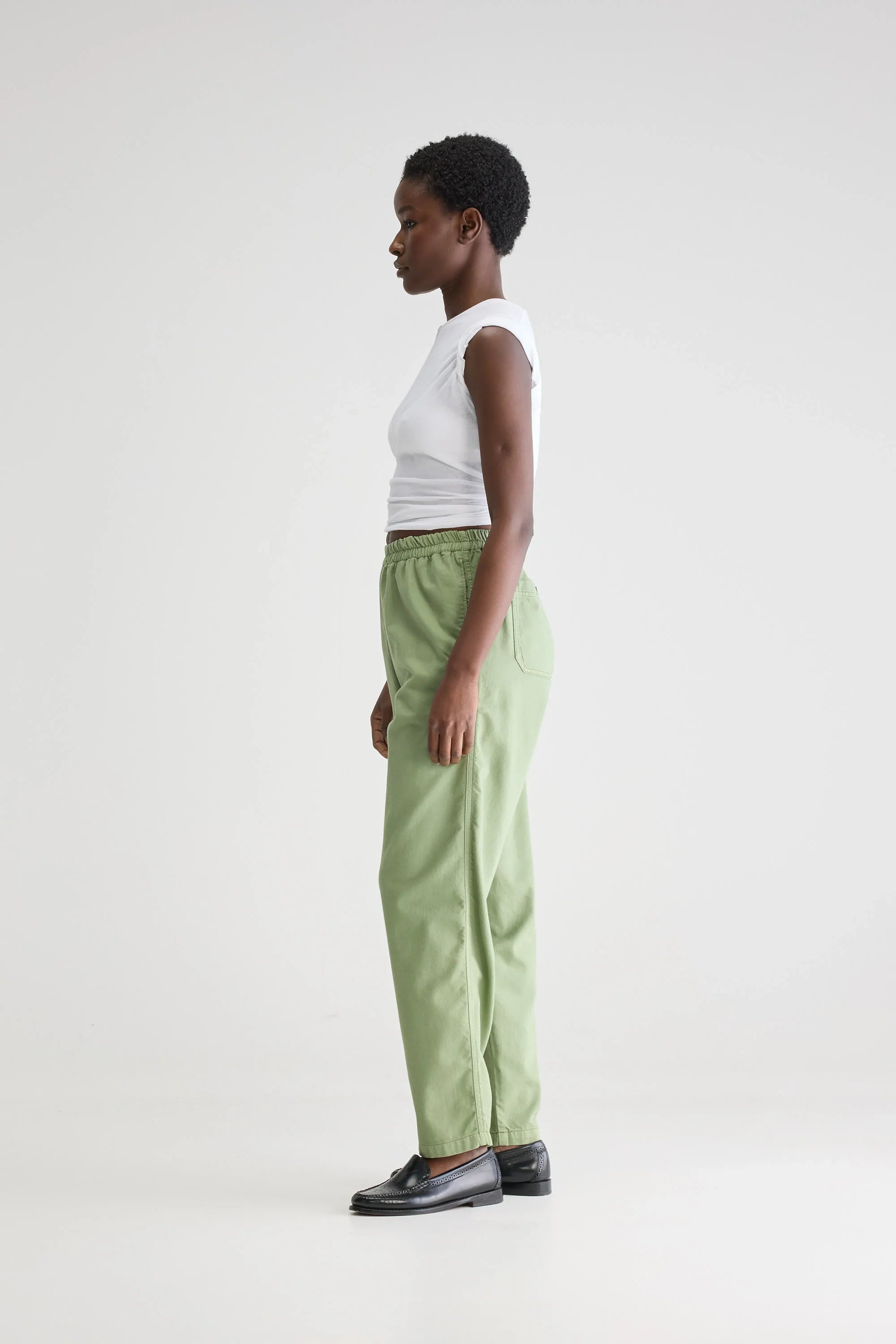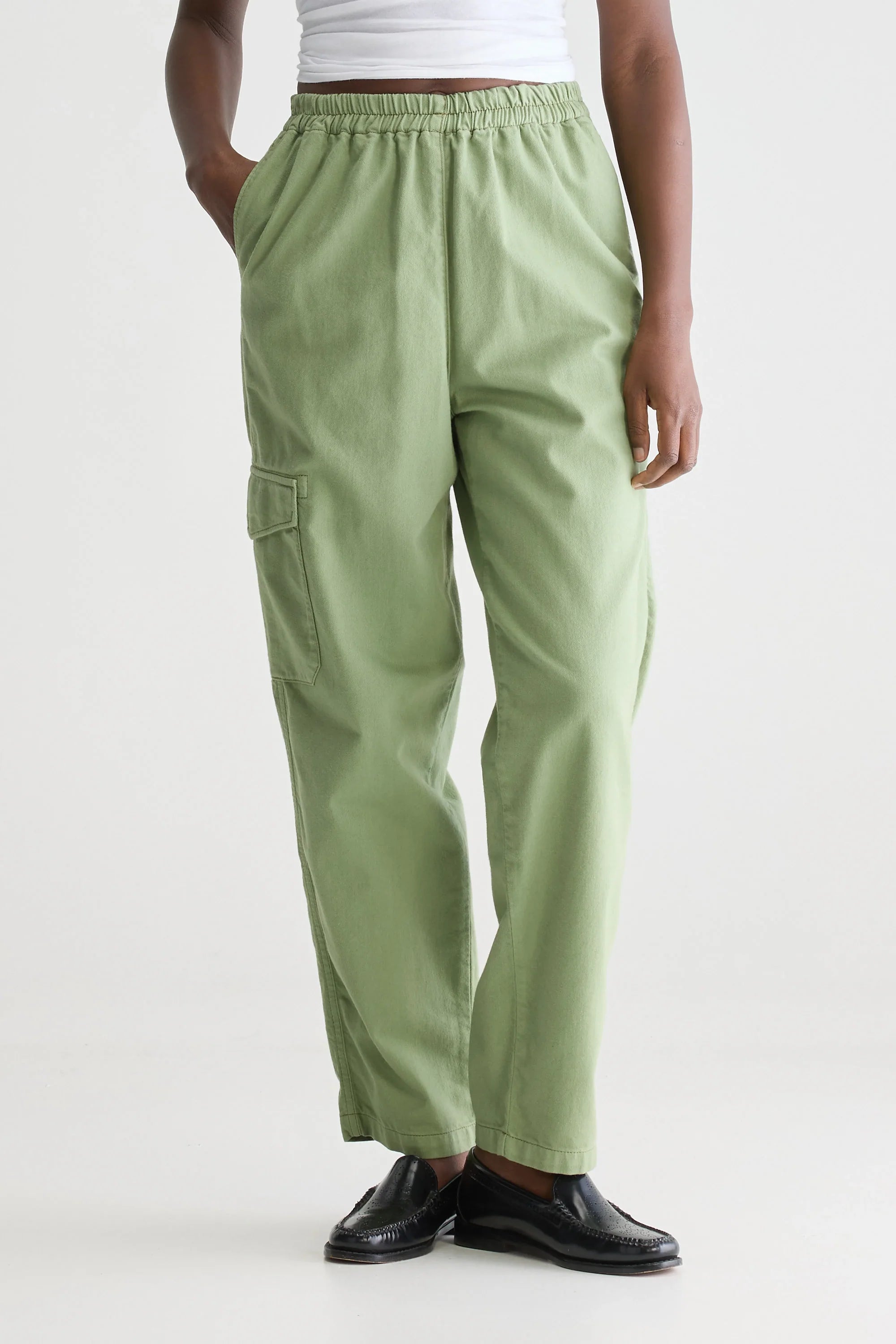 Regular worker trousers with elastic waist, straight legs and an extra pocket on the leg made from sage green brushed twill cotton.