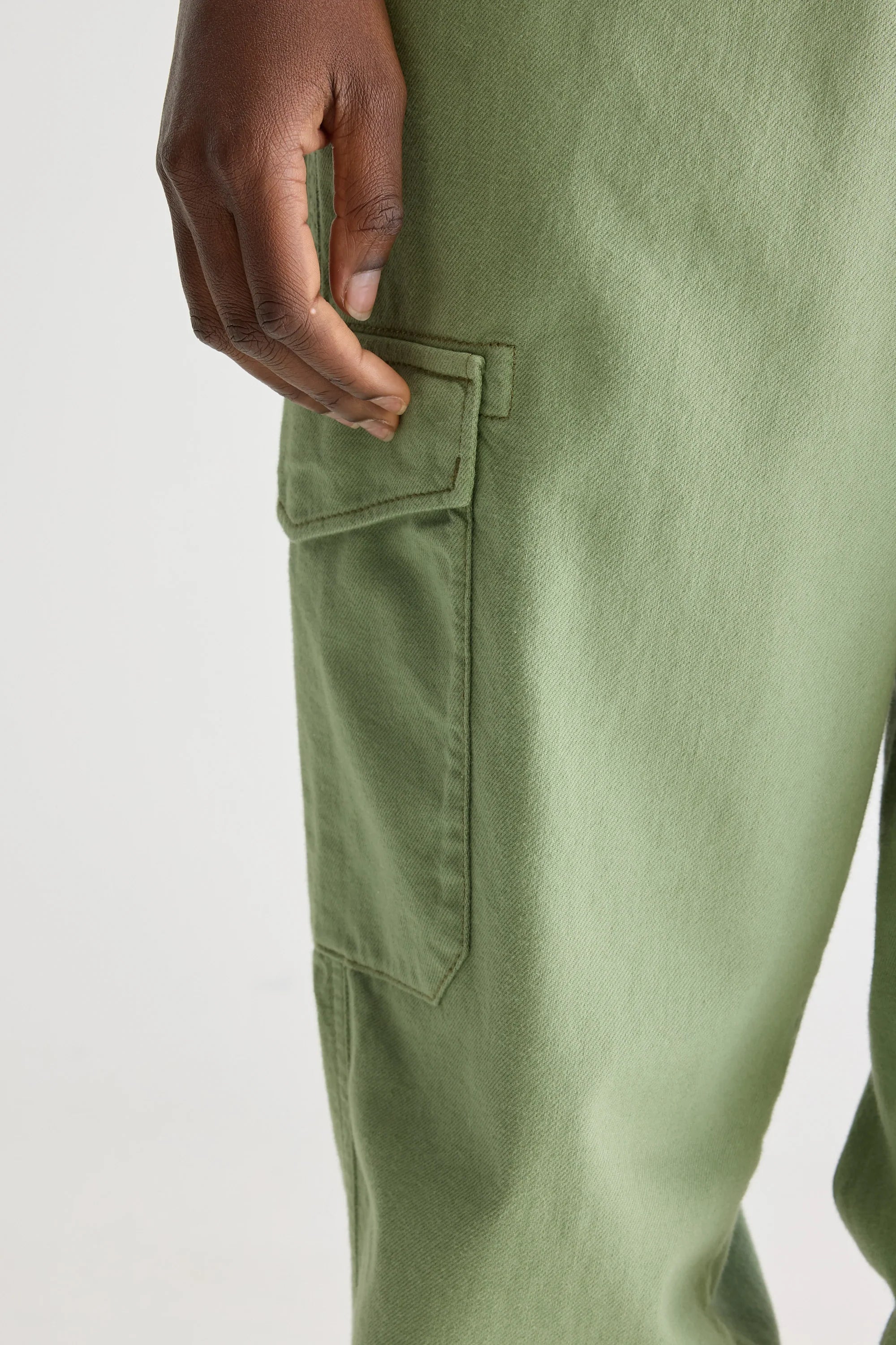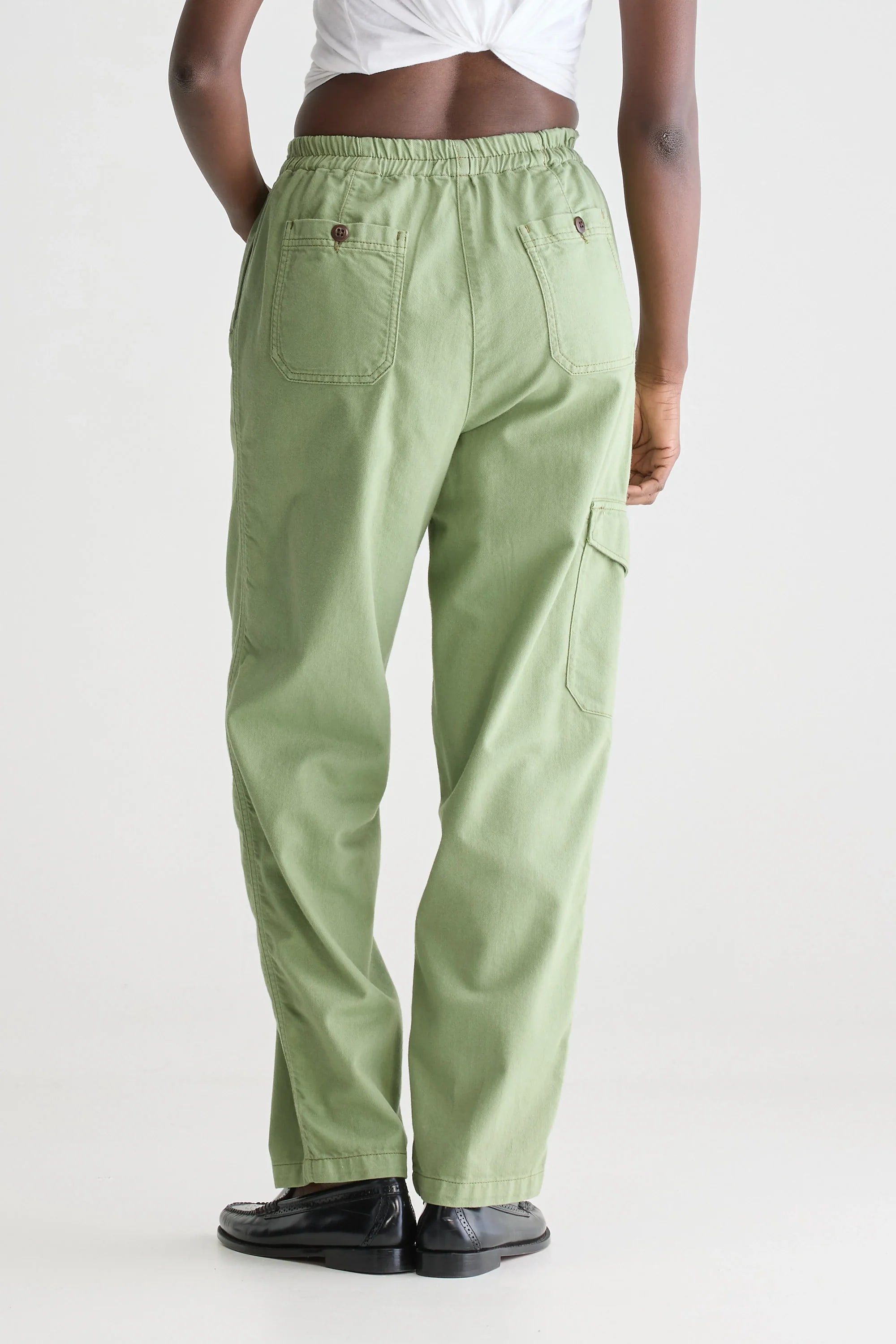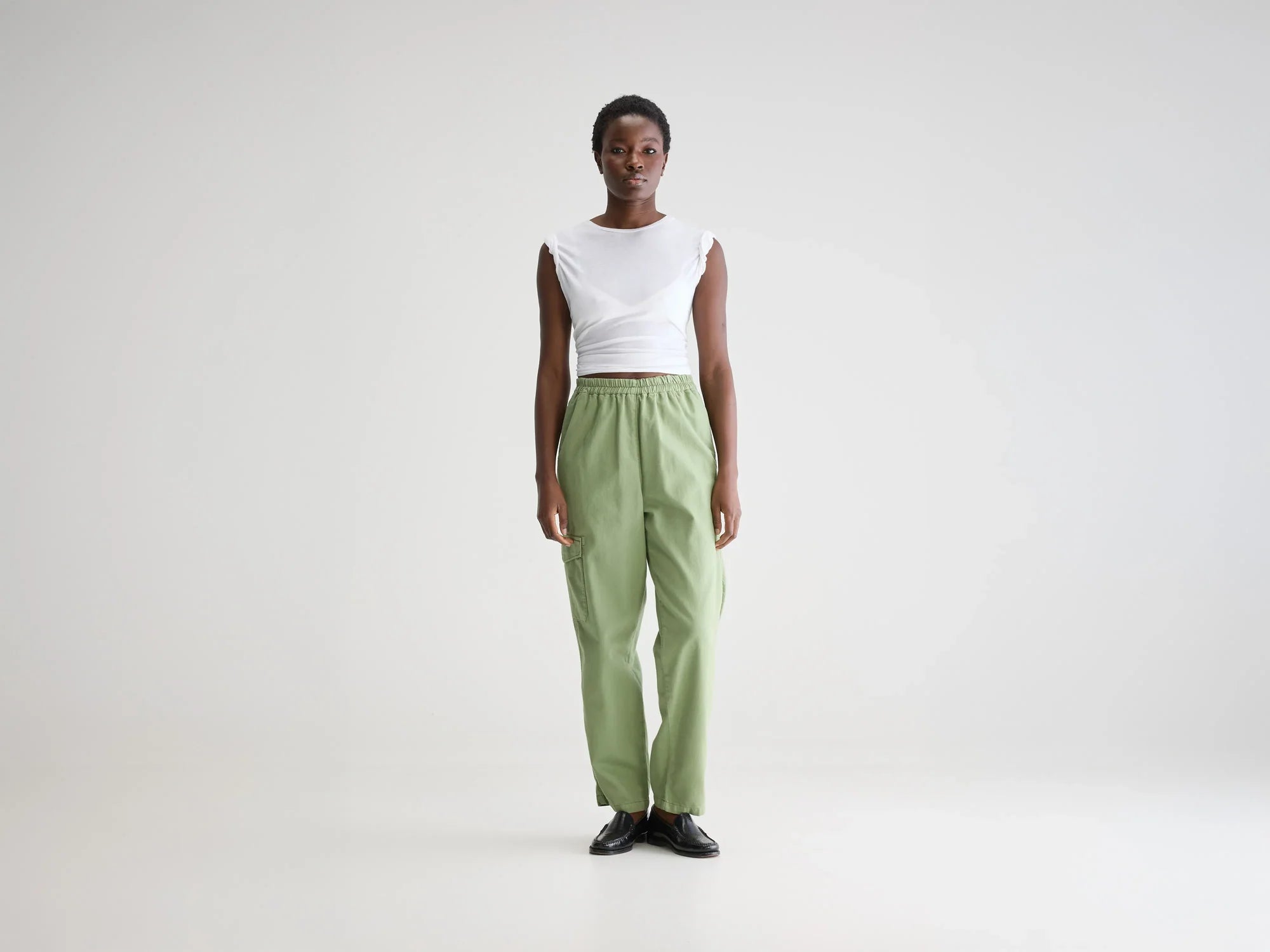 Regular worker trousers with elastic waist, straight legs and an extra pocket on the leg made from sage green brushed twill cotton.