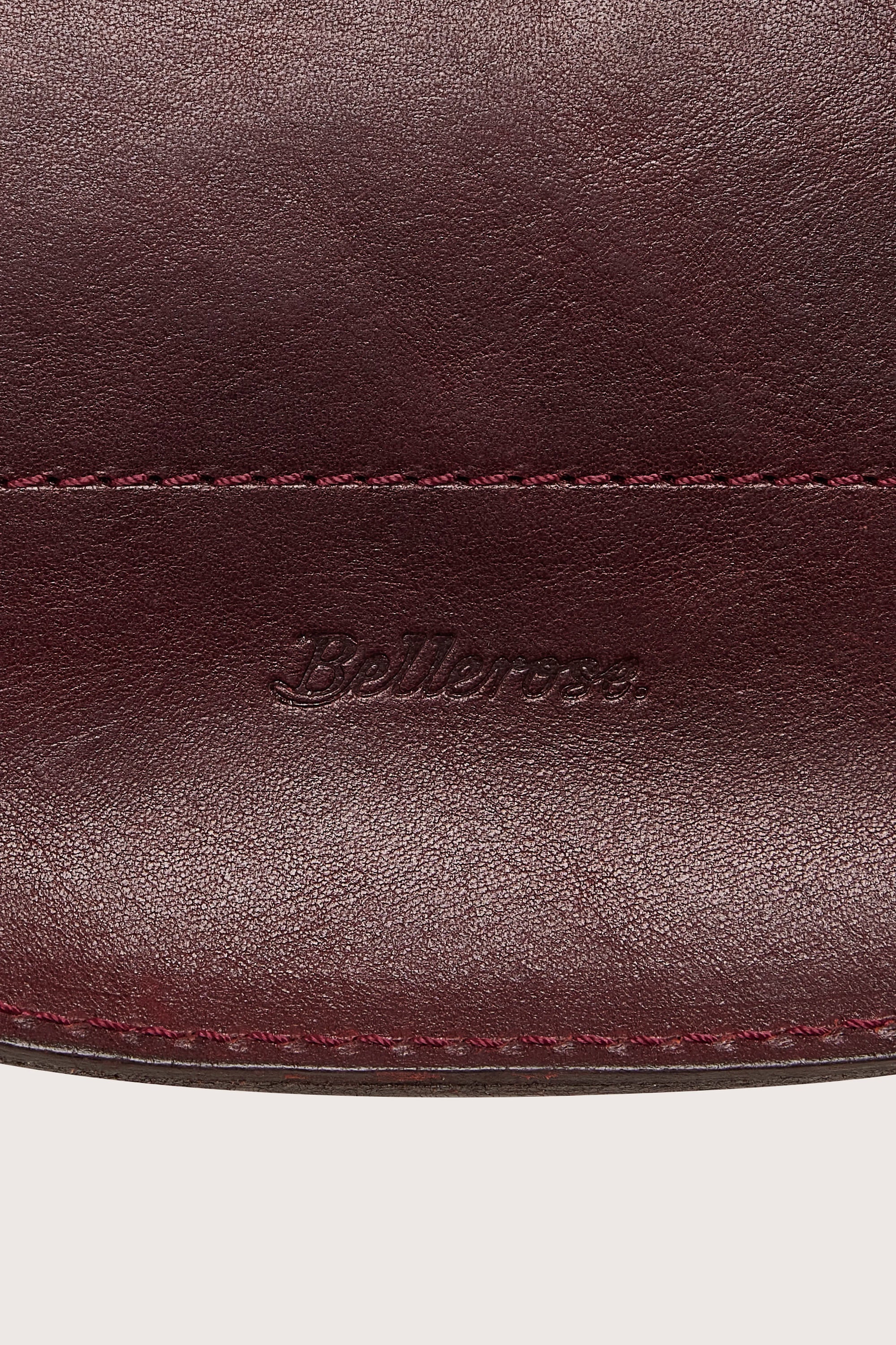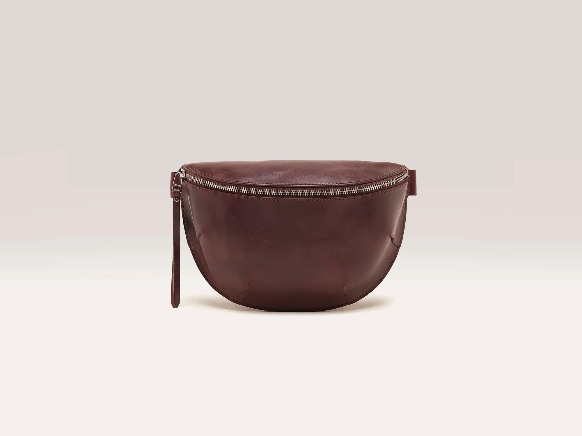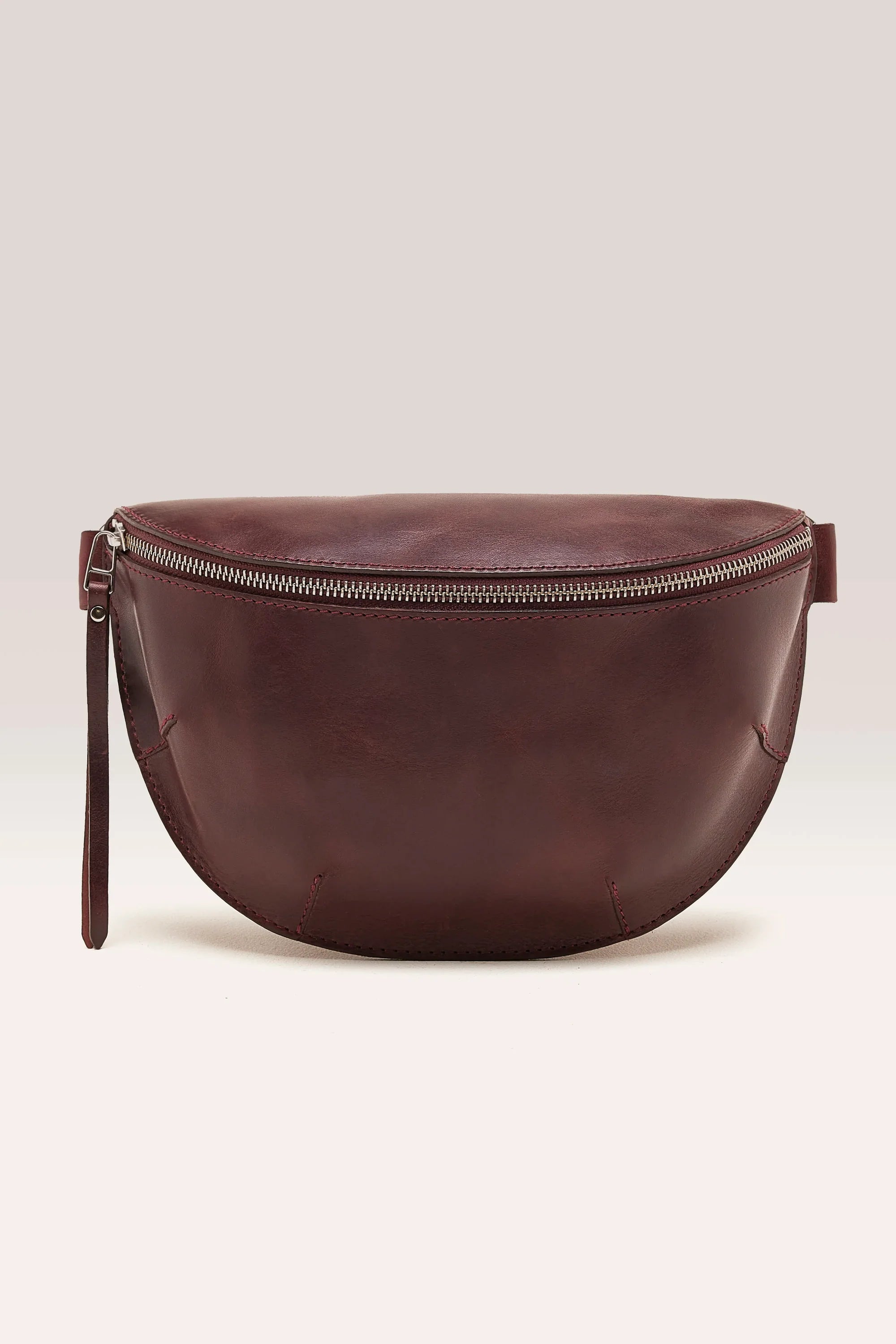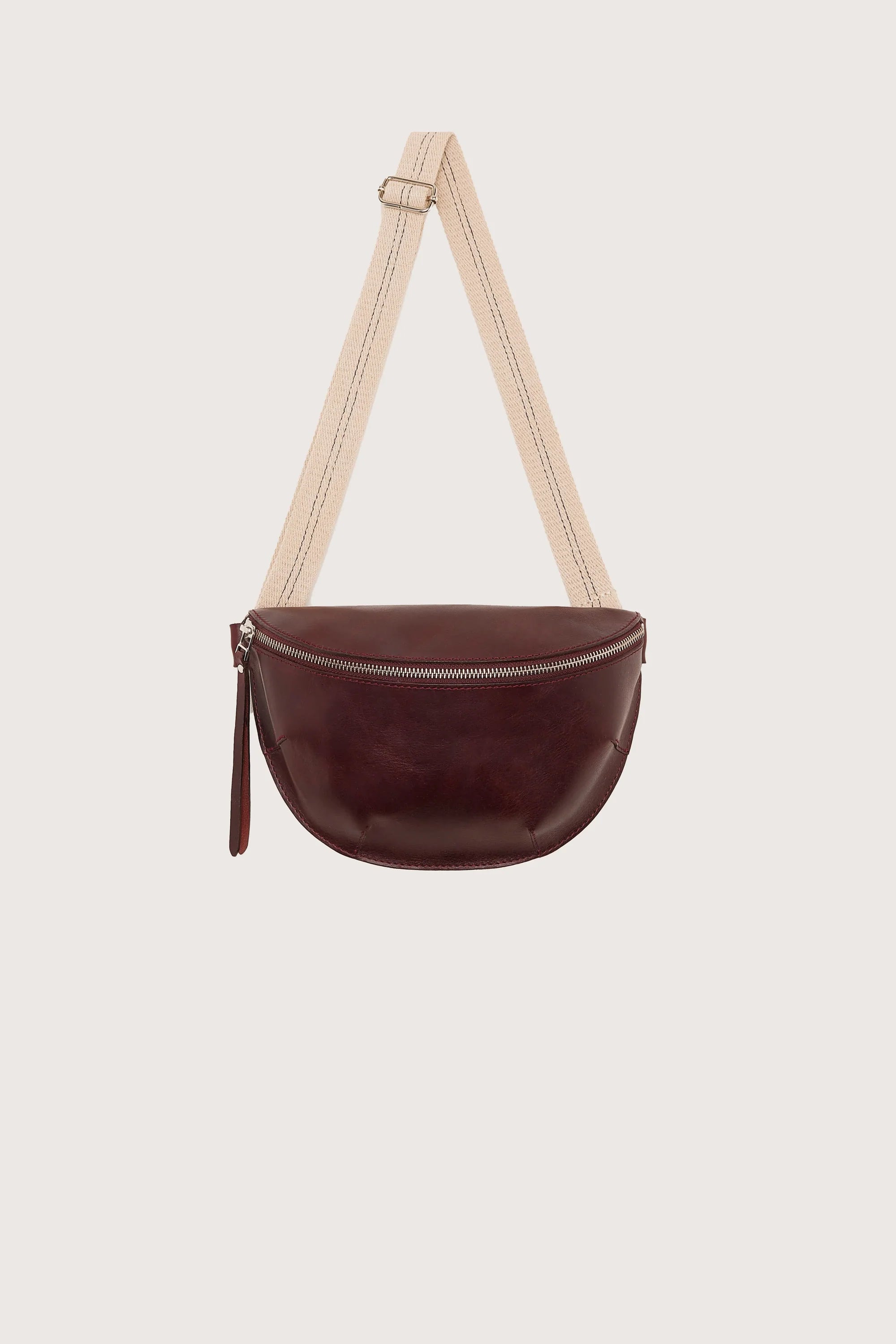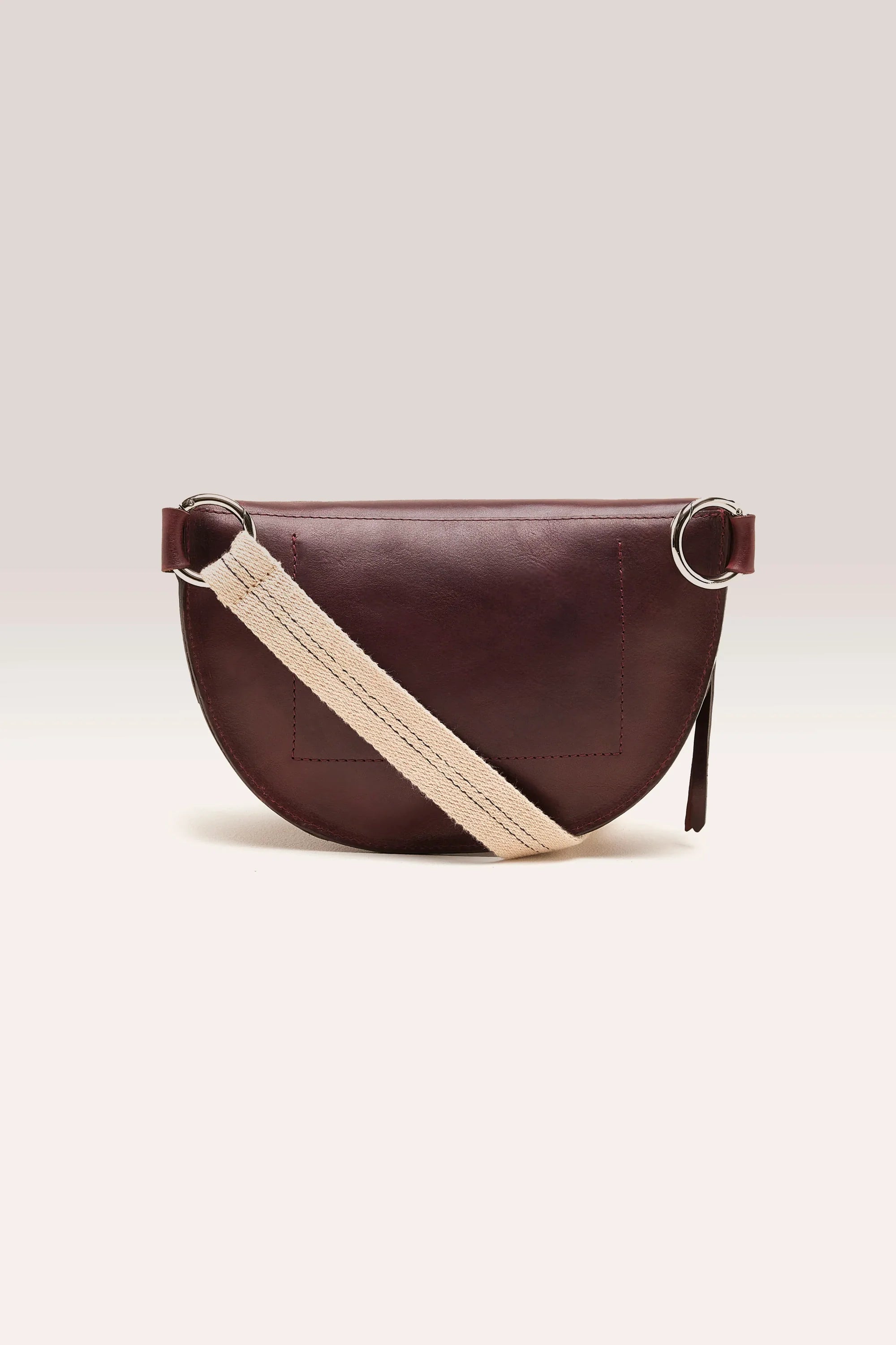 Half moon shaped sling-bag in smooth burgundy coloured leather with zip front and inside pocket.