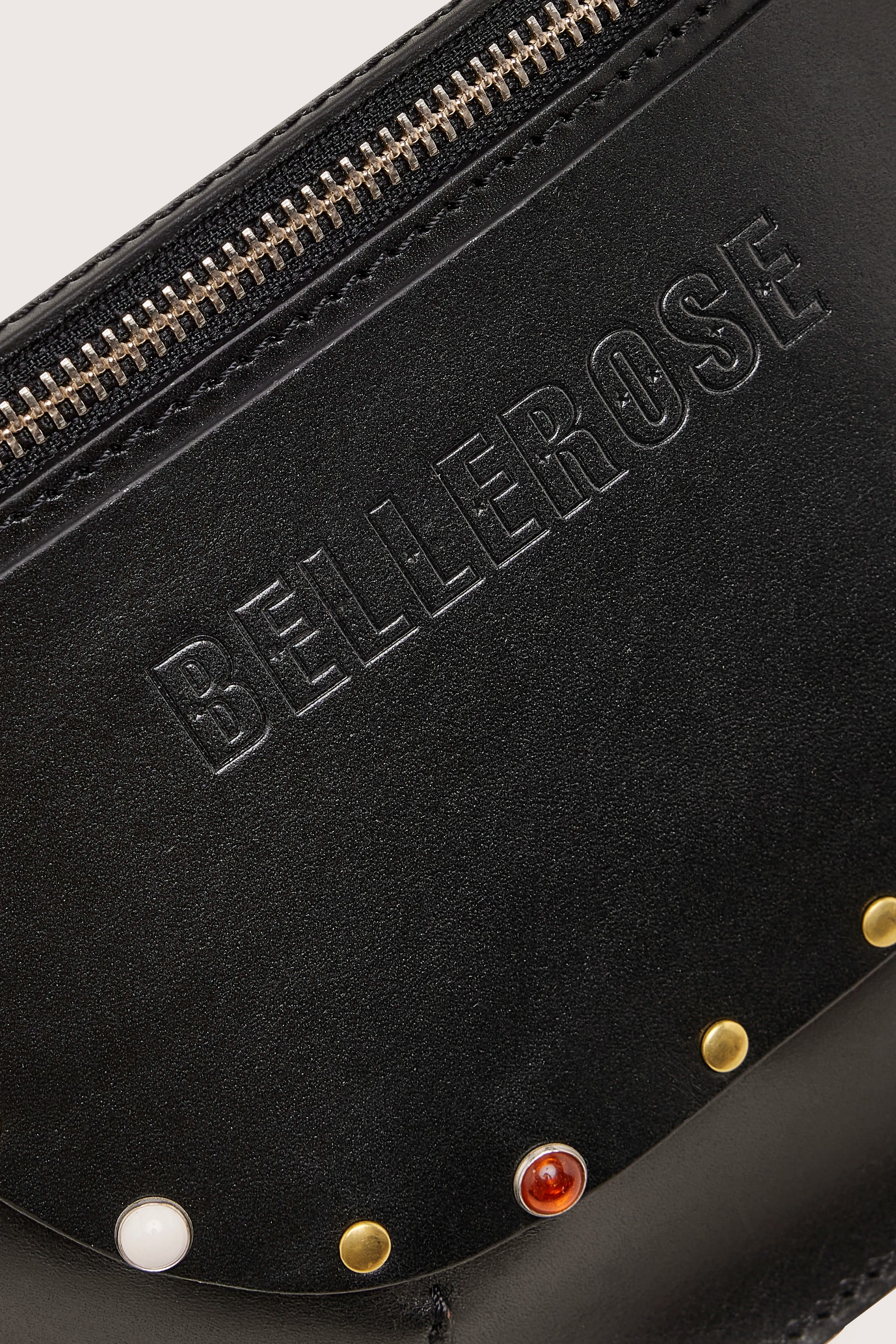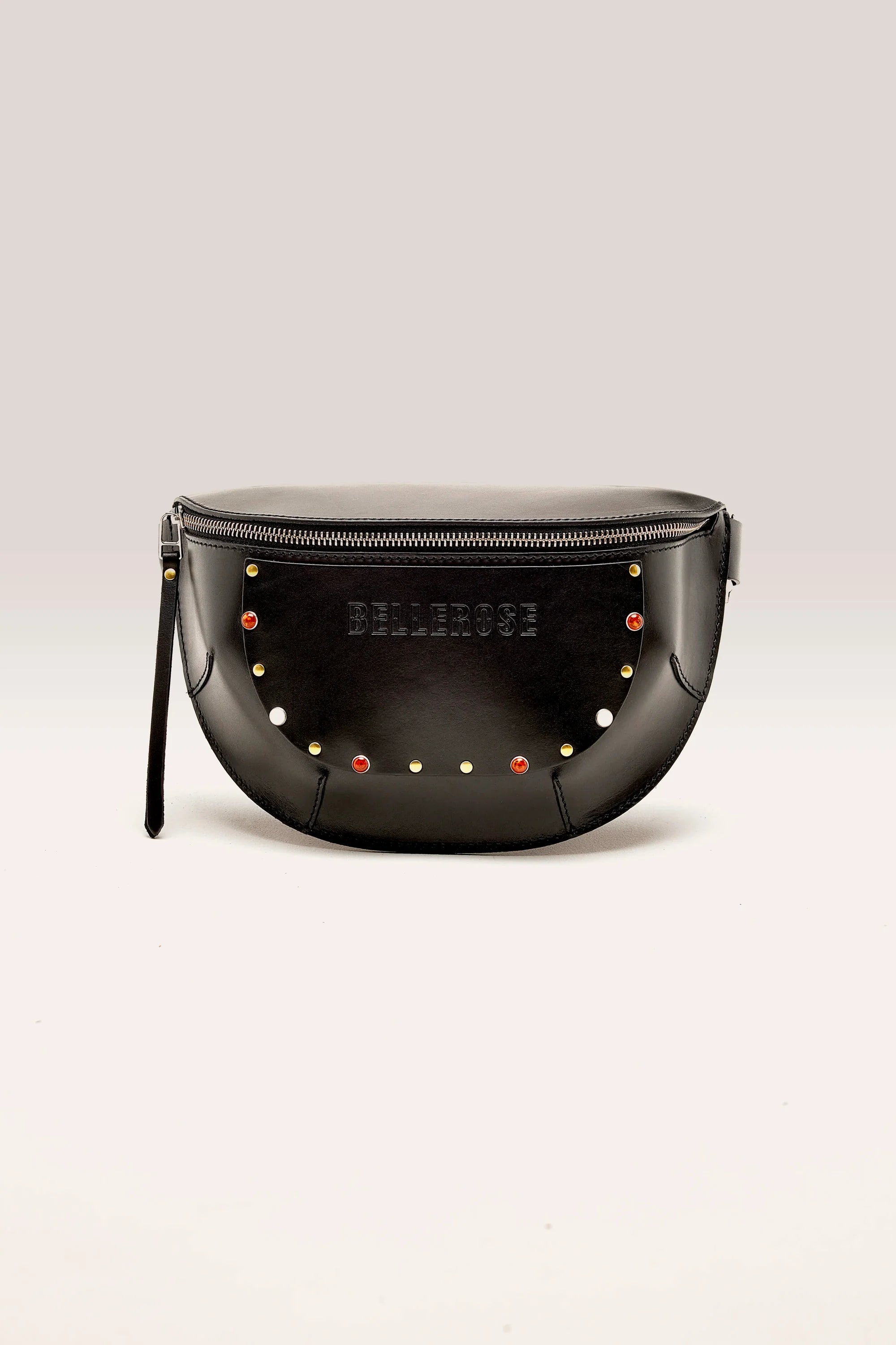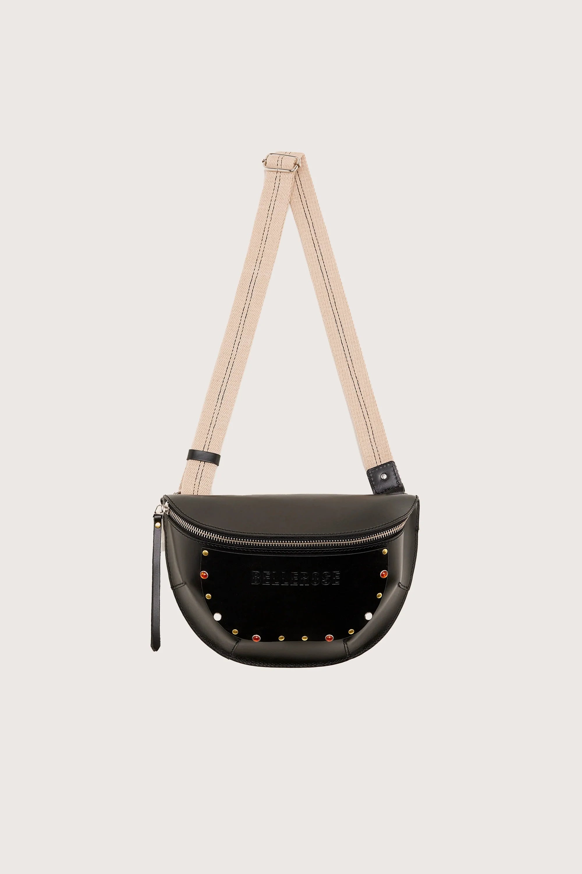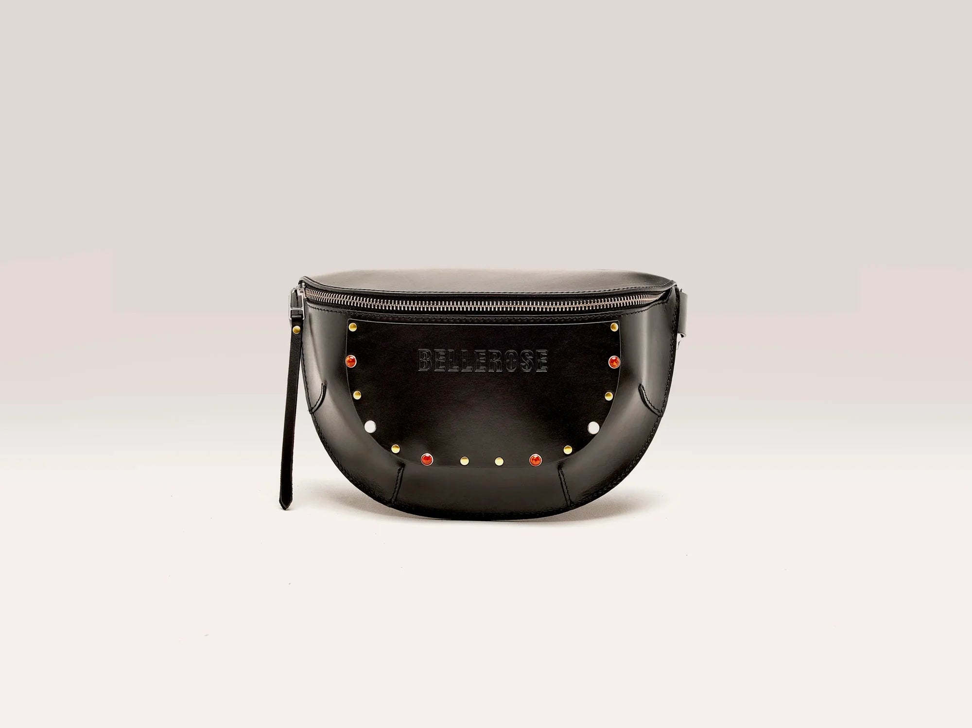 Half-moon shaped sling bag in smooth black leather with embossed Bellerose logo and stone-incrusted studs on the front pocket.