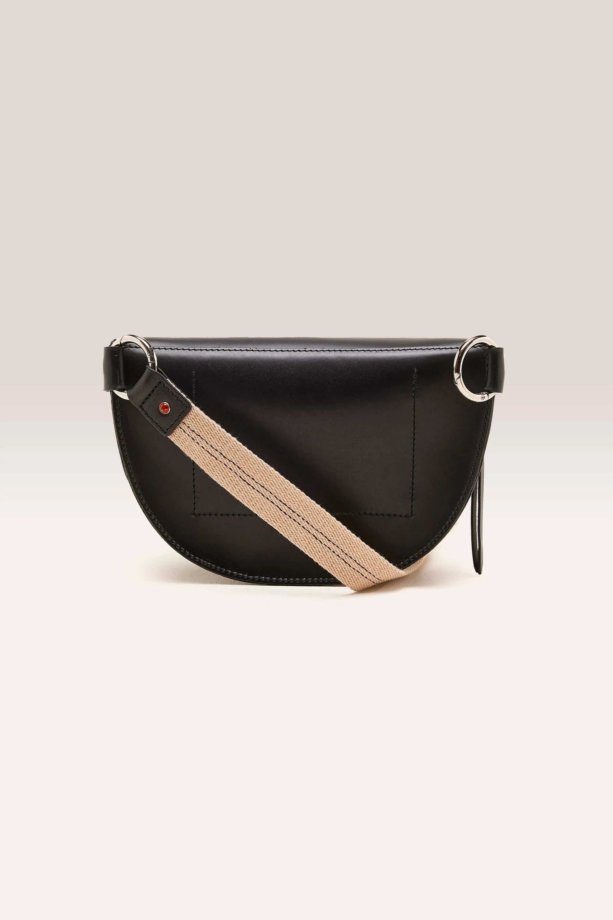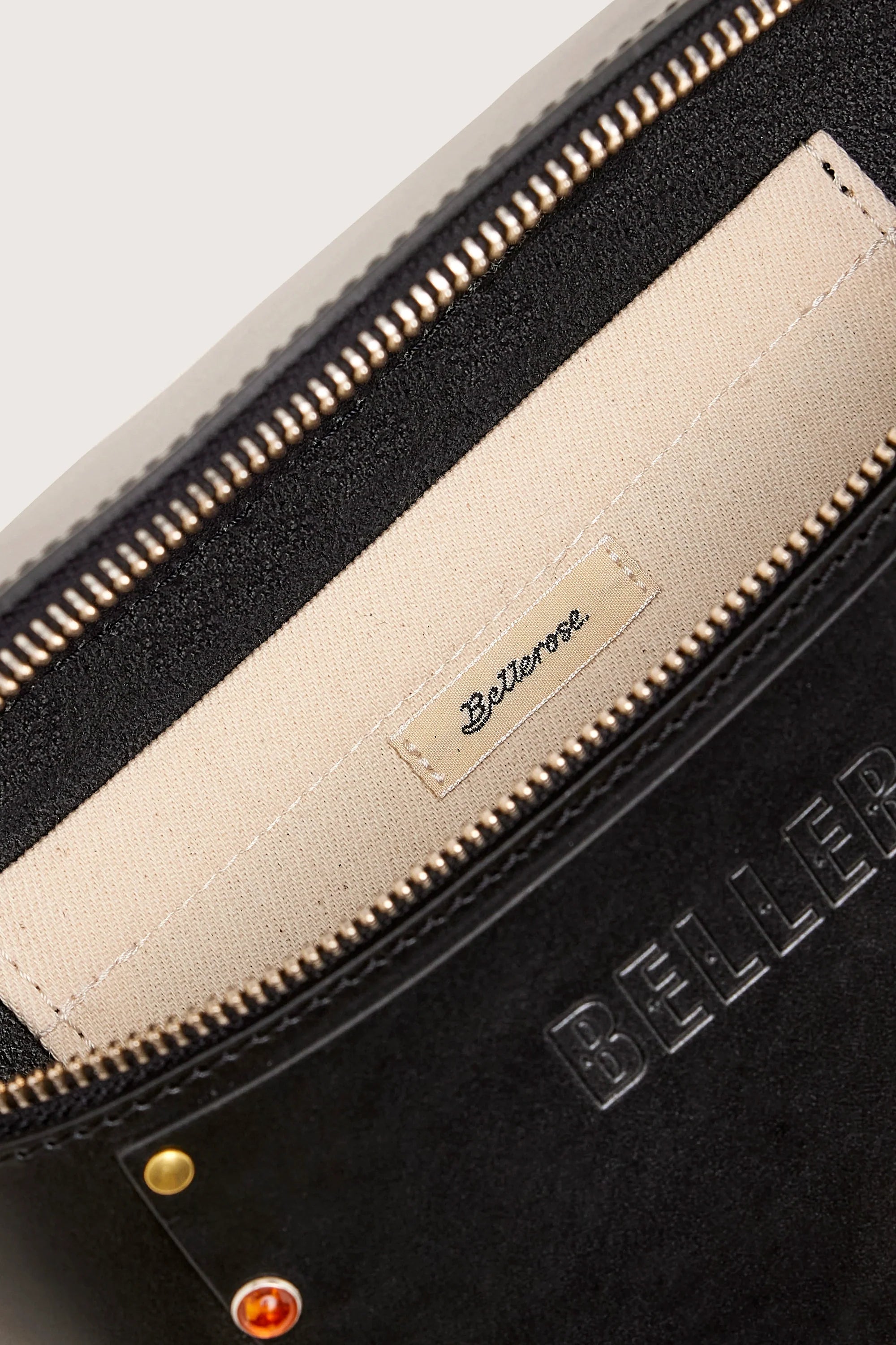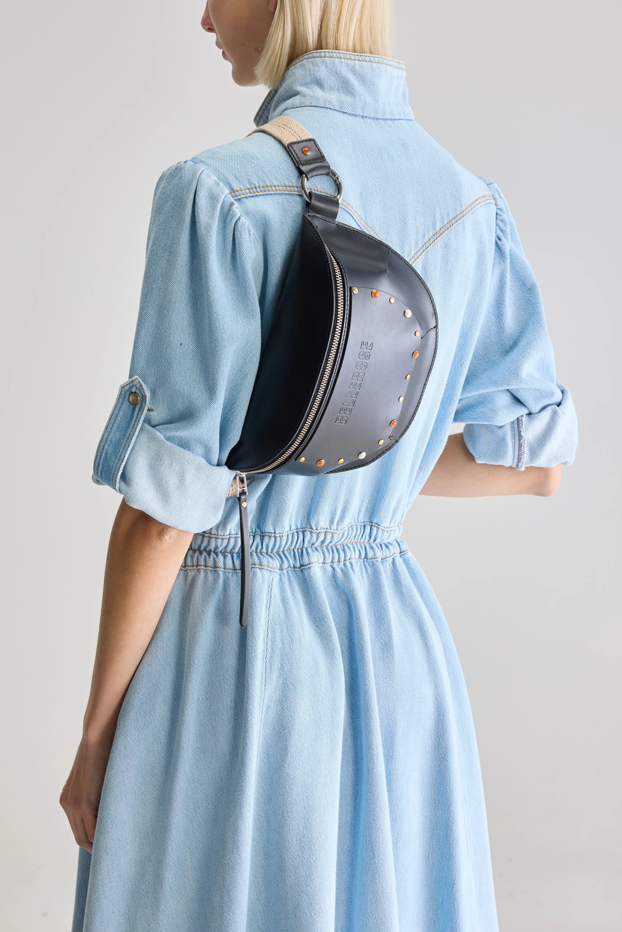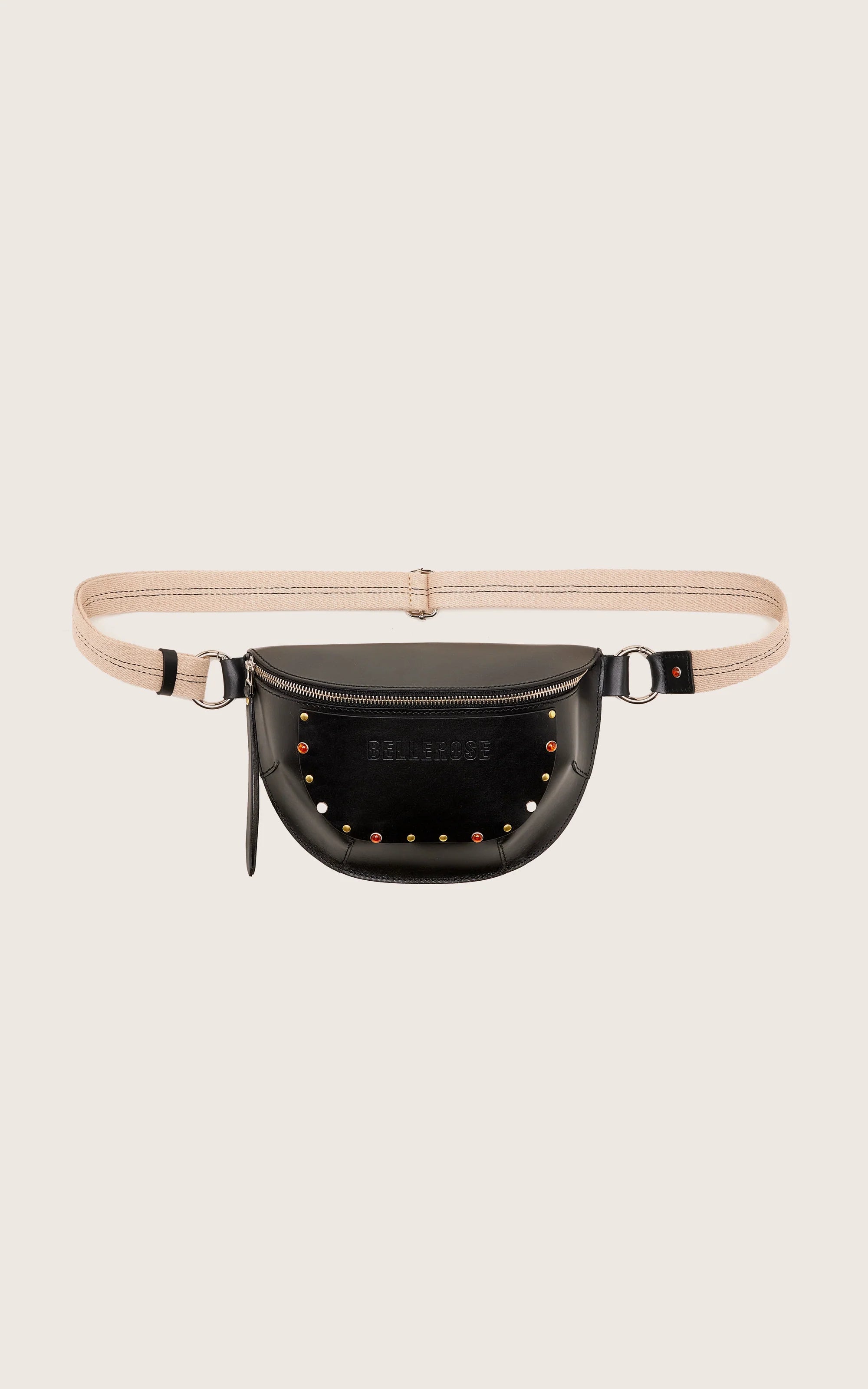 Half-moon shaped sling bag in smooth black leather with embossed Bellerose logo and stone-incrusted studs on the front pocket.