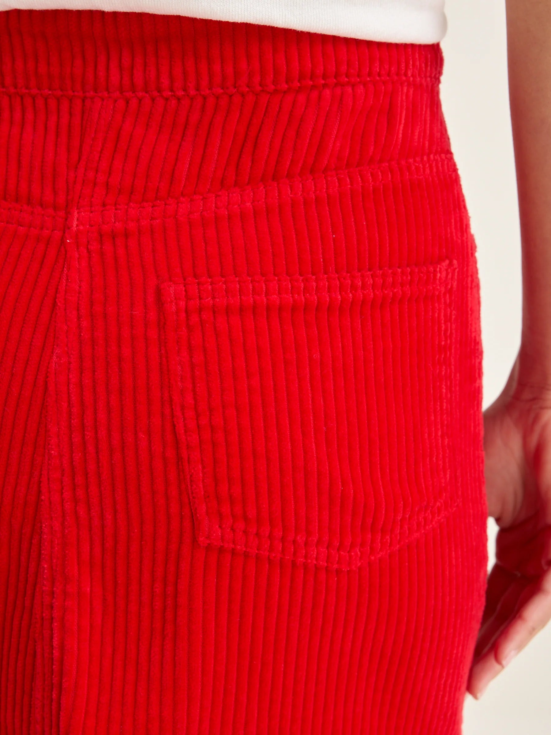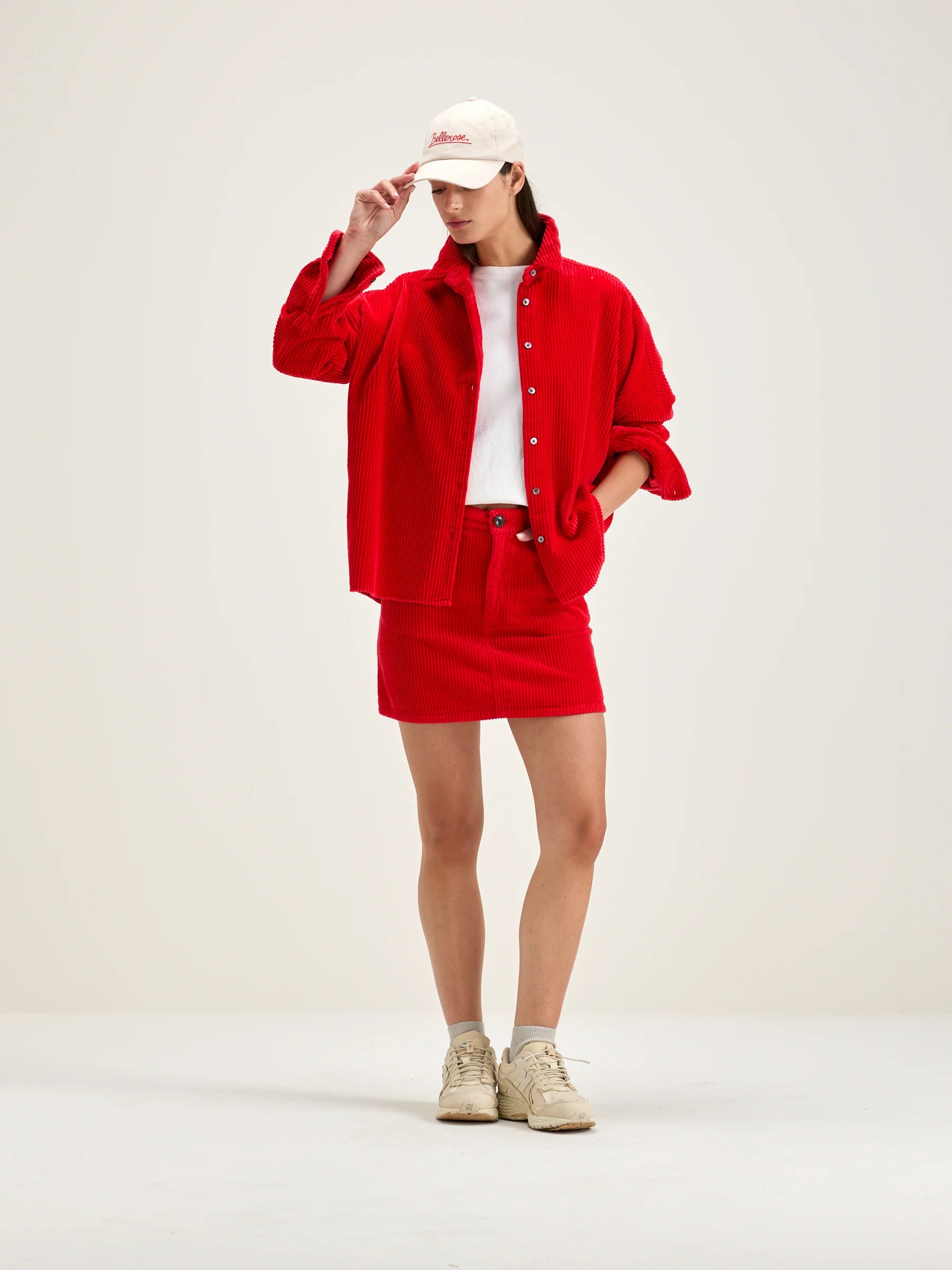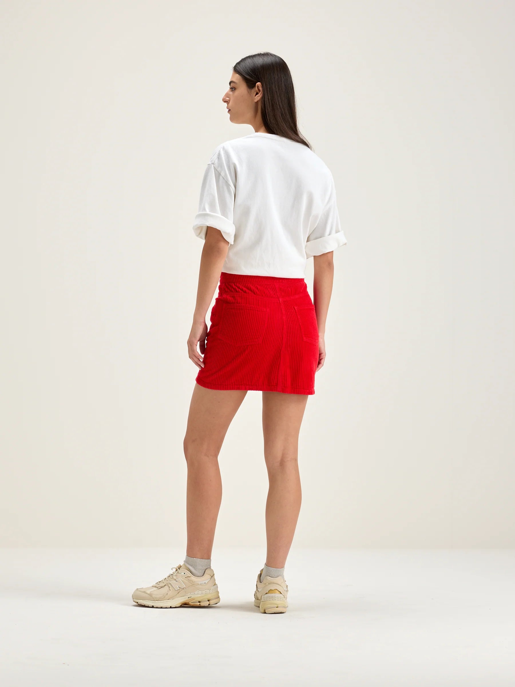 Red corduroy mini skirt with a trapeze silhouette and 5-pocket style.