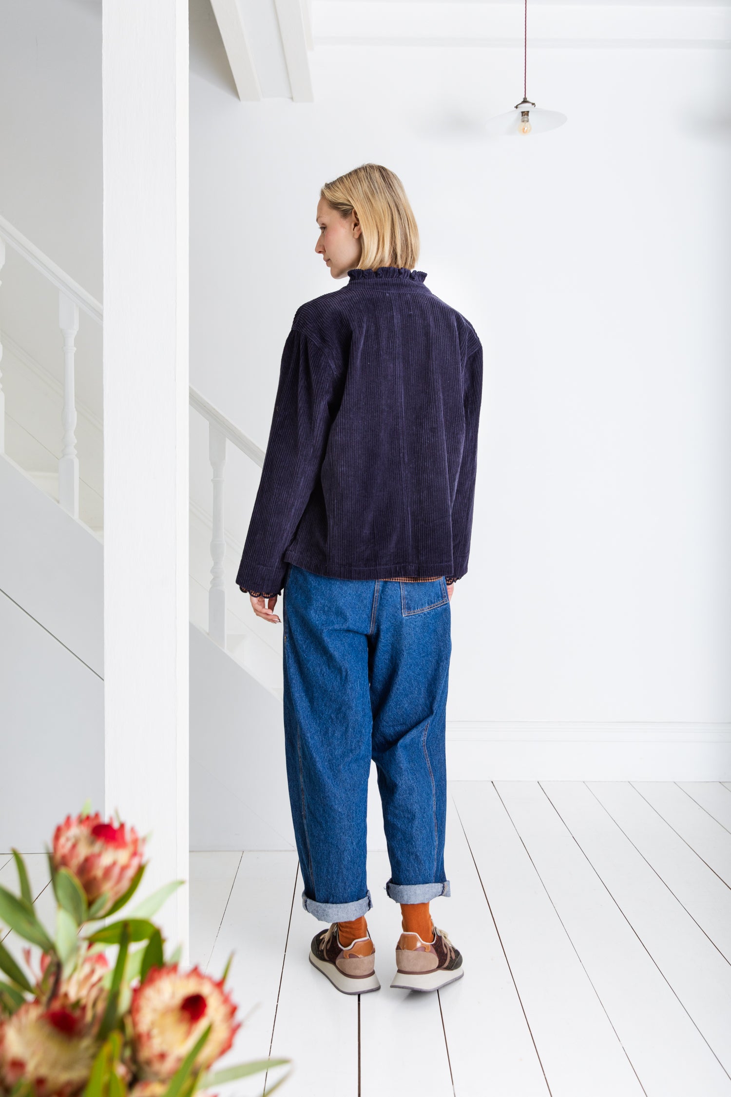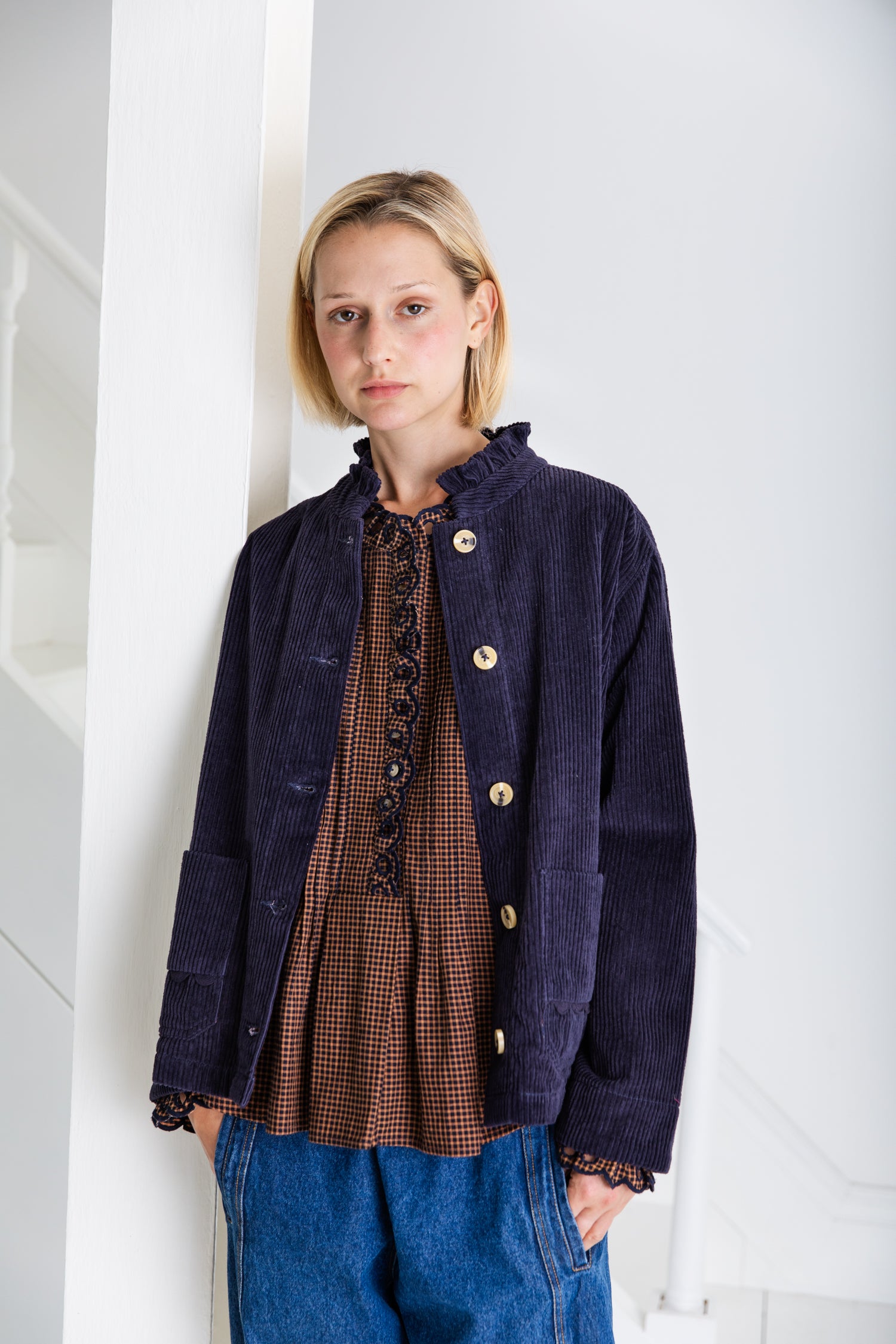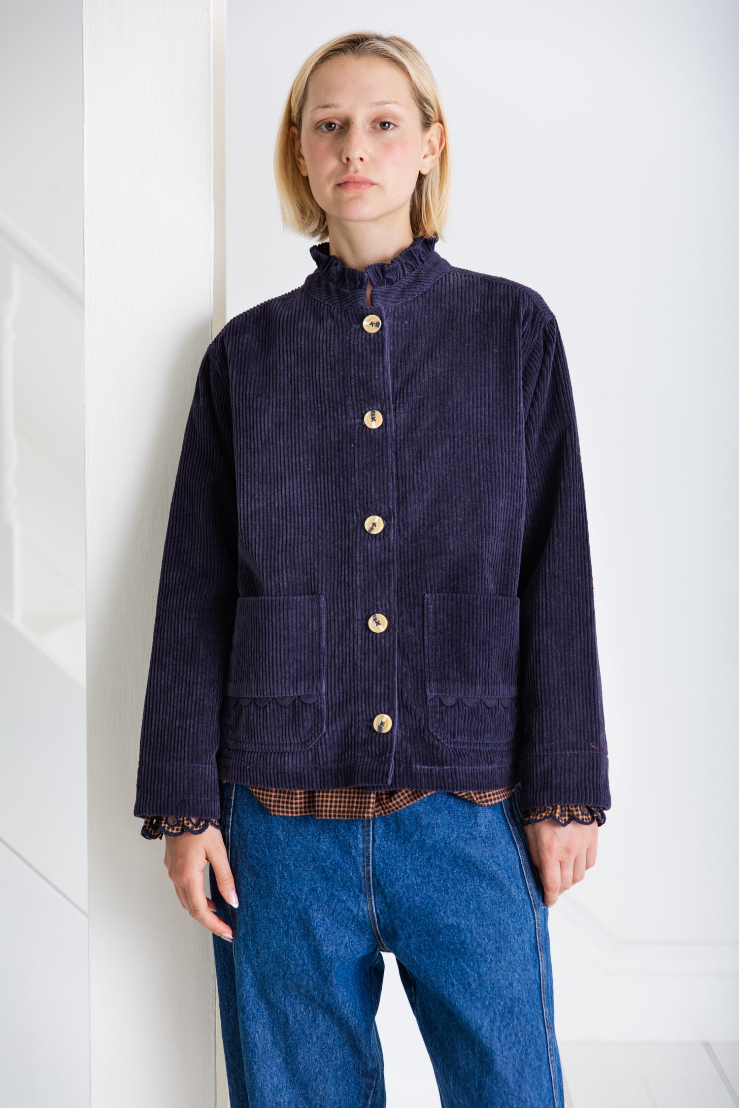 Easy + slightly oversized workwear inspired jacket in a garment washed organic jumbo-cord, with twin-needle stitching. Frill neck detail with contrast mock-horn buttons. Feminine ric-rac detail on pockets. Full length sleeves that can be worn rolled up.