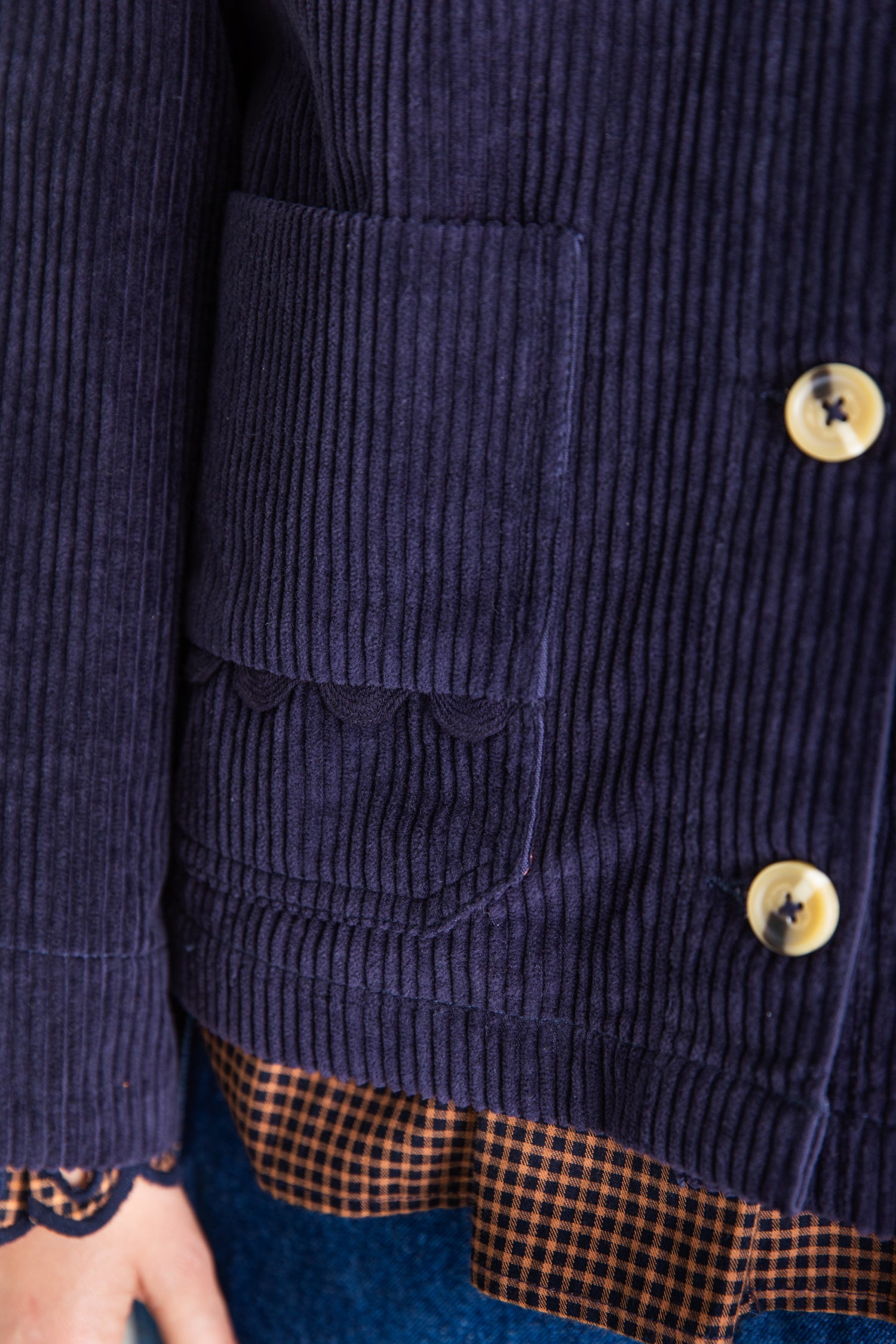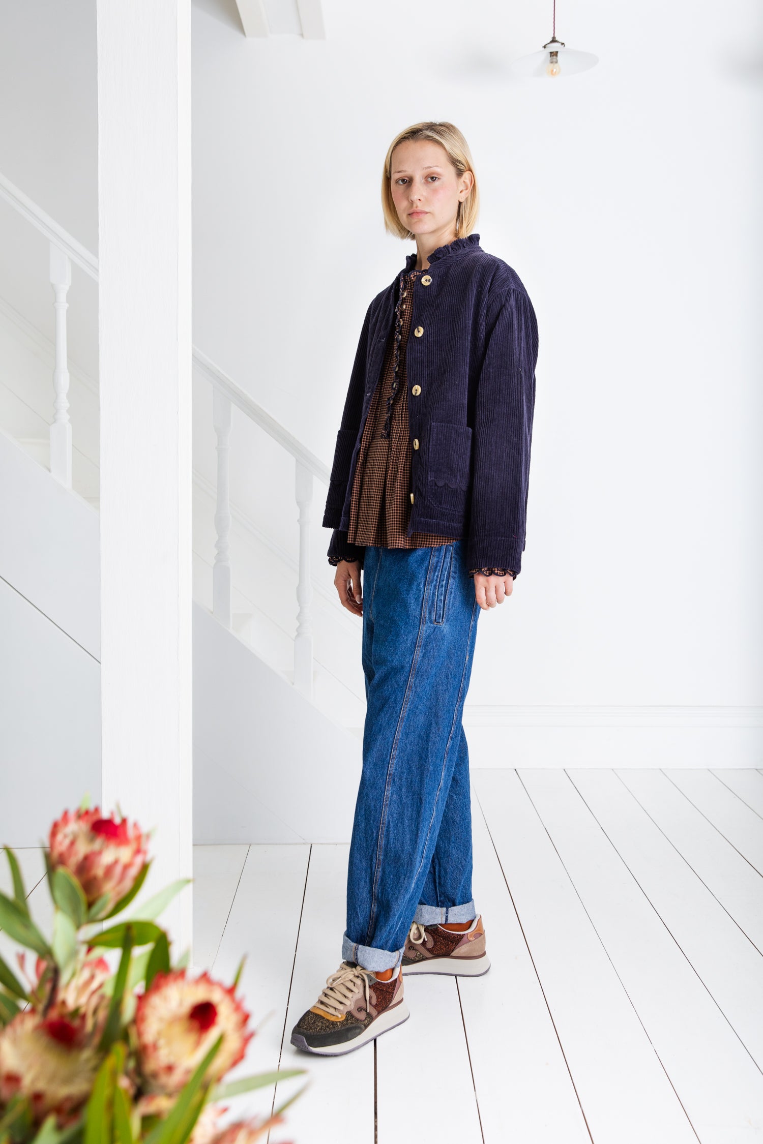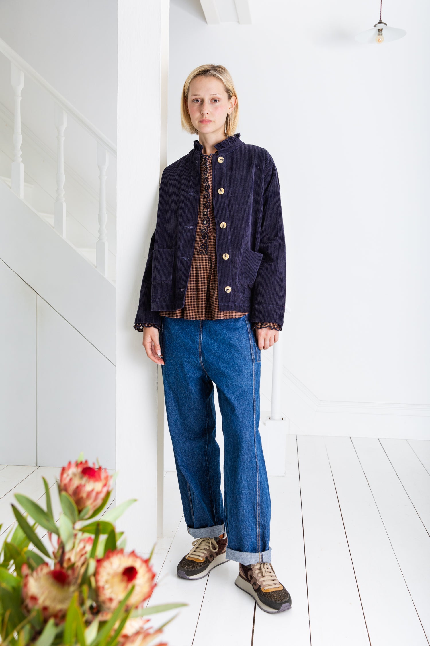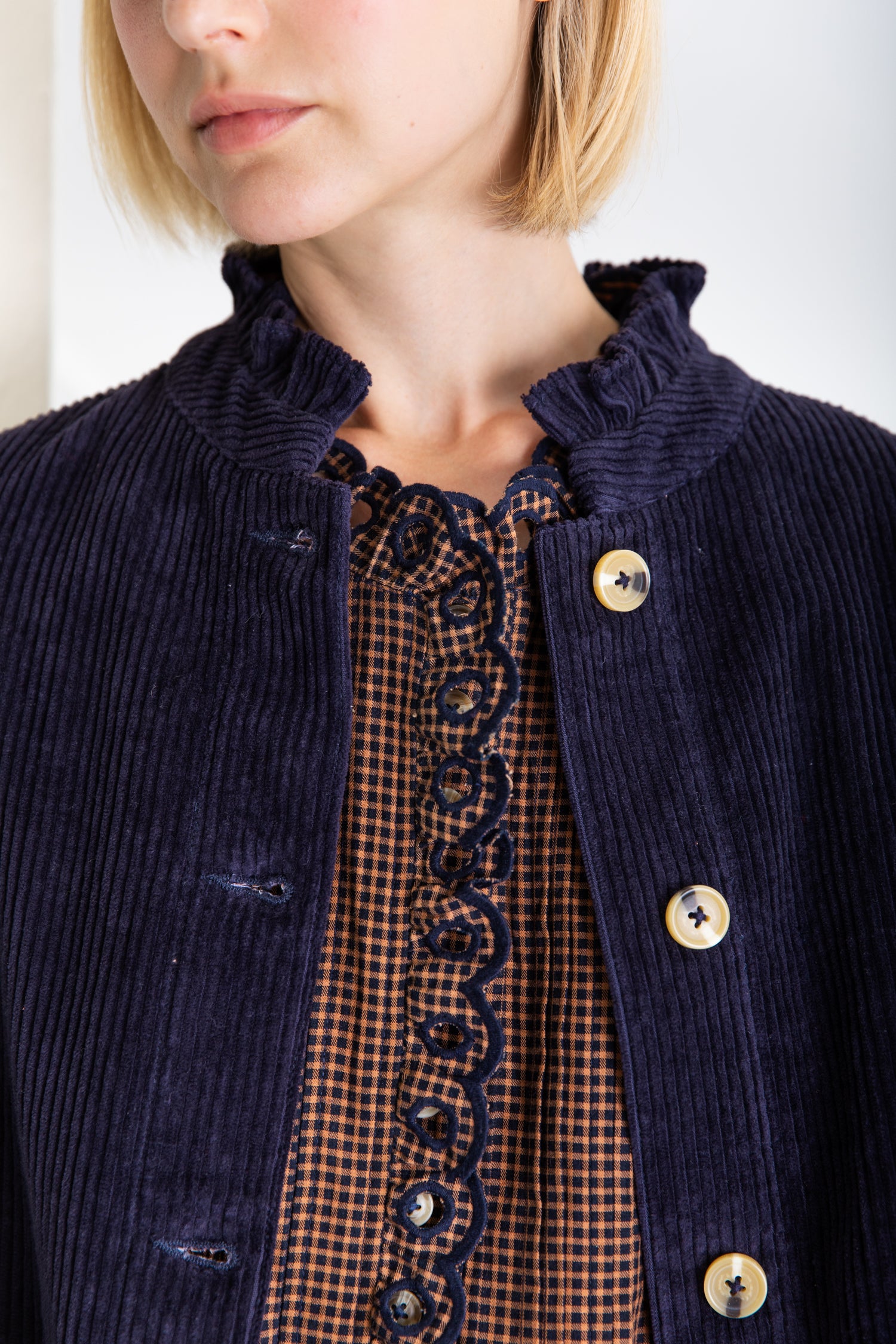 Easy + slightly oversized workwear inspired jacket in a garment washed organic jumbo-cord, with twin-needle stitching. Frill neck detail with contrast mock-horn buttons. Feminine ric-rac detail on pockets. Full length sleeves that can be worn rolled up.