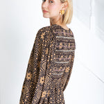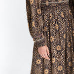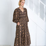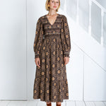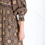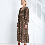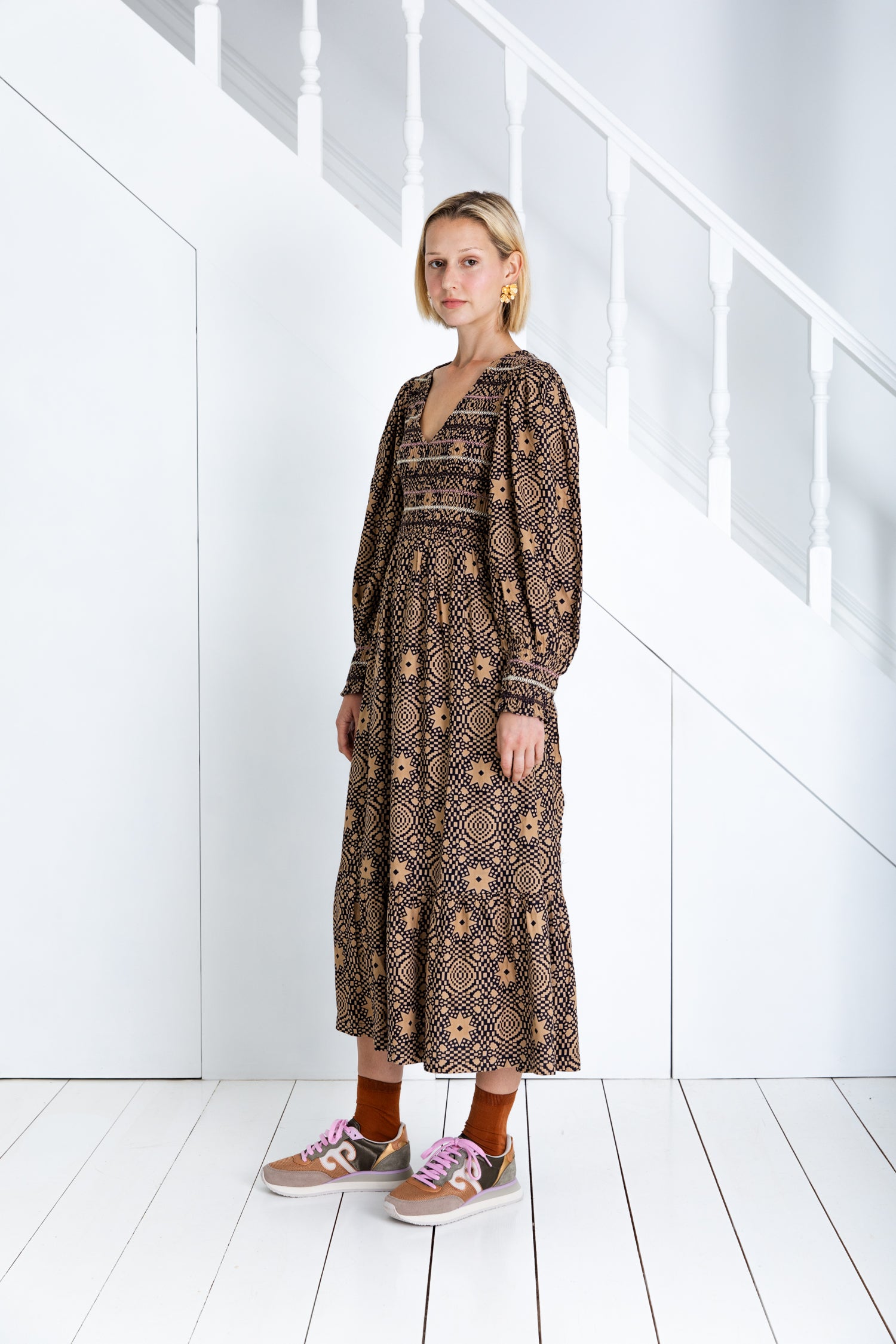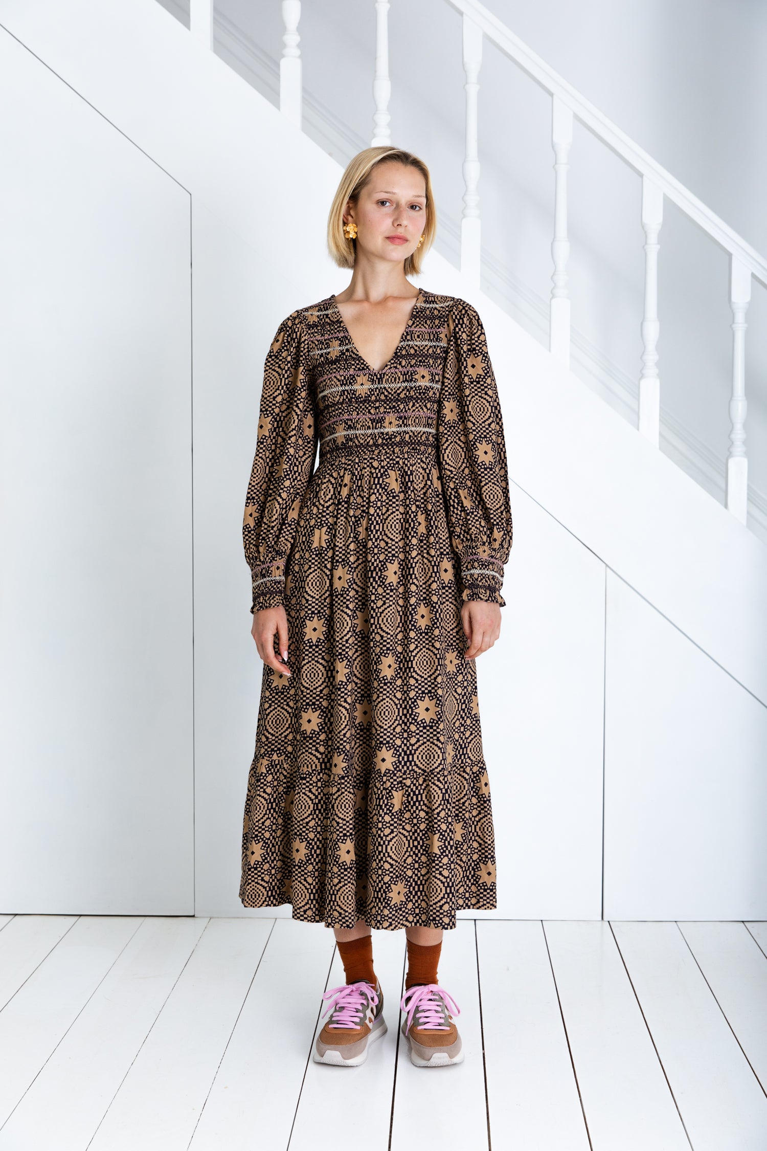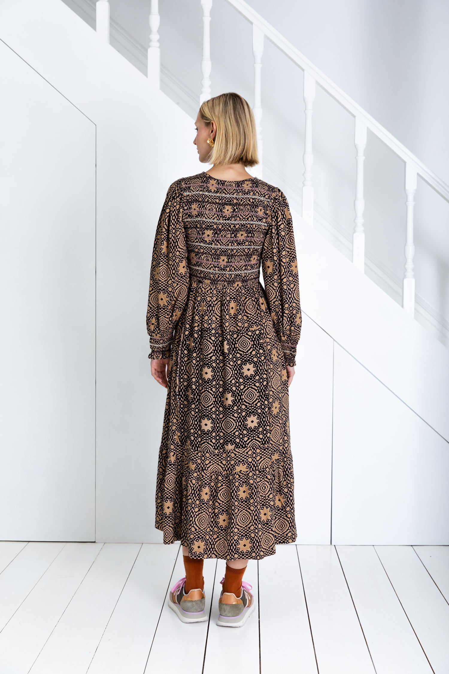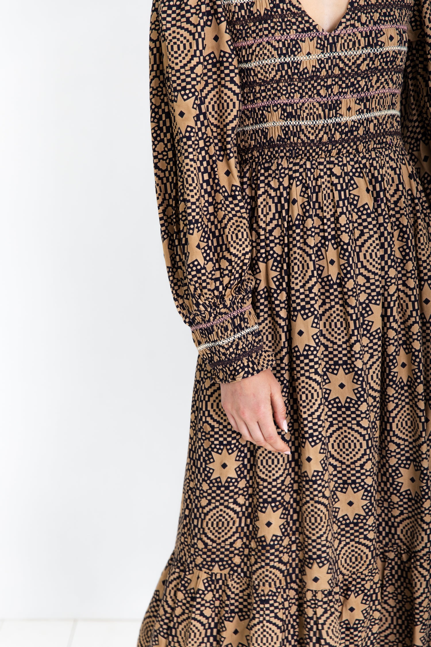 A tiered, multi-coloured smocked bodice dress in a geometric viscose twill print with flattering V-neck. The style is lined and has side seam pockets. Generous puff sleeves are full length + smocked at the cuff and look great pulled up for extra drama.