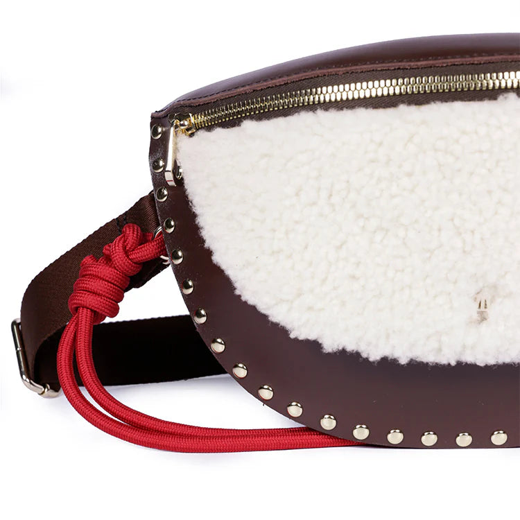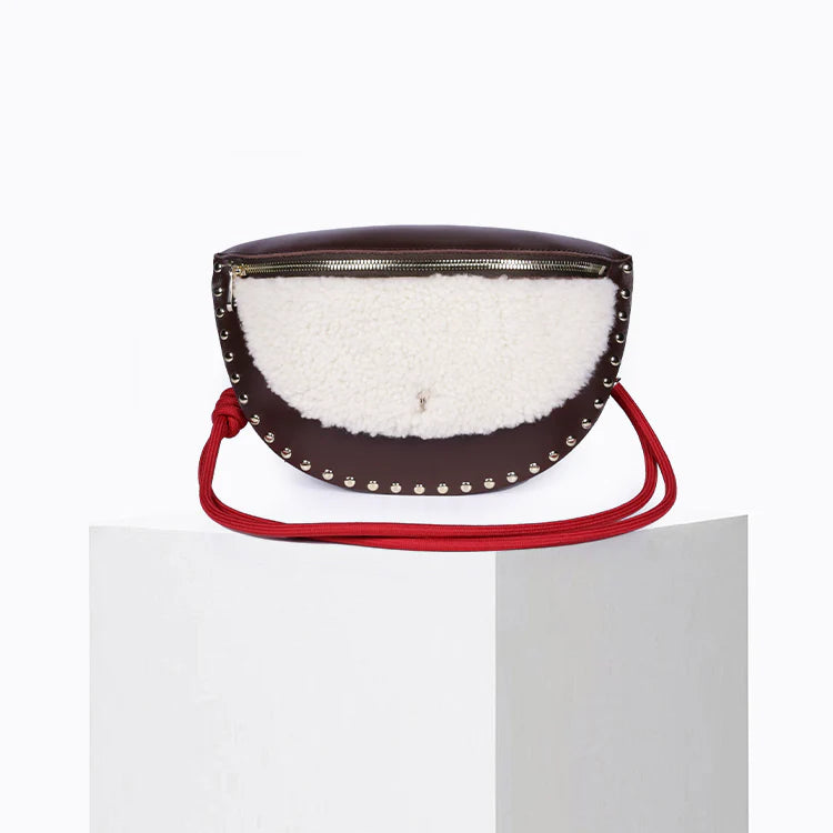 The Smile Clou Wool Choco bum bag is a cosy yet bold take on the iconic model. Crafted from chocolate-coloured cowhide, it's enhanced by a soft white wool flap, accented with studs that give it a warm yet bold feel.